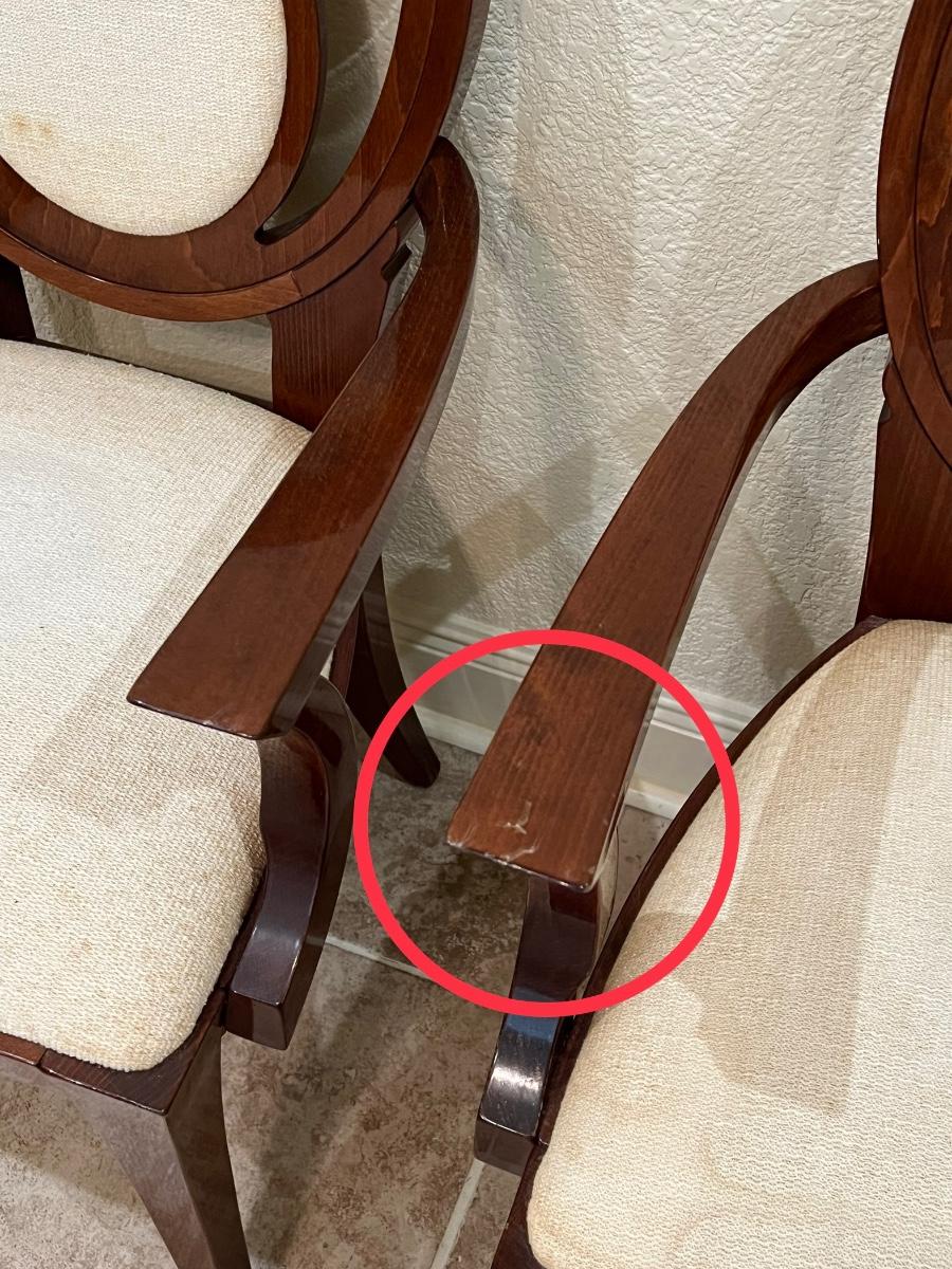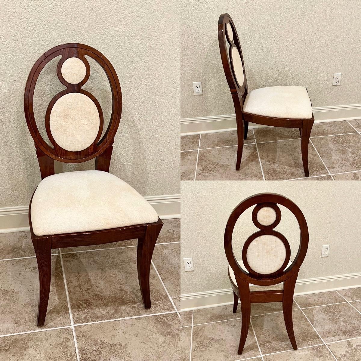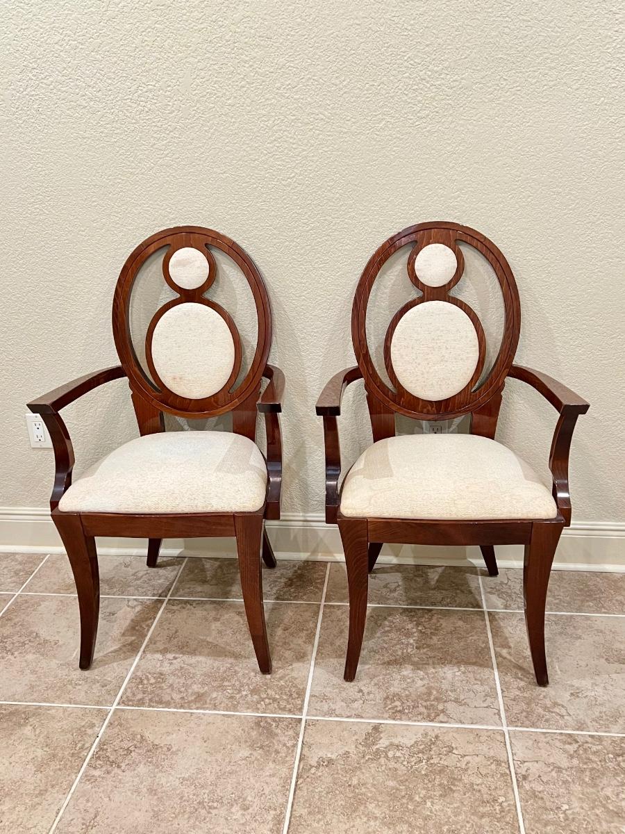 Set includes: 6 regular chairs & 2 captains chairs ~ Upholstery needs to be cleaned or totally reupholstered. They have been in storage, captains chairs have minor surface scratches see photos ~ Regular chairs = 40.75” H x 20” W x 23.5” D ~ Captains chairs = 40.75” H x 23.5” W x 23.5” D