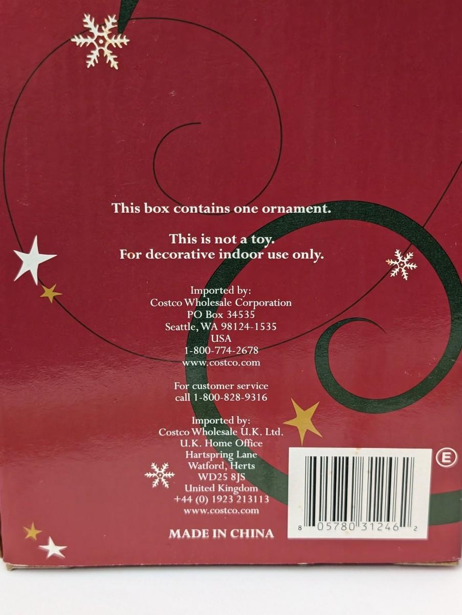 This festive ornament from Costco features a whimsical elf dressed as a sparkling Christmas tree complete with glitter accents and a candy cane. Still in its original box this collectible decoration is perfect for adding holiday cheer to your tree or gifting to a Christmas enthusiast. Designed for indoor decorative use only.