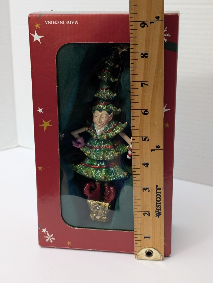 This festive ornament from Costco features a whimsical elf dressed as a sparkling Christmas tree complete with glitter accents and a candy cane. Still in its original box this collectible decoration is perfect for adding holiday cheer to your tree or gifting to a Christmas enthusiast. Designed for indoor decorative use only.