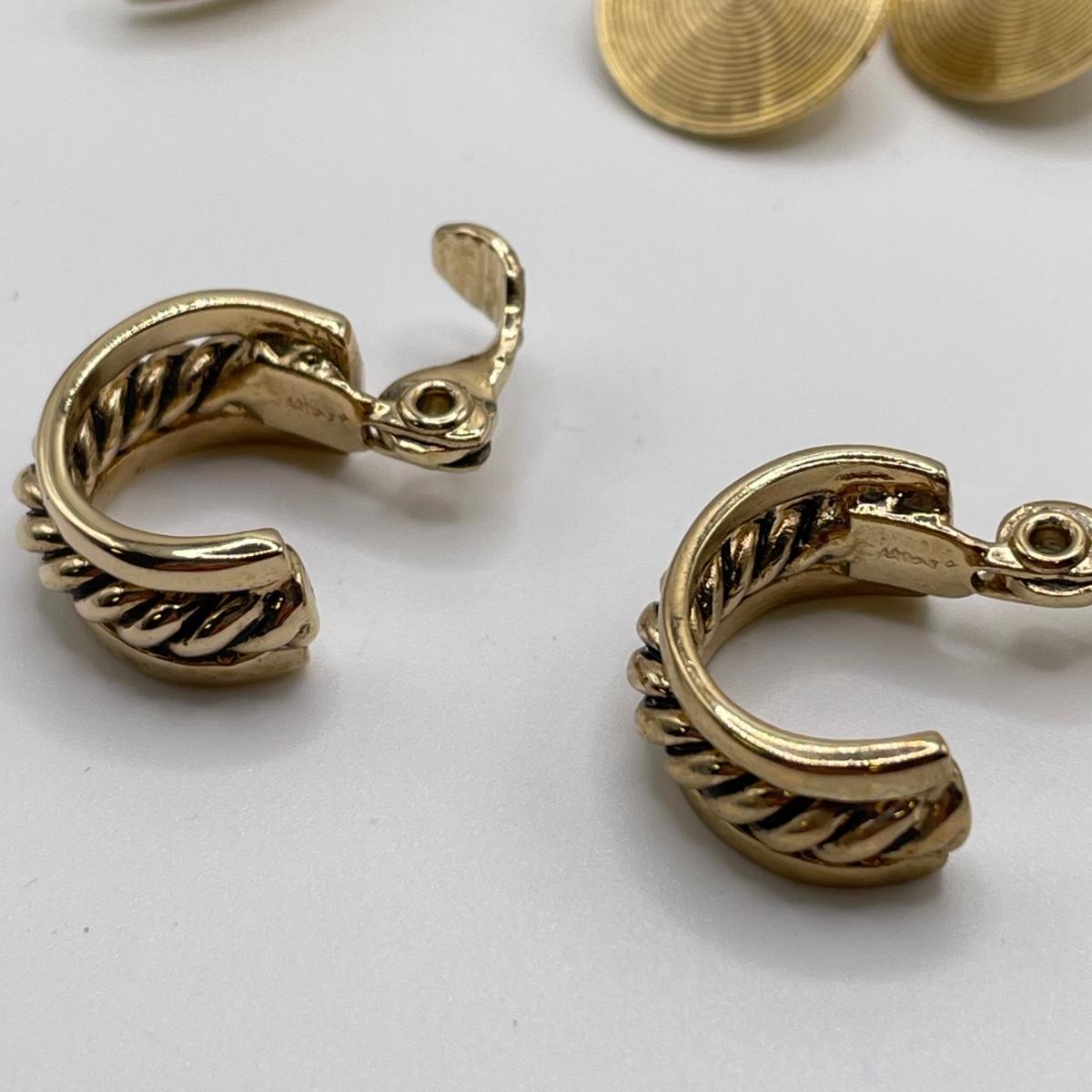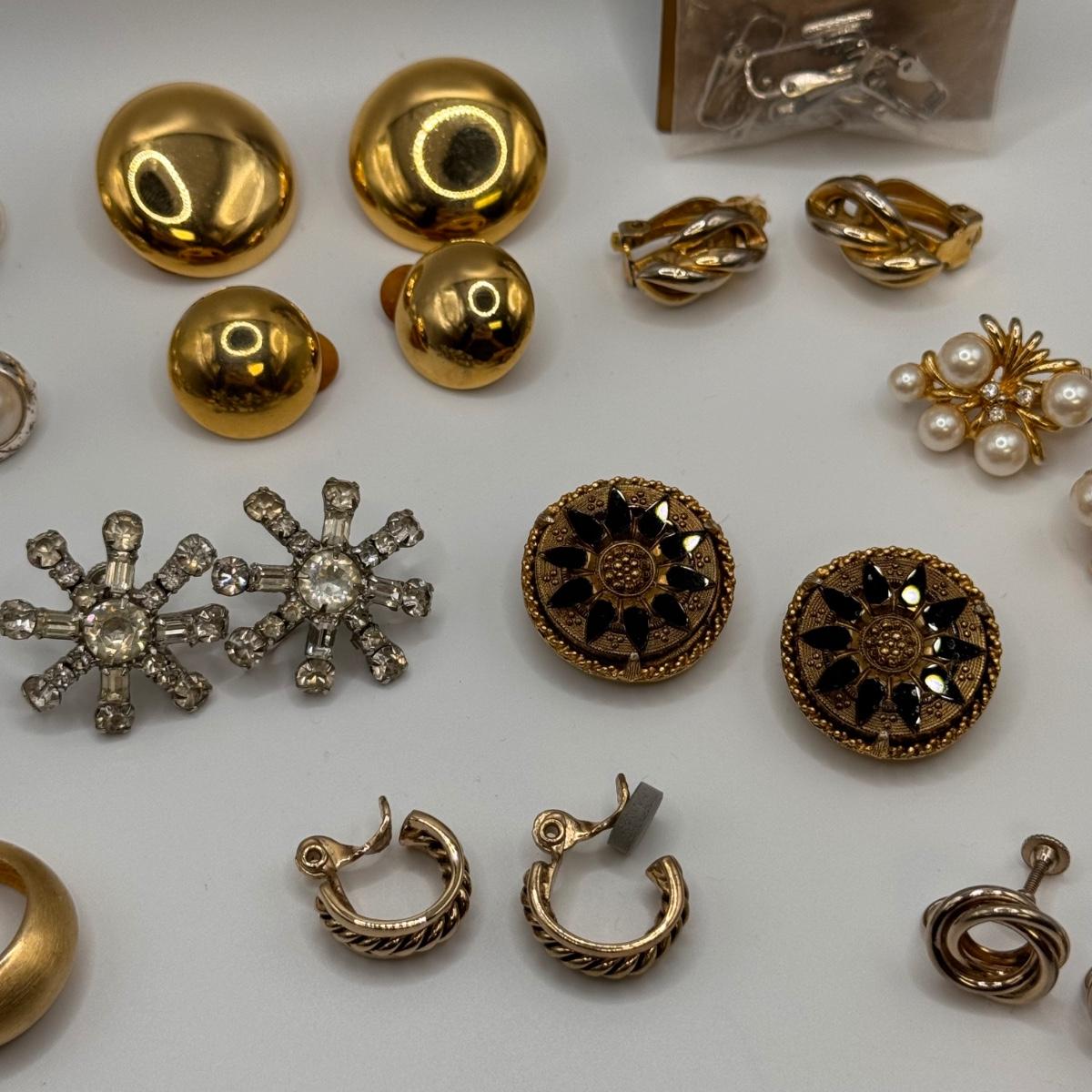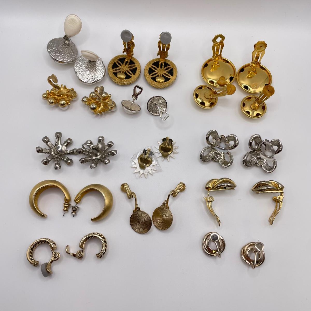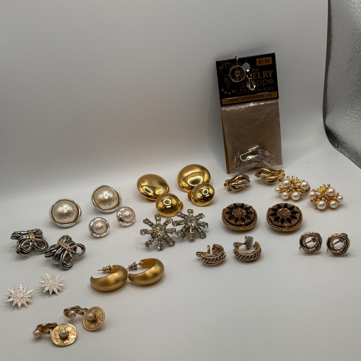 This lot includes thirteen clip-on earrings, one pair of pierced earrings, and a 4-pack of clip-on converters. One pair of earrings had its back fall off, but seems it can be easily repaired with glue - see picture included. All but one pair appears to be unmarked, the one marked pair is shown in photos.