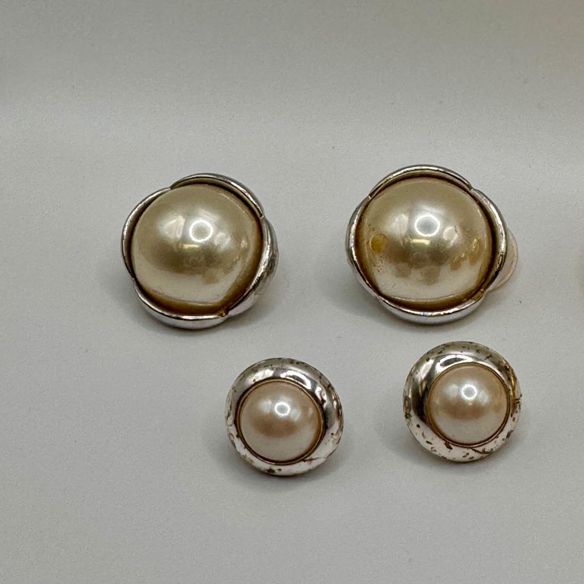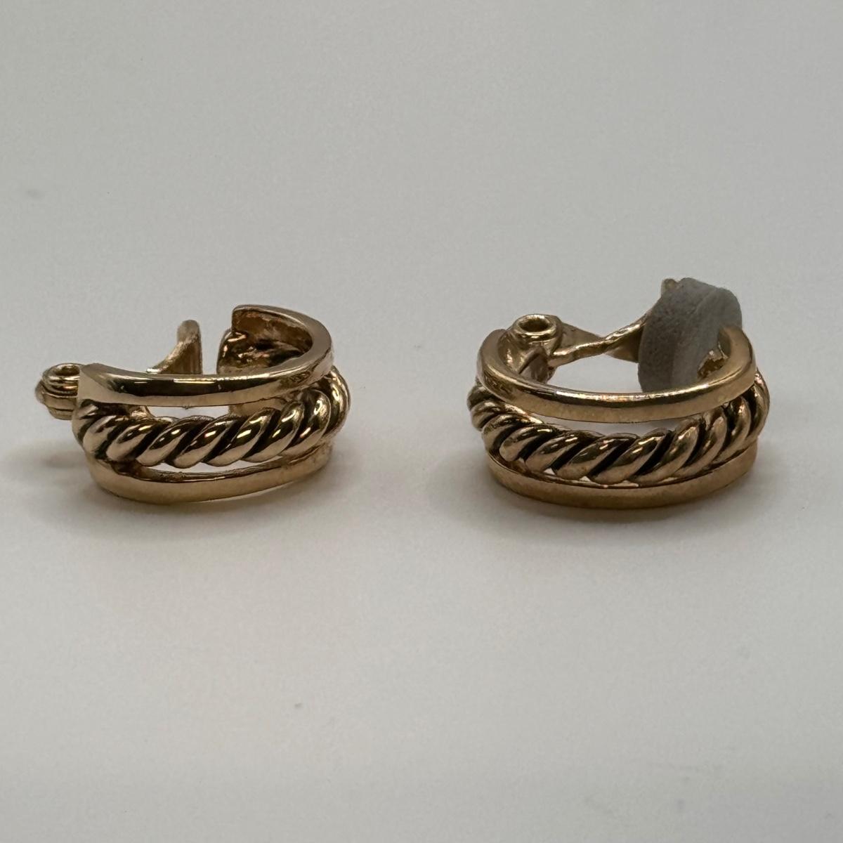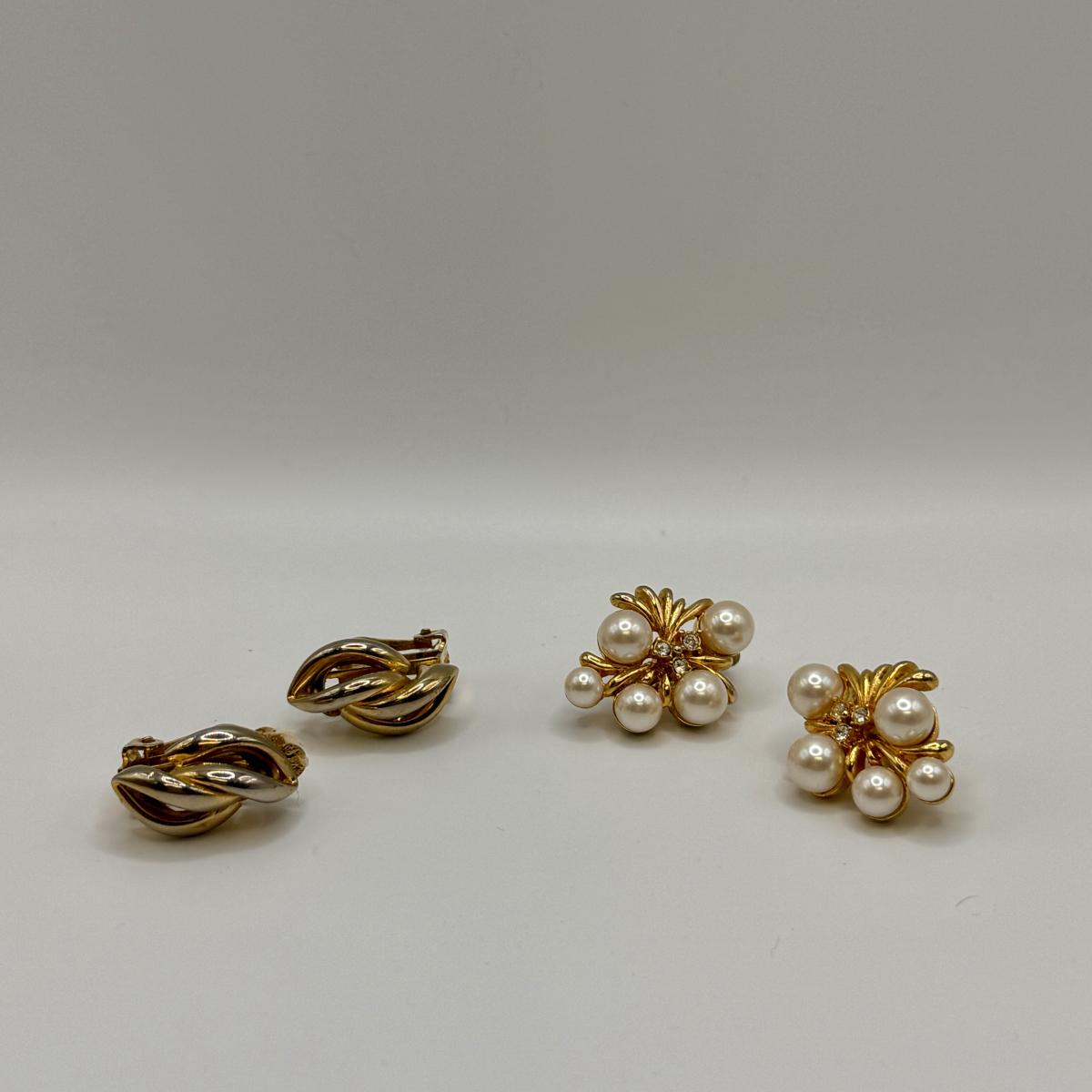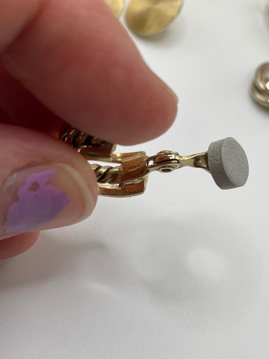 This lot includes thirteen clip-on earrings, one pair of pierced earrings, and a 4-pack of clip-on converters. One pair of earrings had its back fall off, but seems it can be easily repaired with glue - see picture included. All but one pair appears to be unmarked, the one marked pair is shown in photos.