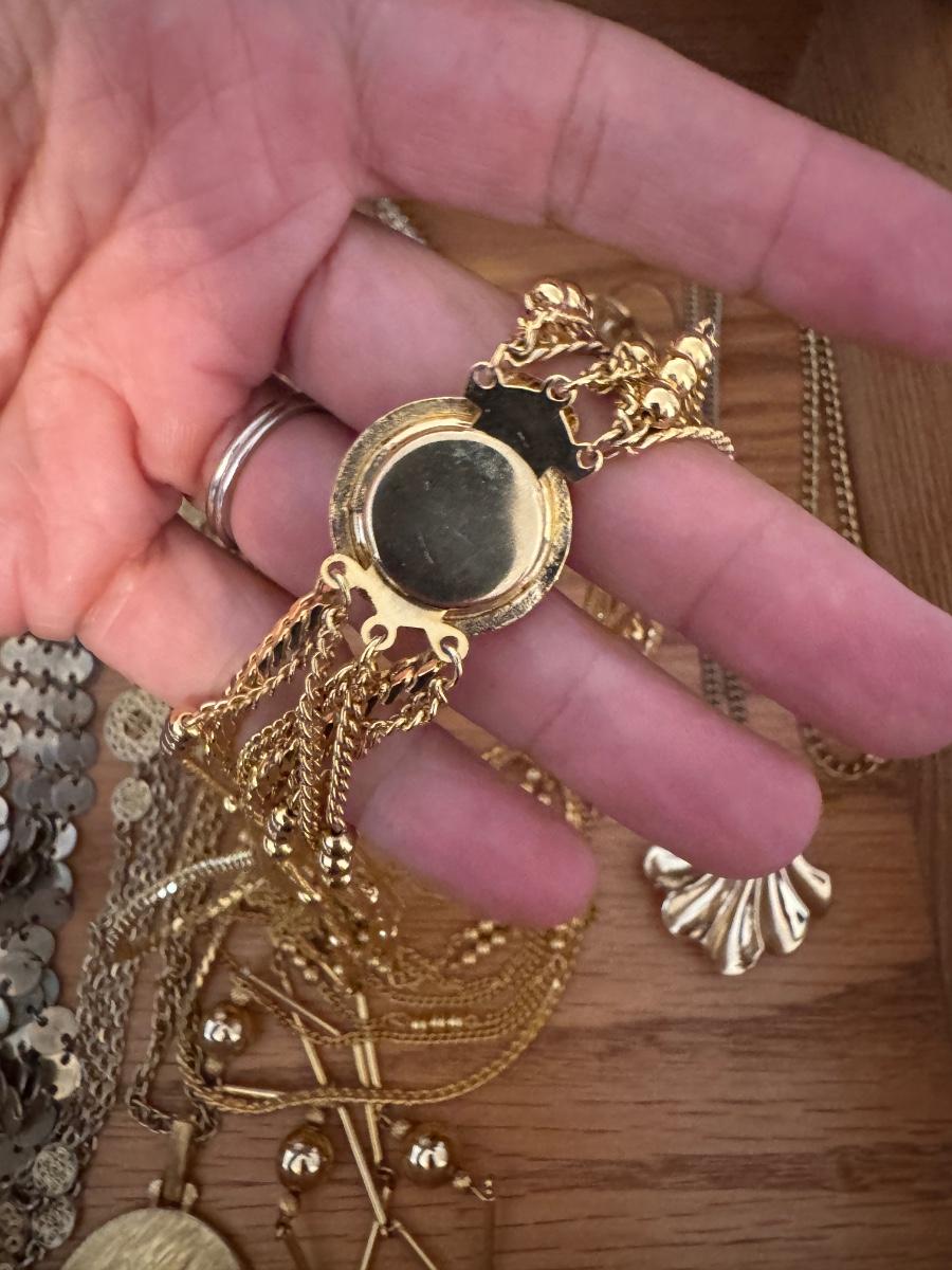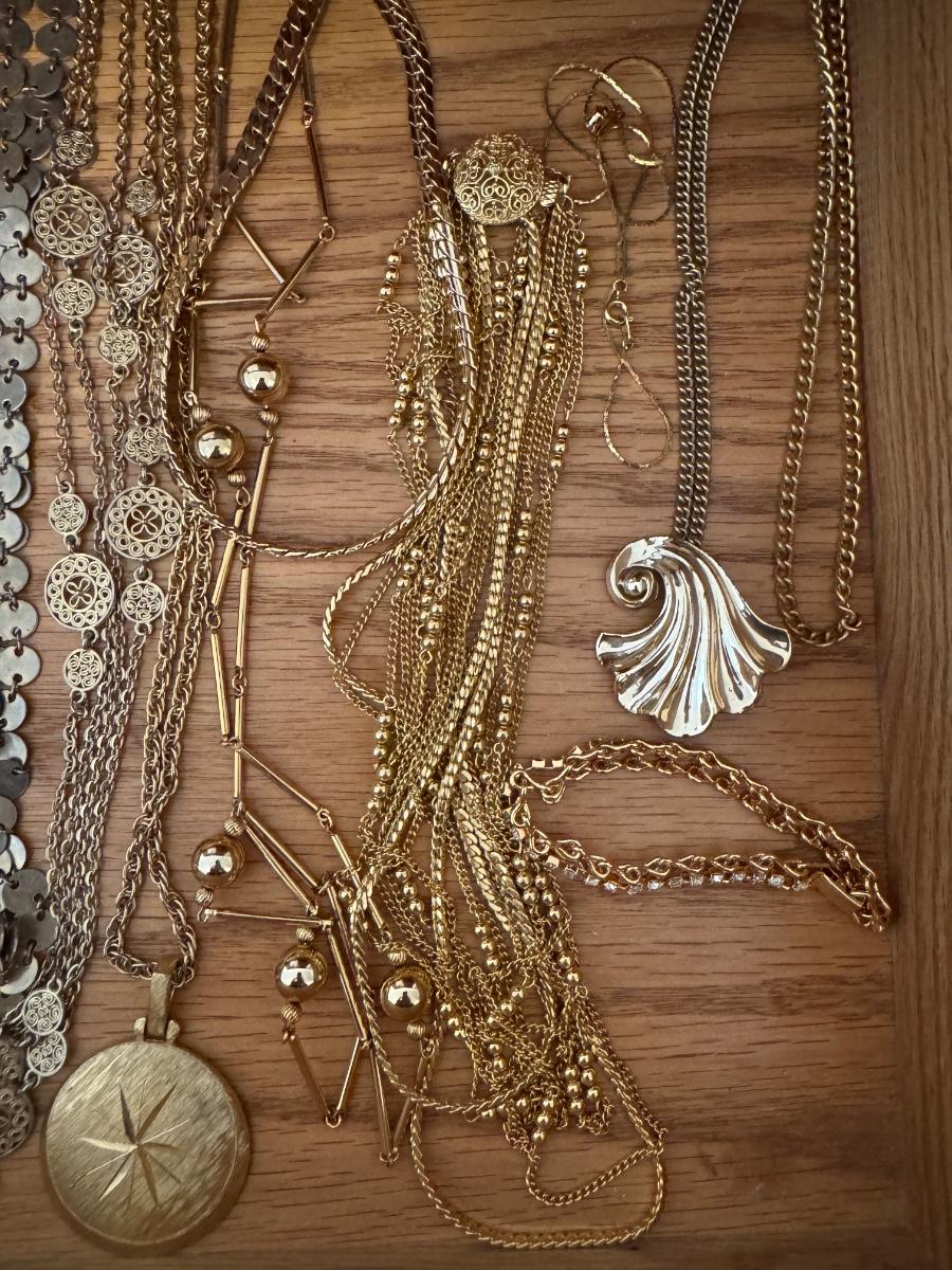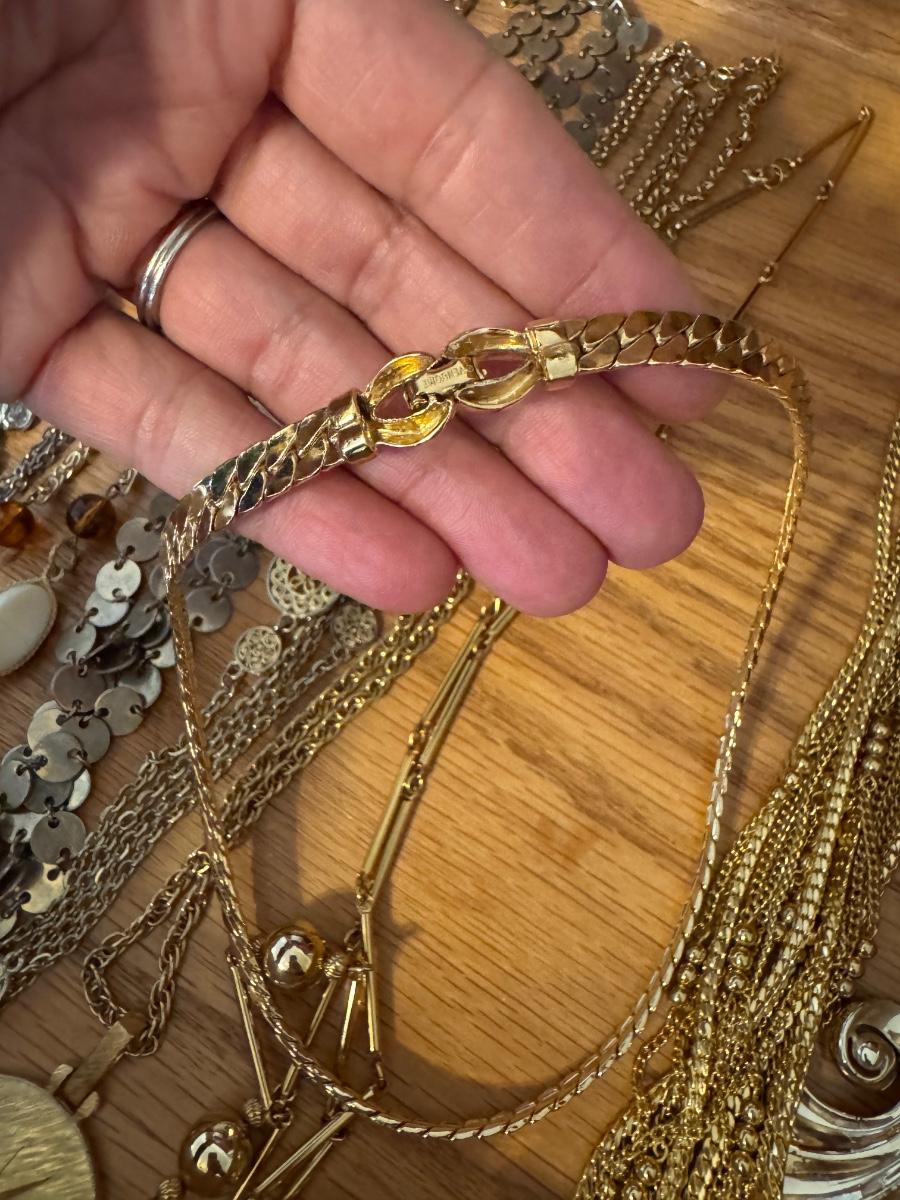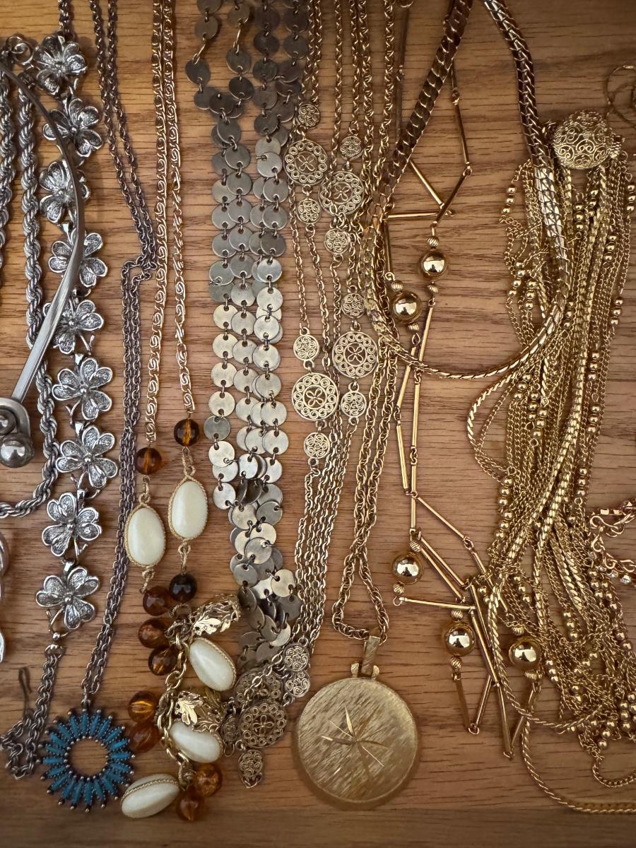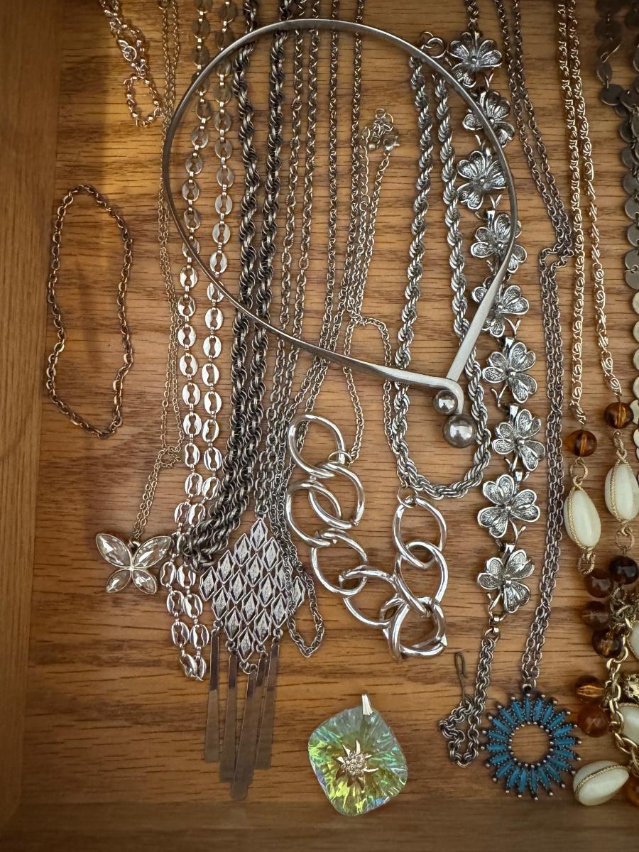 Large lot of gold and silver necklaces. Also includes three bracelets, three rings and a few pendants. There is one pair of earrings. The clasp on the faux diamond pendant gold necklace sticks open. There is a box with a silver shark tooth that is from Avon. No KT gold or sterling marks were found and the diamonds did not test as real. Shipping available