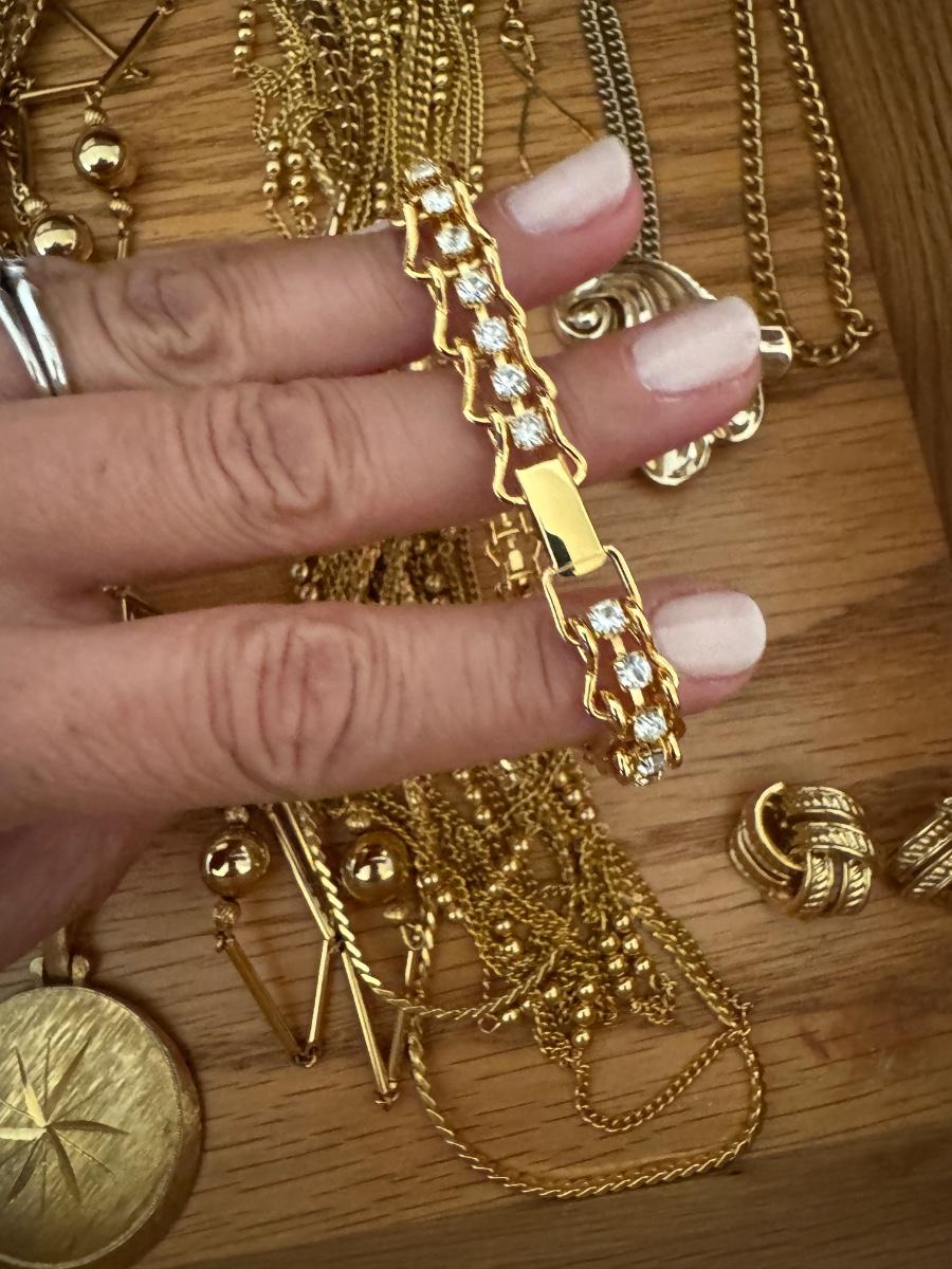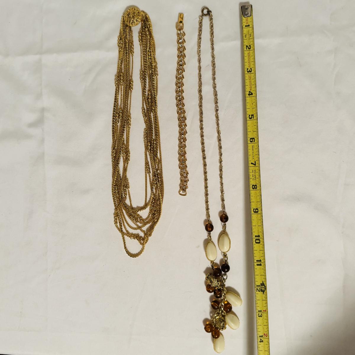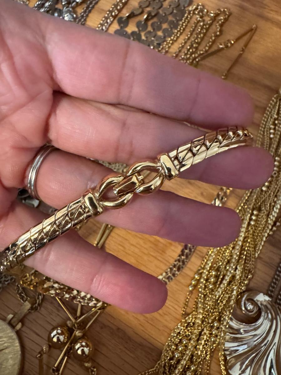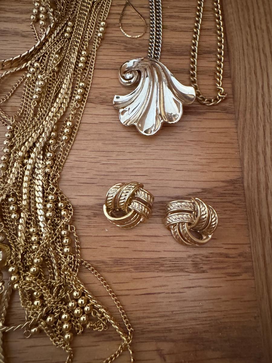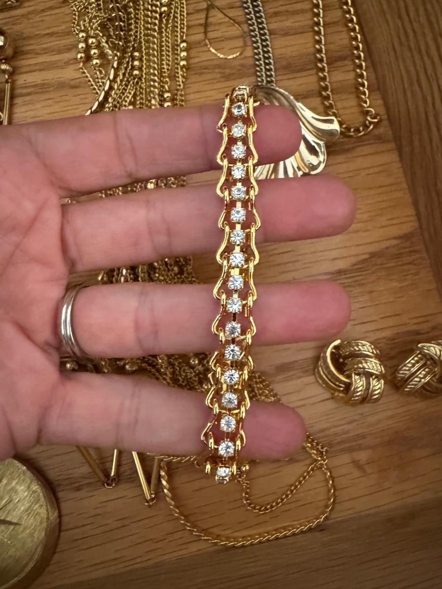 Large lot of gold and silver necklaces. Also includes three bracelets, three rings and a few pendants. There is one pair of earrings. The clasp on the faux diamond pendant gold necklace sticks open. There is a box with a silver shark tooth that is from Avon. No KT gold or sterling marks were found and the diamonds did not test as real. Shipping available