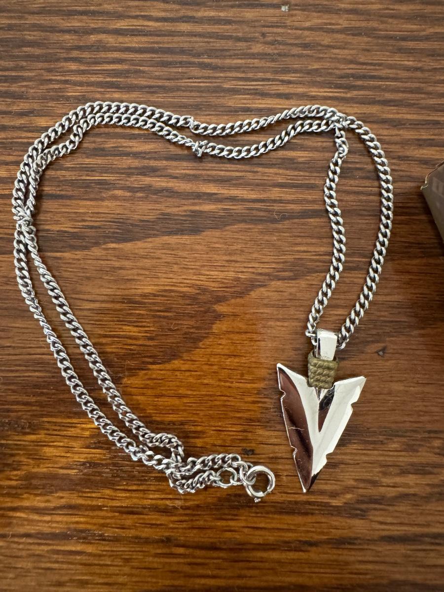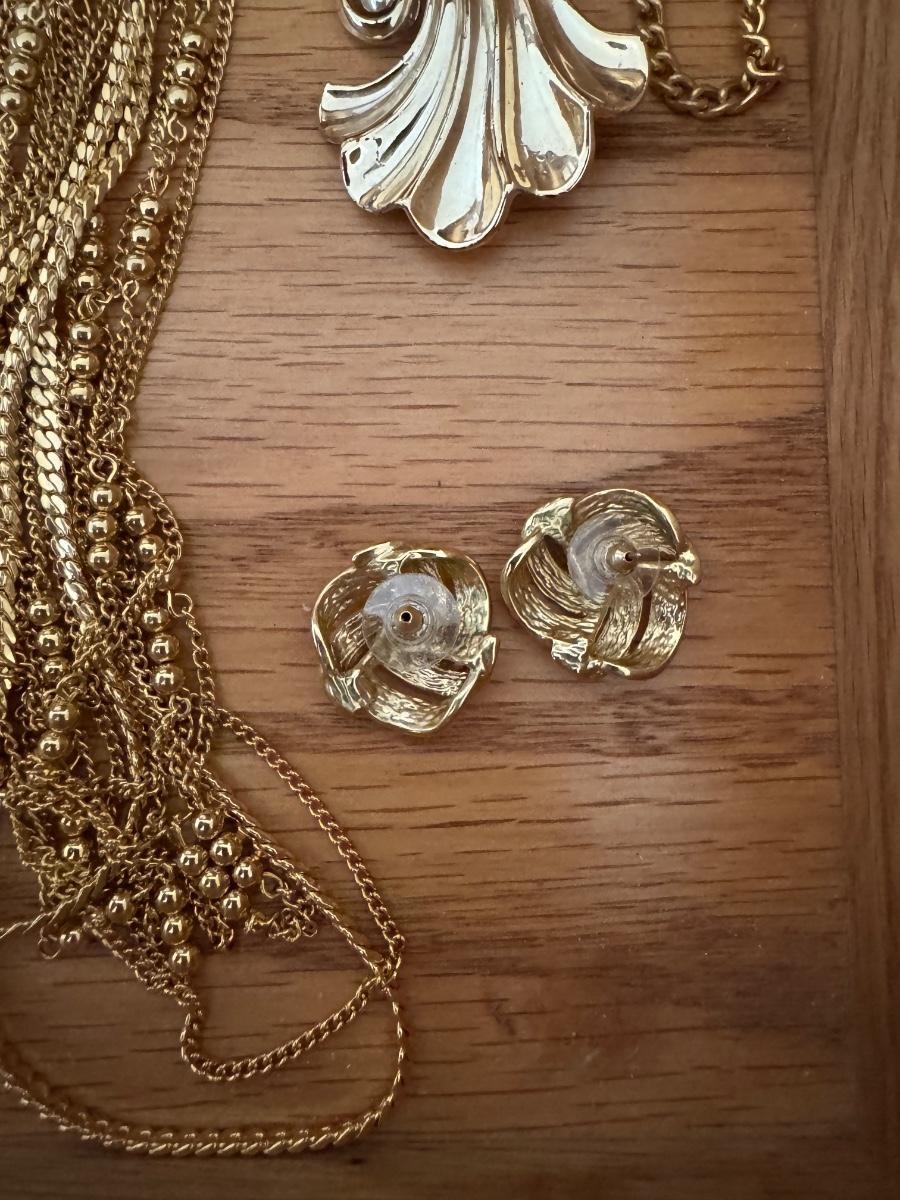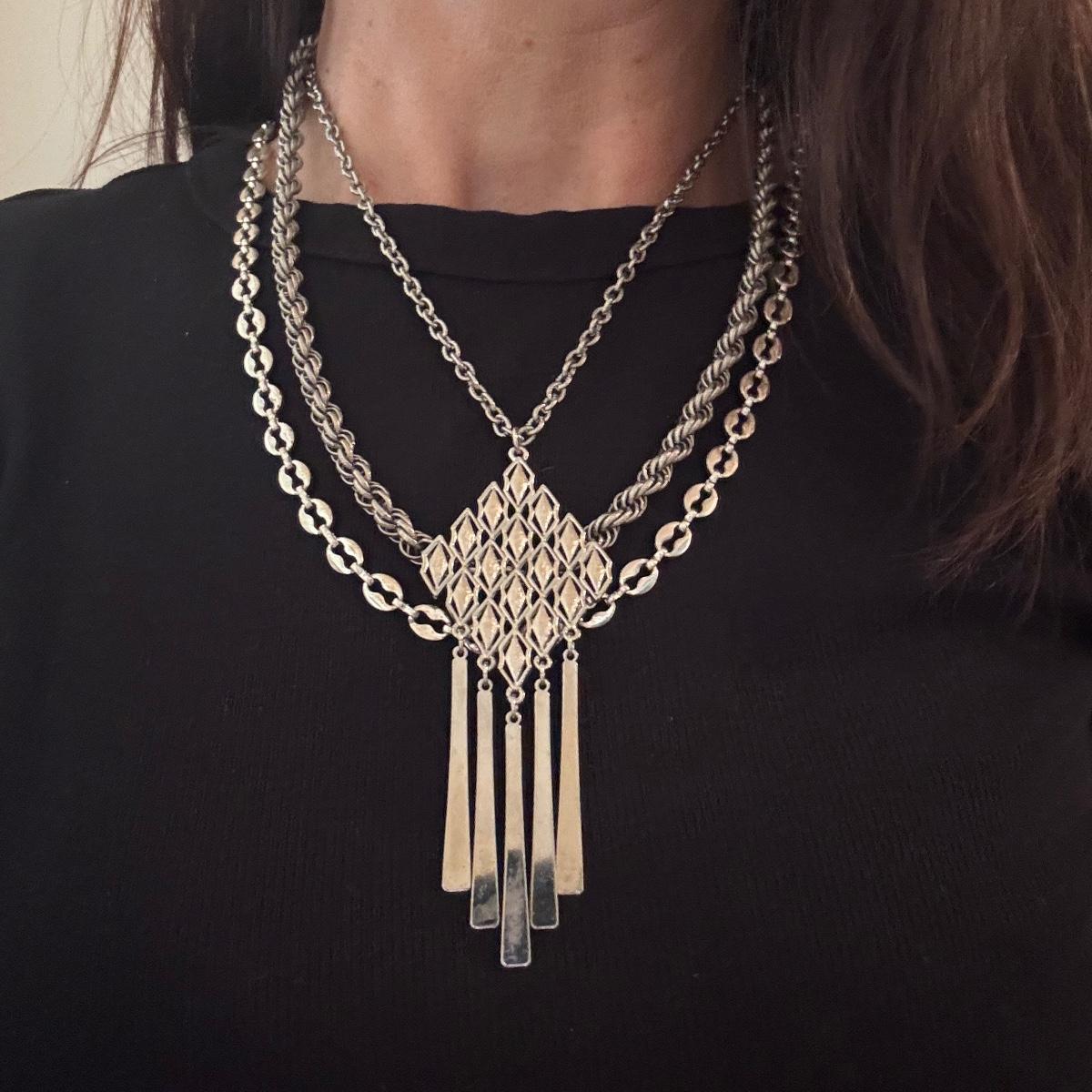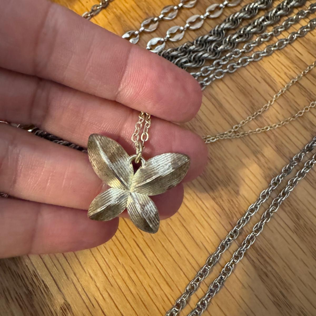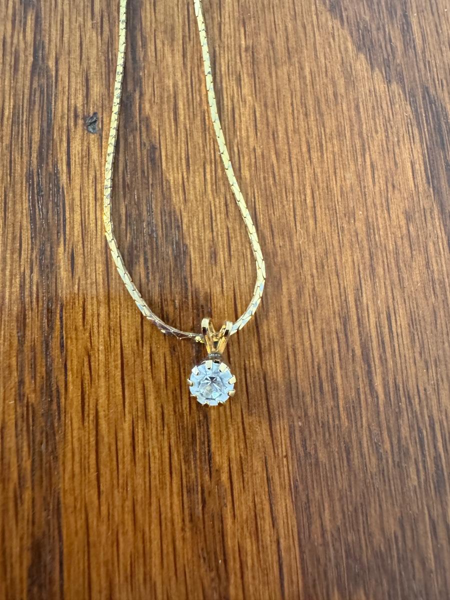 Large lot of gold and silver necklaces. Also includes three bracelets, three rings and a few pendants. There is one pair of earrings. The clasp on the faux diamond pendant gold necklace sticks open. There is a box with a silver shark tooth that is from Avon. No KT gold or sterling marks were found and the diamonds did not test as real. Shipping available