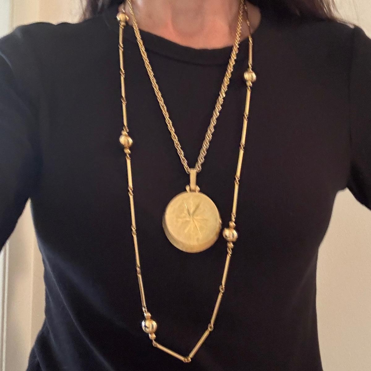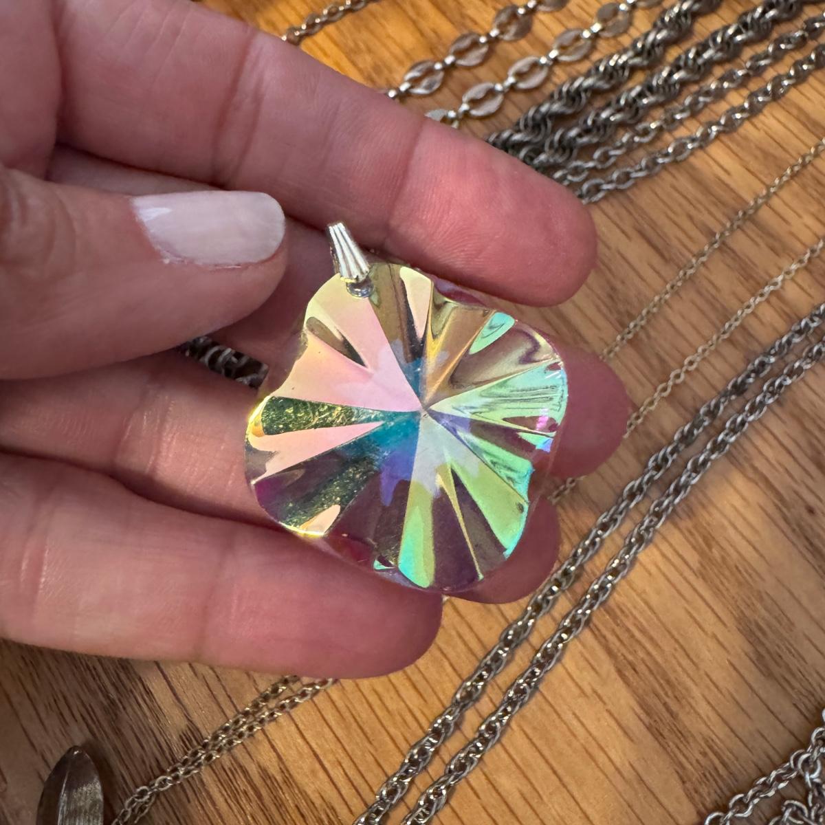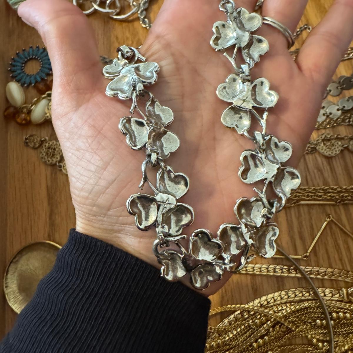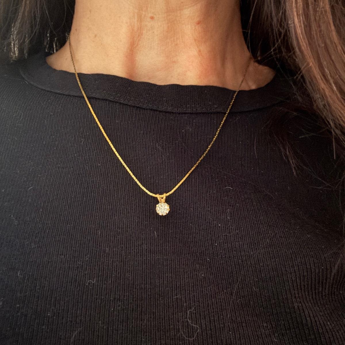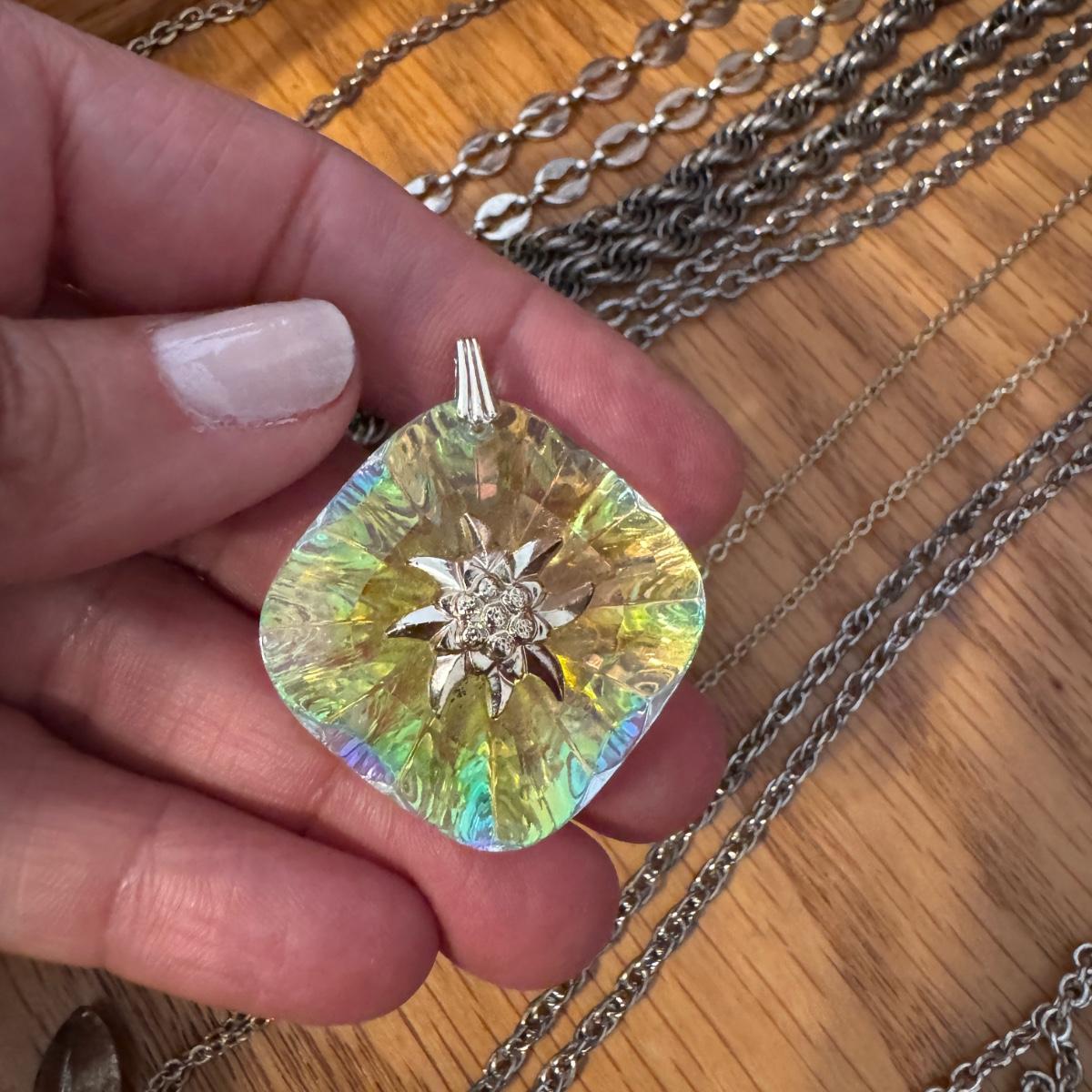 Large lot of gold and silver necklaces. Also includes three bracelets, three rings and a few pendants. There is one pair of earrings. The clasp on the faux diamond pendant gold necklace sticks open. There is a box with a silver shark tooth that is from Avon. No KT gold or sterling marks were found and the diamonds did not test as real. Shipping available