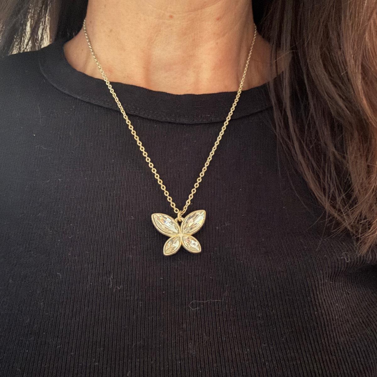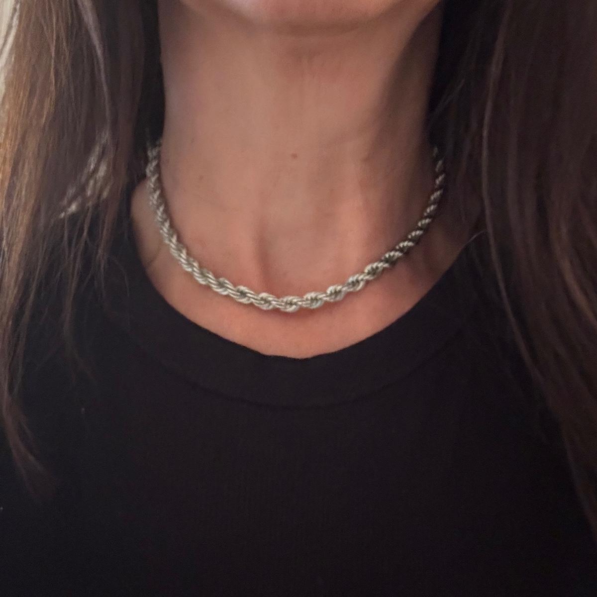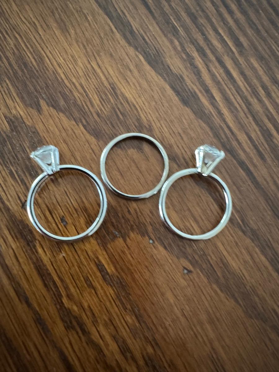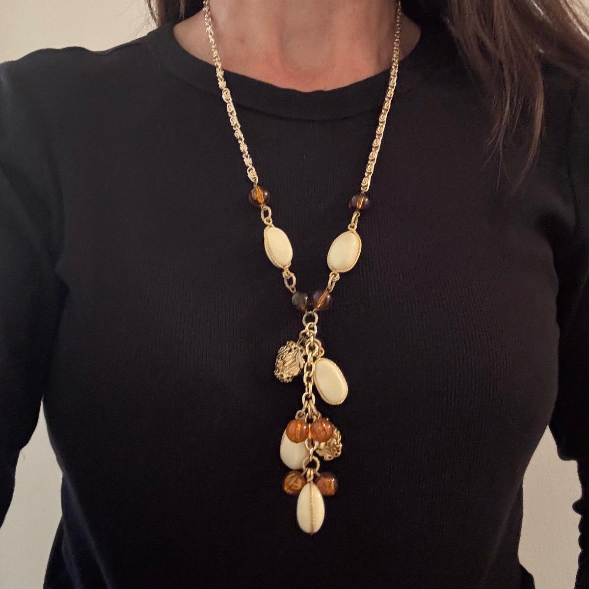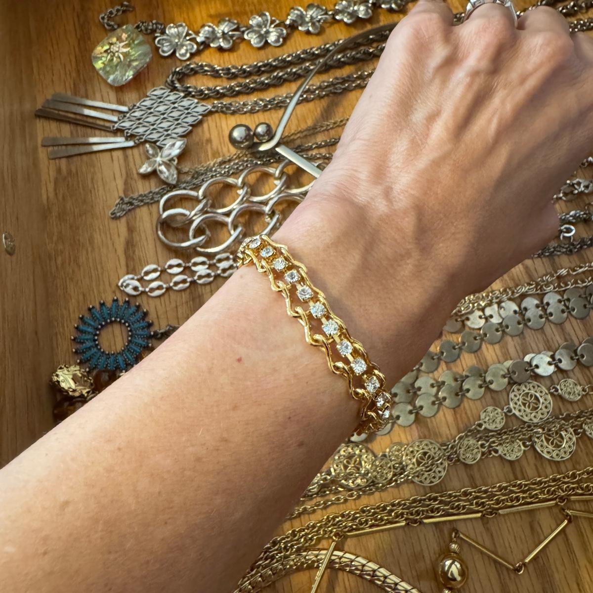 Large lot of gold and silver necklaces. Also includes three bracelets, three rings and a few pendants. There is one pair of earrings. The clasp on the faux diamond pendant gold necklace sticks open. There is a box with a silver shark tooth that is from Avon. No KT gold or sterling marks were found and the diamonds did not test as real. Shipping available