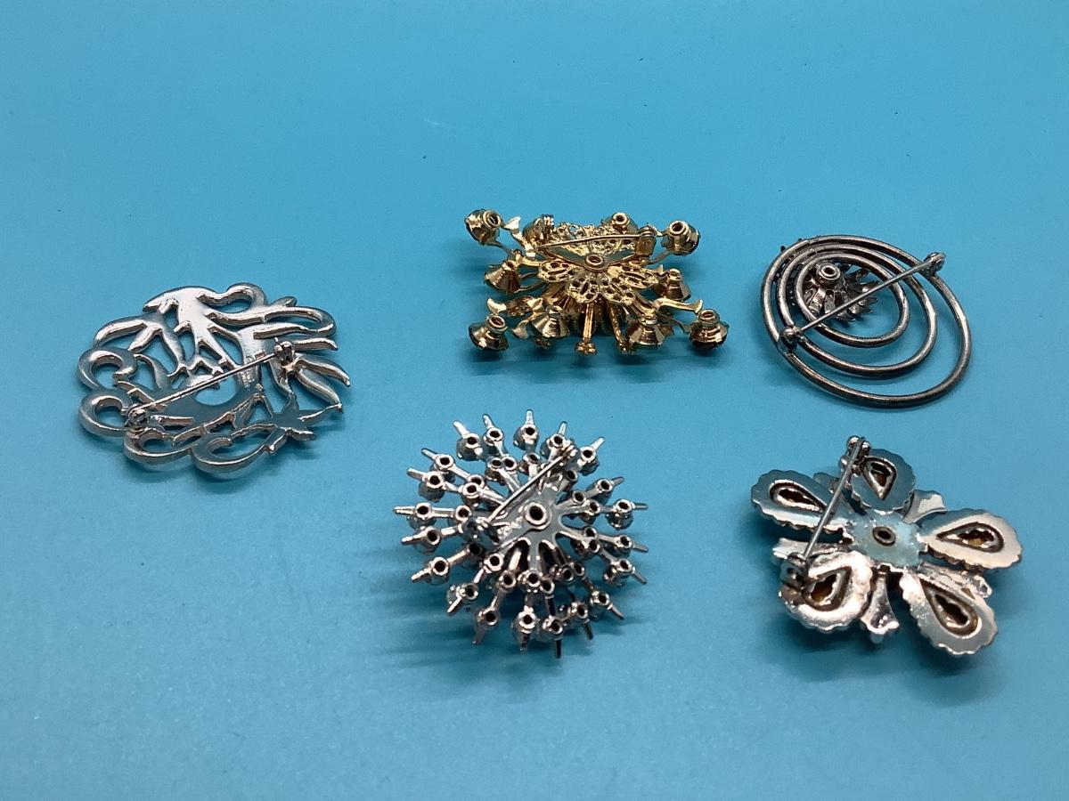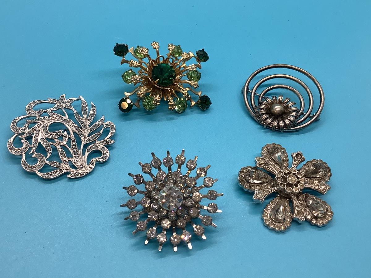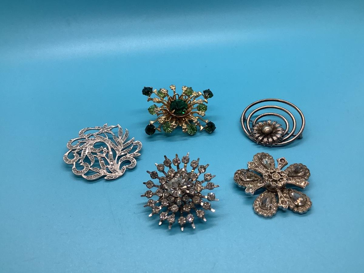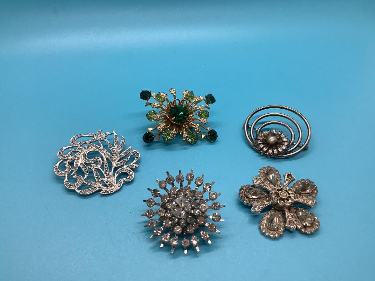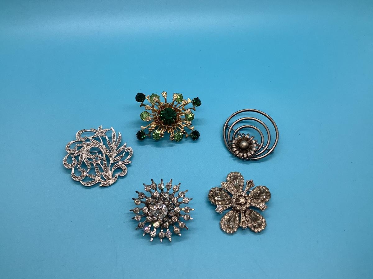 Costume Jewelry 5 pins, circles with flower, 3 sparkle with silver color, 1 green rectangular