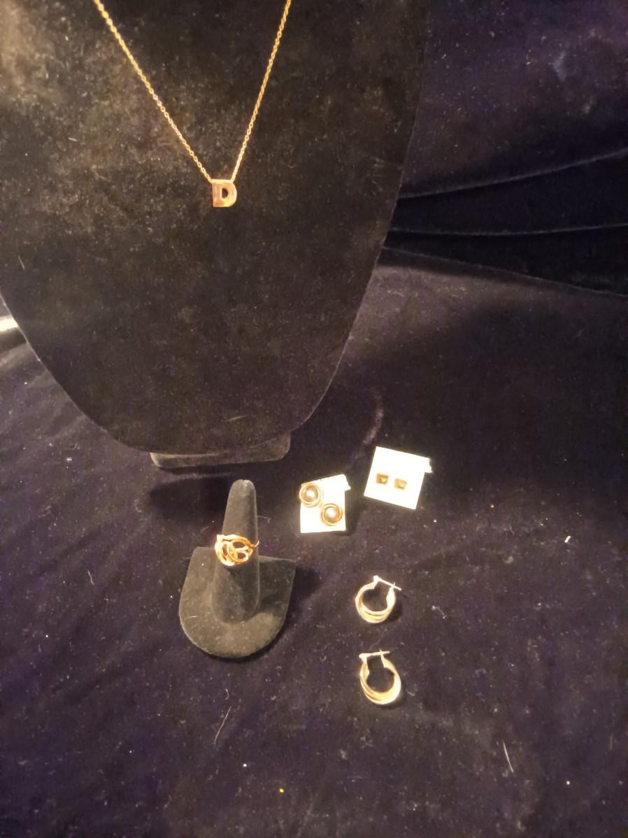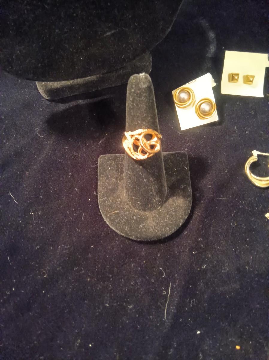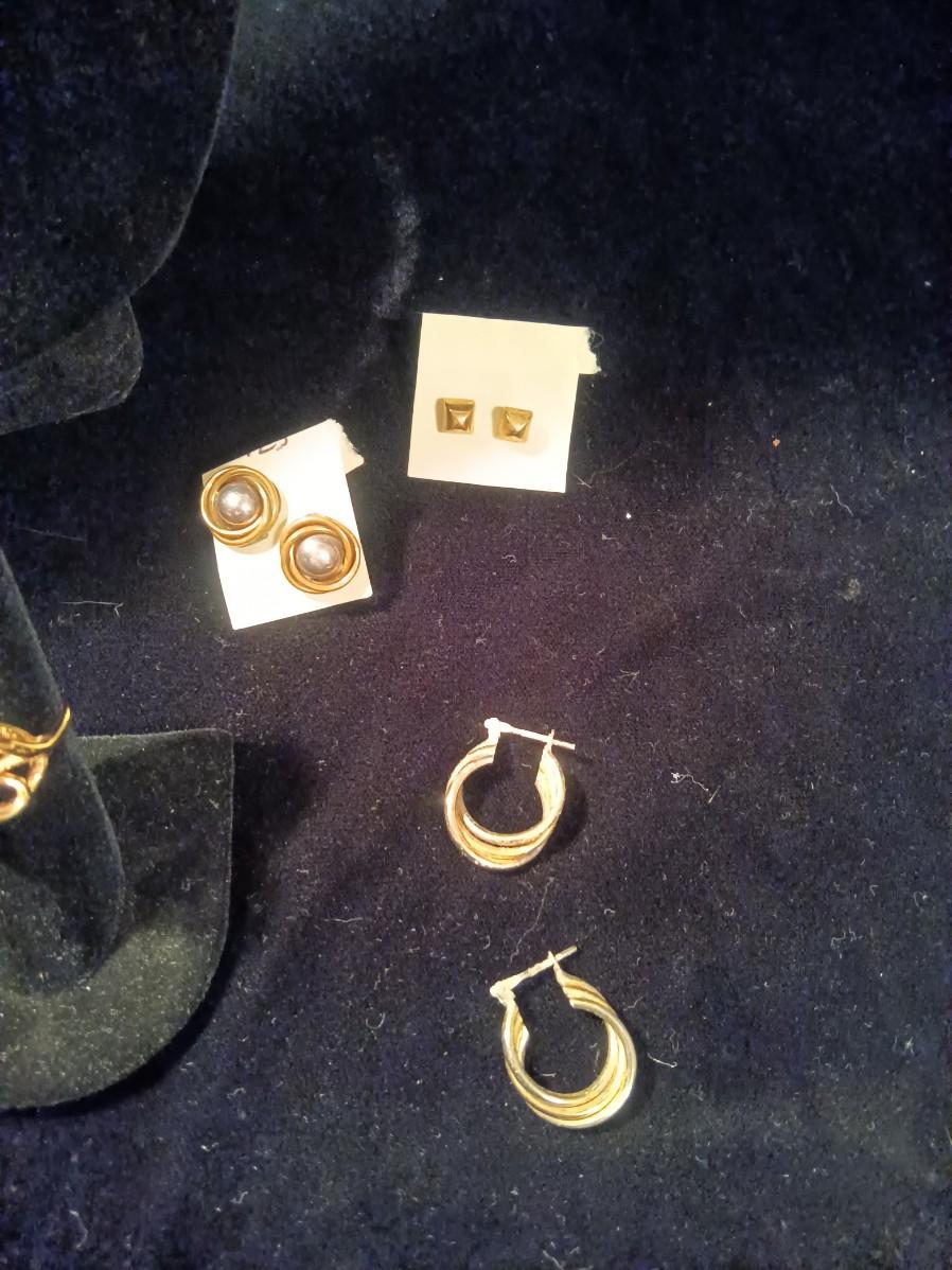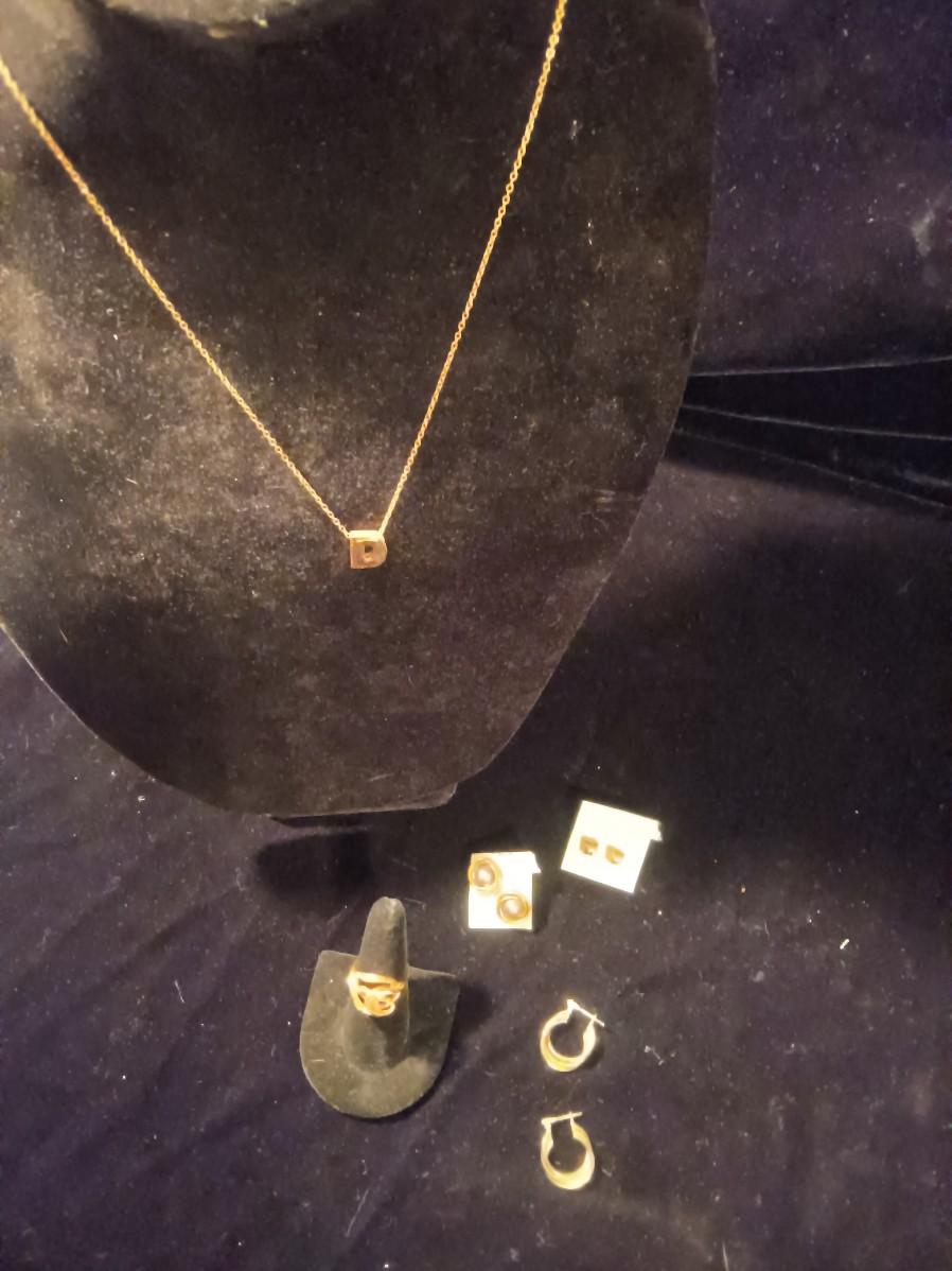 STUDS, 2 TONE HOOP COSTUME EARRINGS, GOLD TONE RING SIZE 6.5 AND A NECKLACE WITH THE LETTER D,