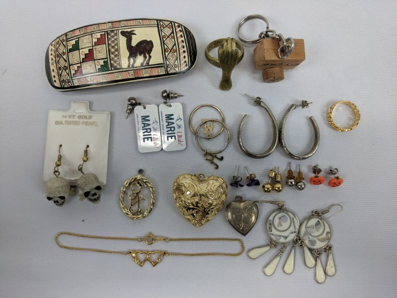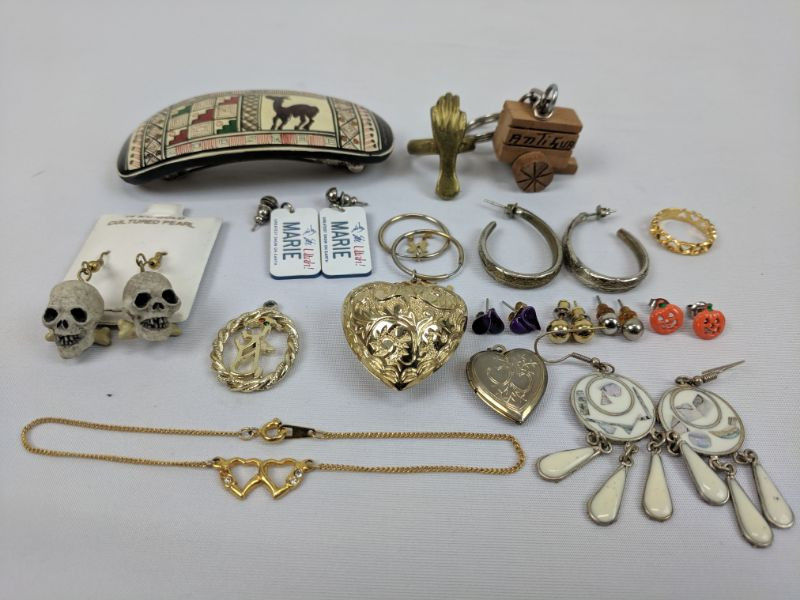Costume Jewelry: 9 Earrings, 3 Pendants, Bracelet, 2 Rings, Hair Clip, Keychain