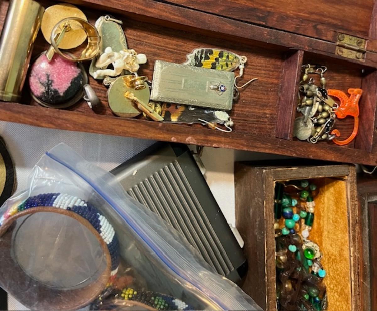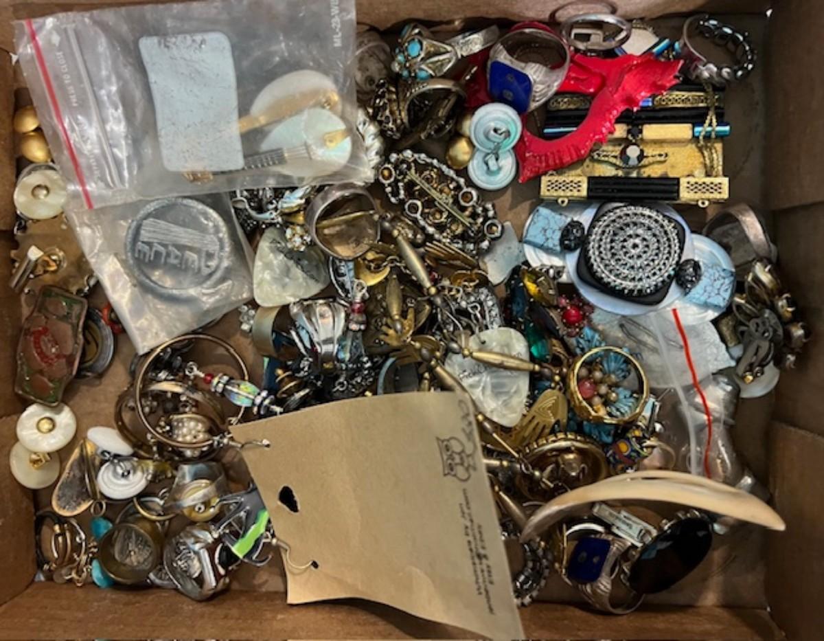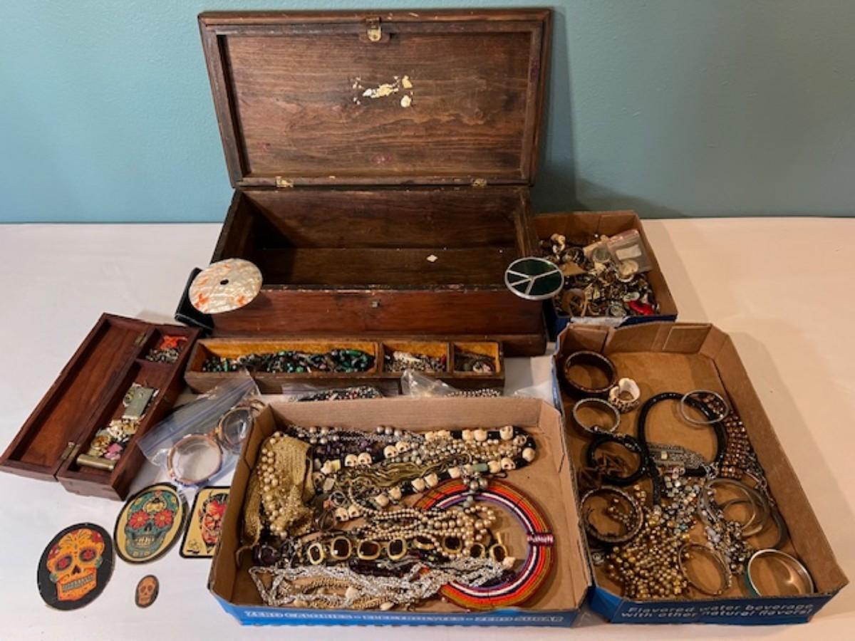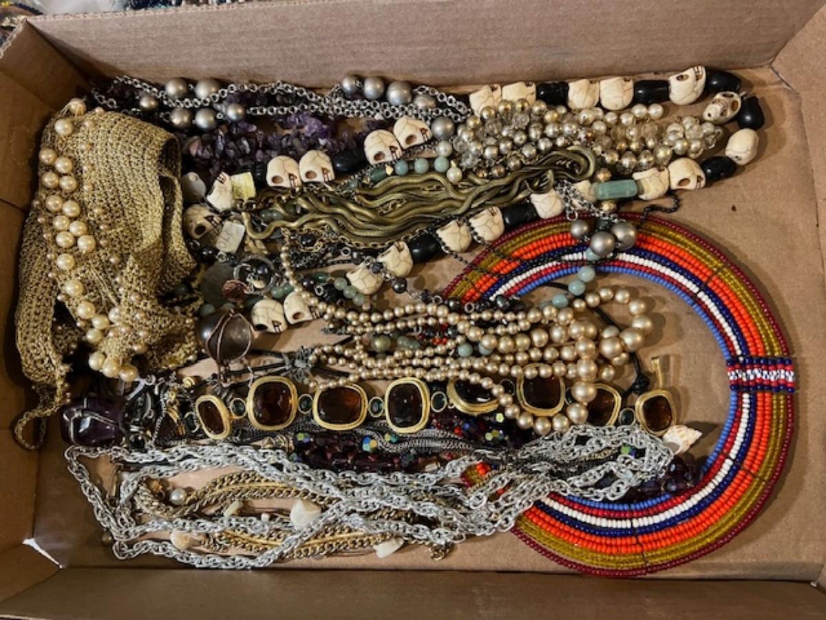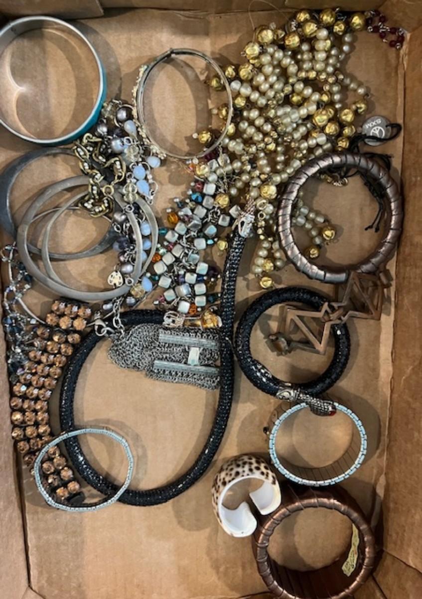 Includes necklaces, bangles, rings, earrings, and more. Also includes a vintage box. Measurement of box: 20" x 11".