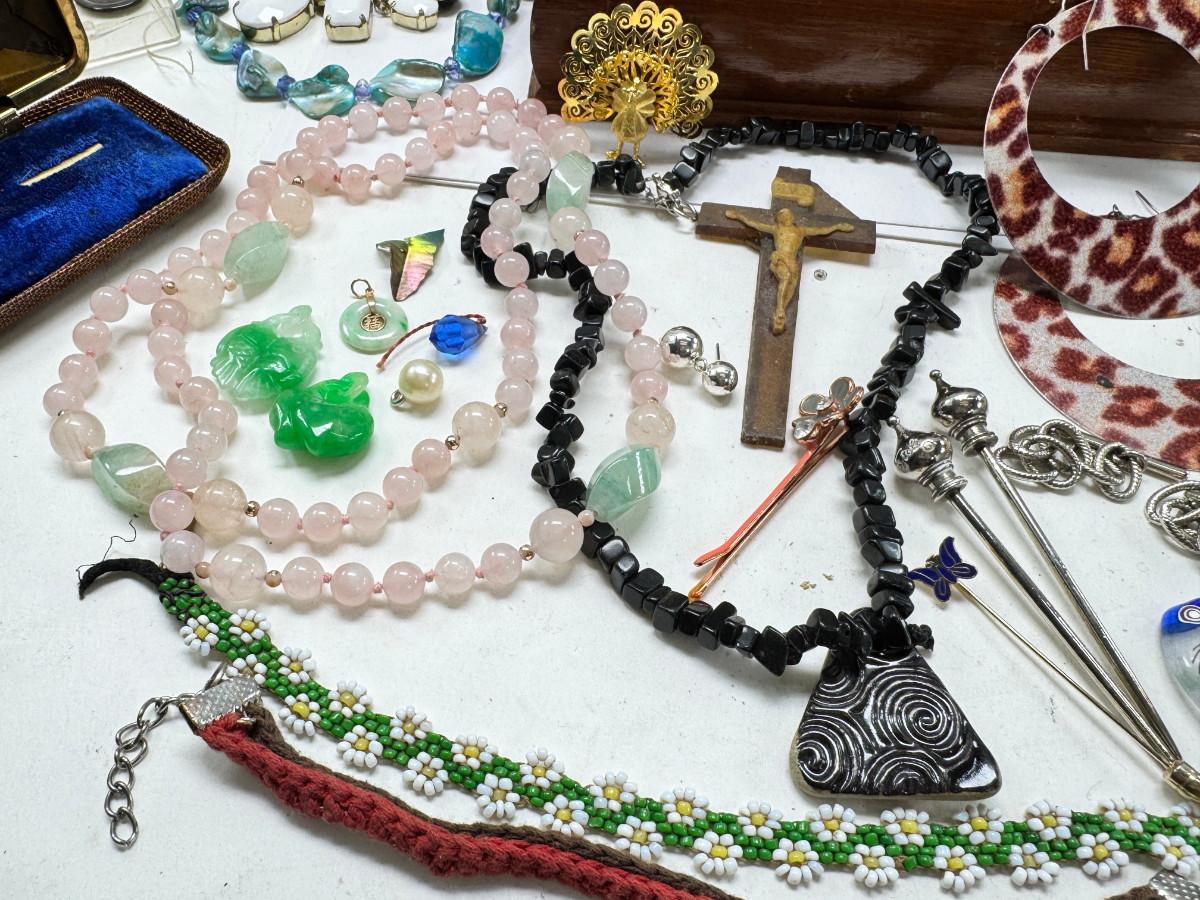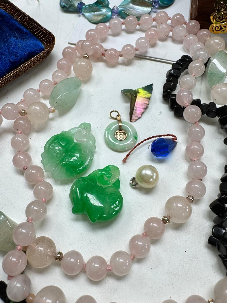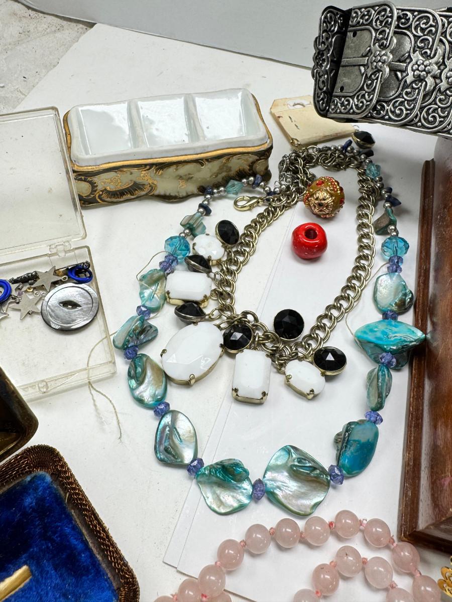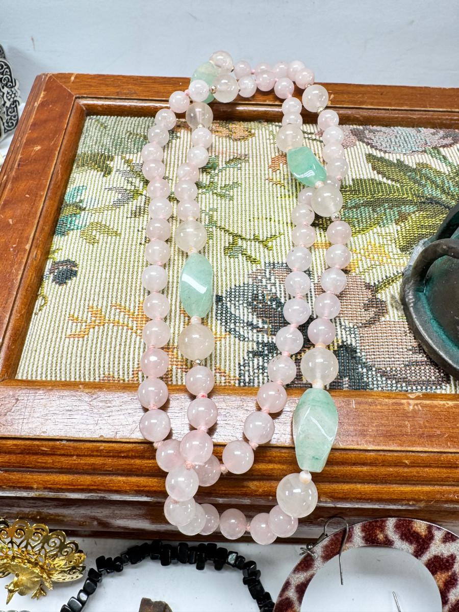 Necklaces, earrings, Rose Quartz, pins, Jewelry boxes. Vintage selection as is.