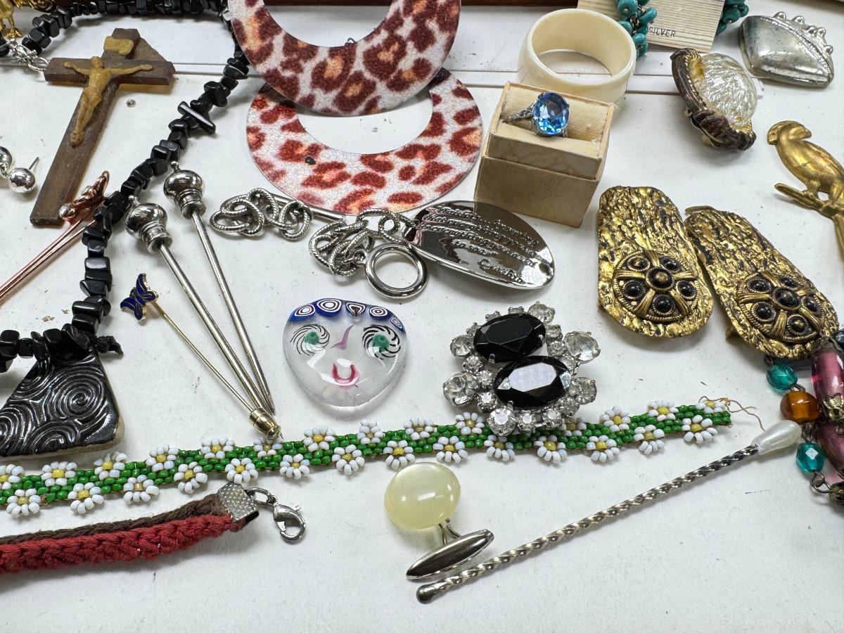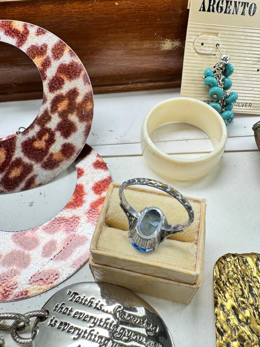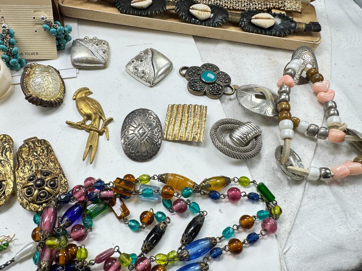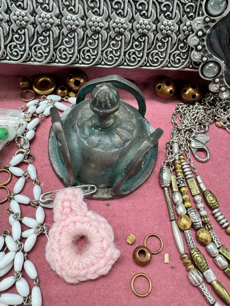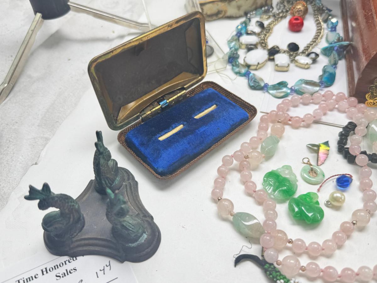 Necklaces, earrings, Rose Quartz, pins, Jewelry boxes. Vintage selection as is.