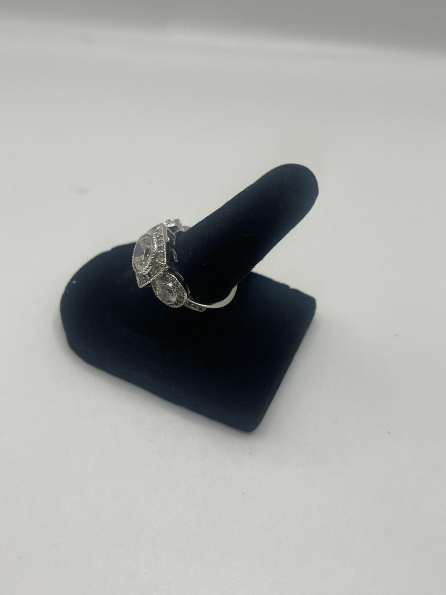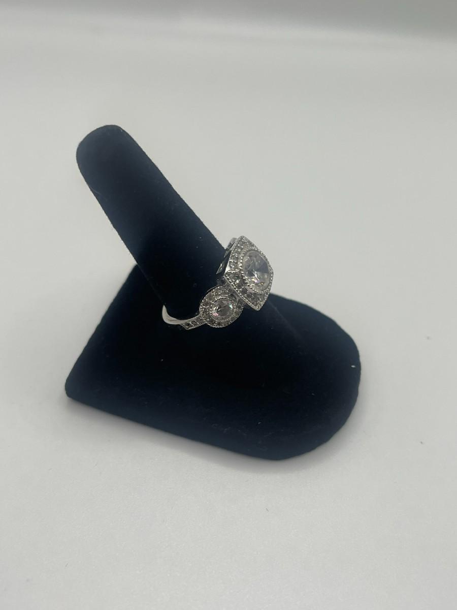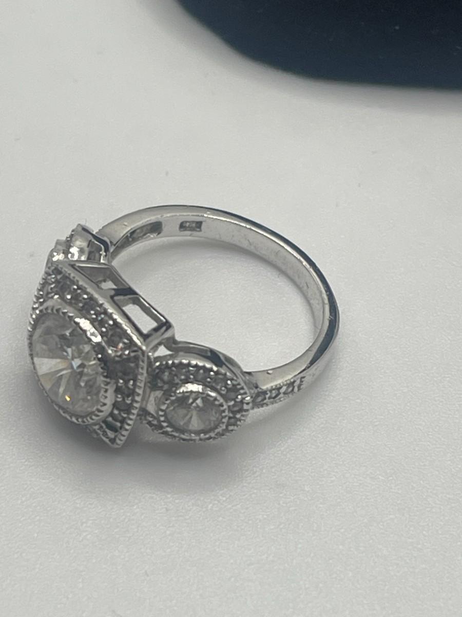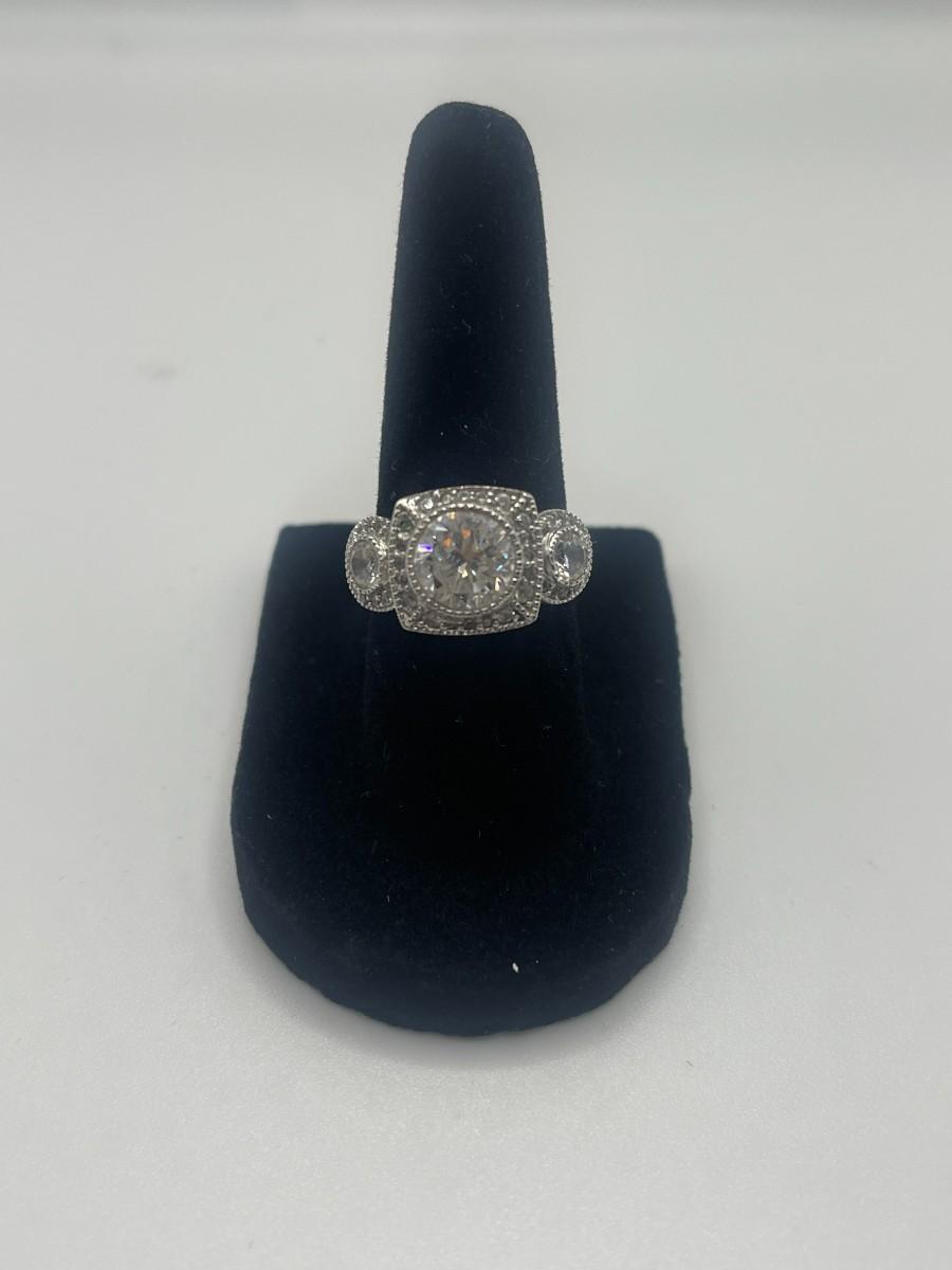 Costume jewelry faux diamond ring set in sterling silver. Marked 925. Ring Size approx 7.