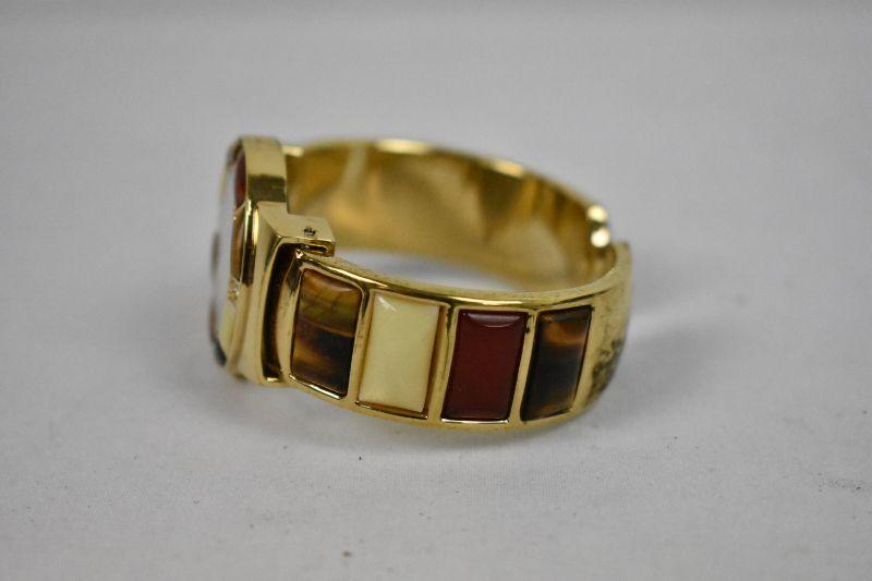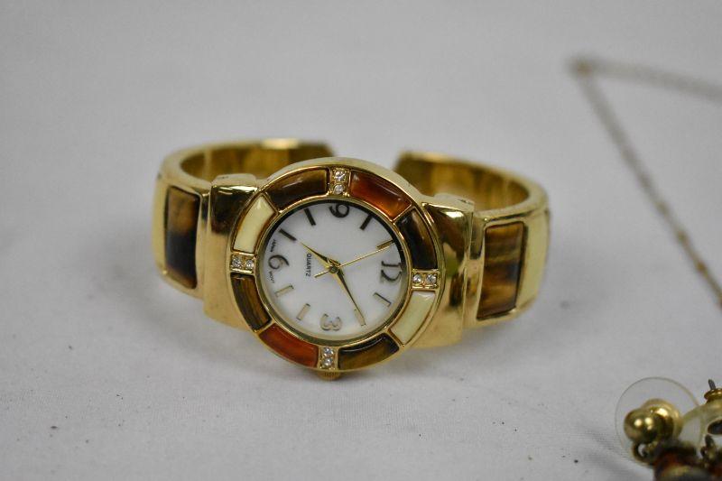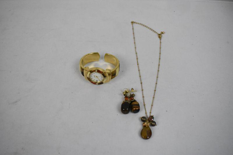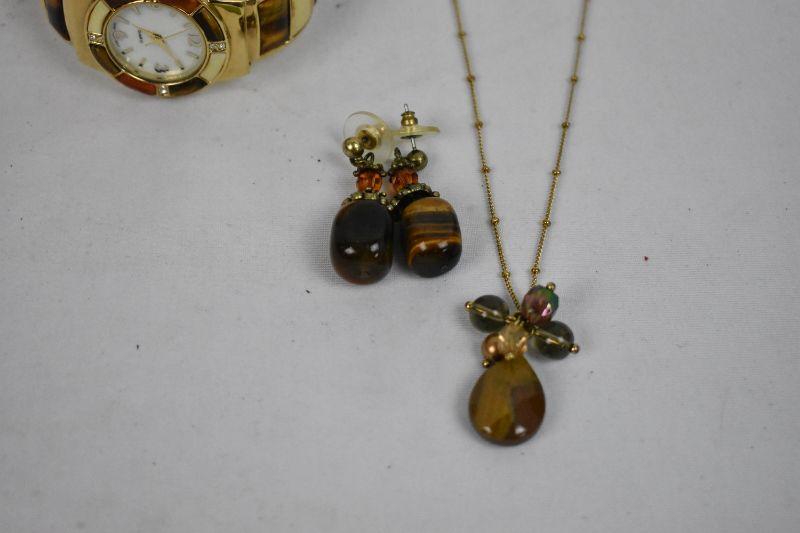 Costume Jewelry: Gold Tone/Tiger Eye Earrings/Necklace & Watch