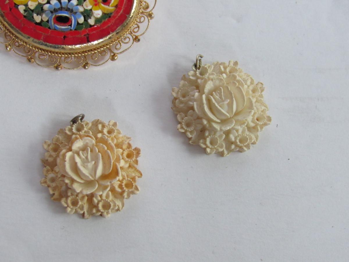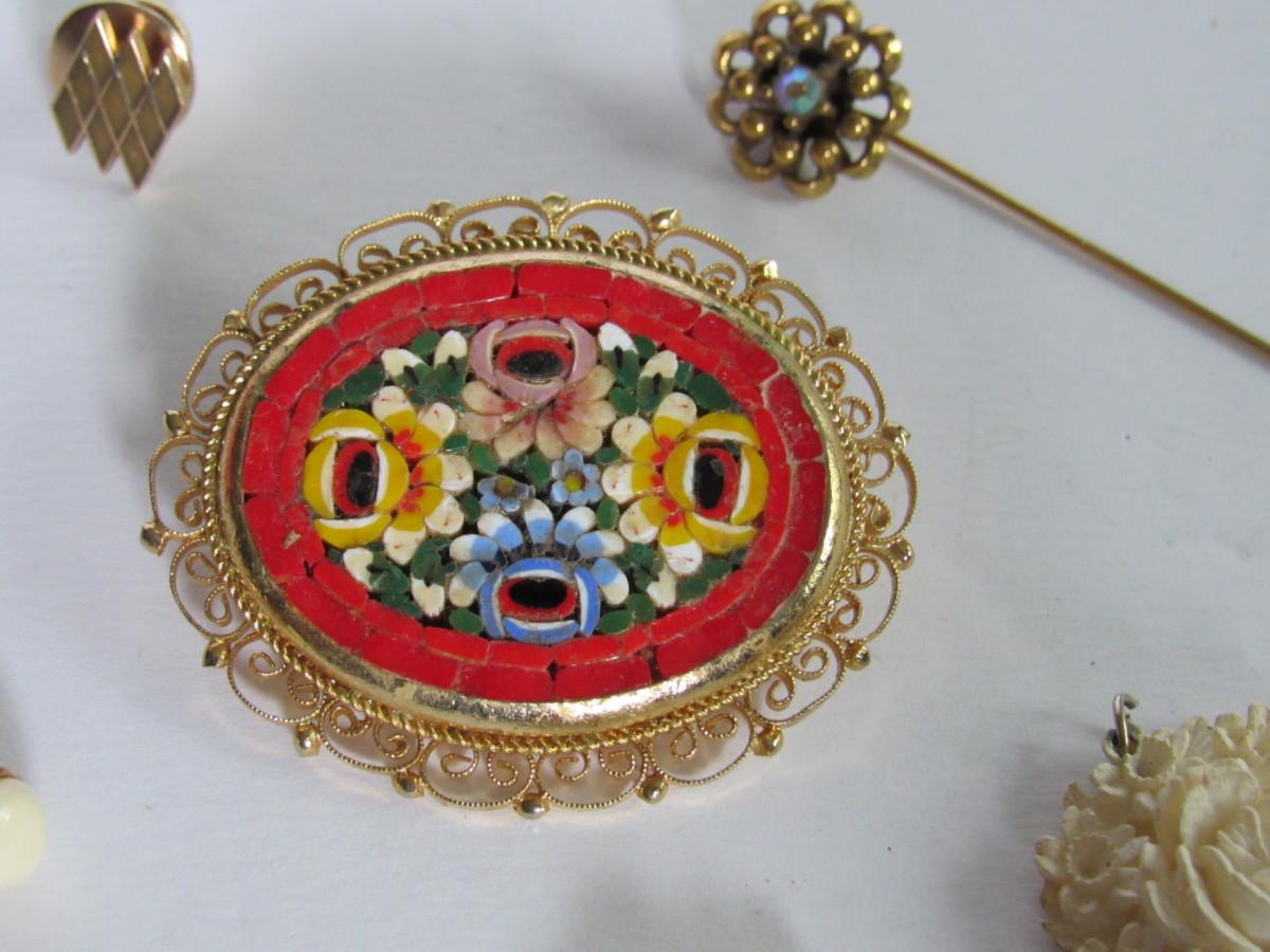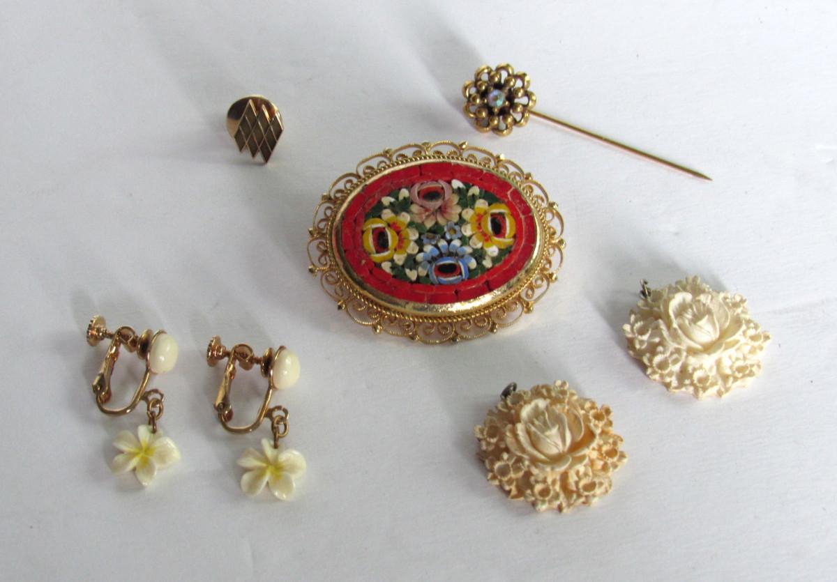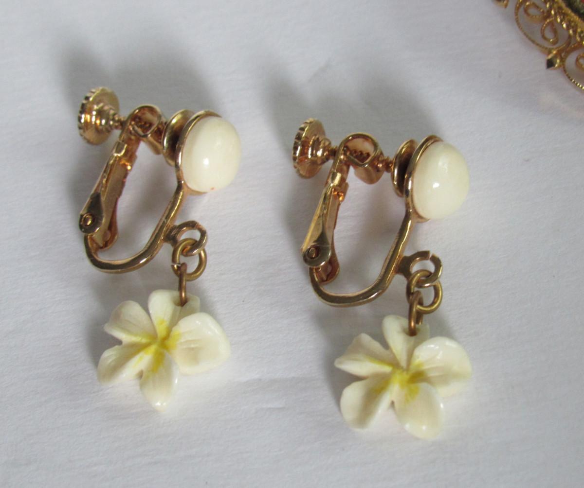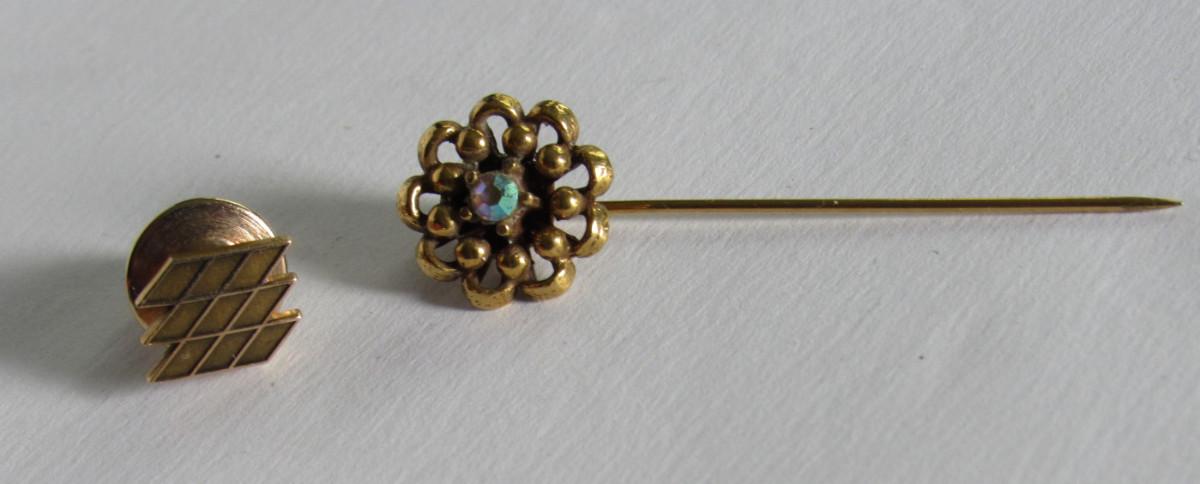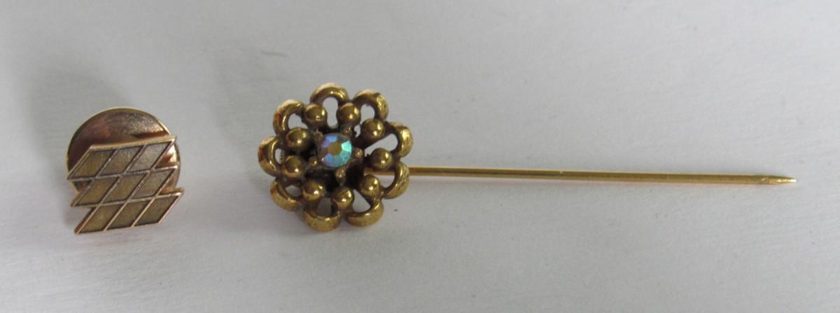 Italy brooch, nice. Two unsigned tie pins, nice shape. 2 cut plastic flower shaped pendants, one is stained. Unsigned little dangle earrings nice shape. Shipping is available at actual shipping cost plus $5.00 handling fee per box for supplies/labor. See our terms for details. All sales are final. Condition notes may not be all inclusive, we may miss some issues as most vintage items are not in mint condition and have some degree of wear, paint loss, etc, but we always try to note obvious damage.