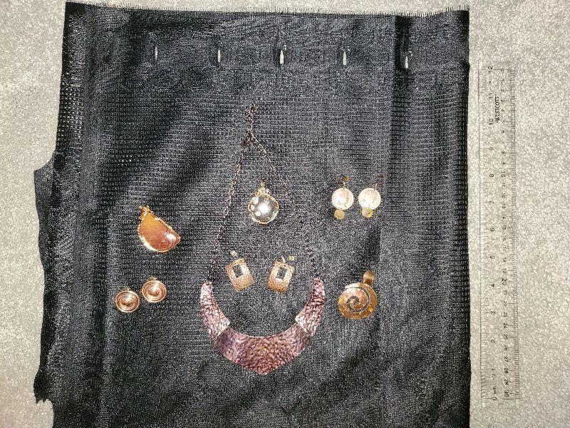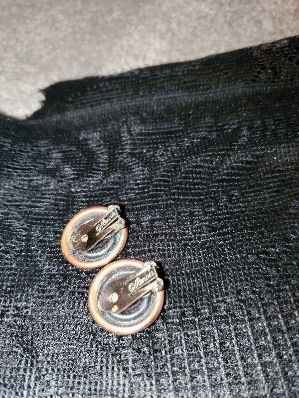 This is a costume jewelry lot (#3) includes 7 items and includes Renoir vintage copper clip earrings, 2 pairs of pierced earrings, a necklace, two stone pendants, and one copper pendant (marked Douglas Etsitty). See ruler for sizes of items. See additional photos for Renoir earrings and copper pendant. Also, the copper earrings are Navajo Indian Hammered Copper Earrings by Douglas Etsitty (marked).