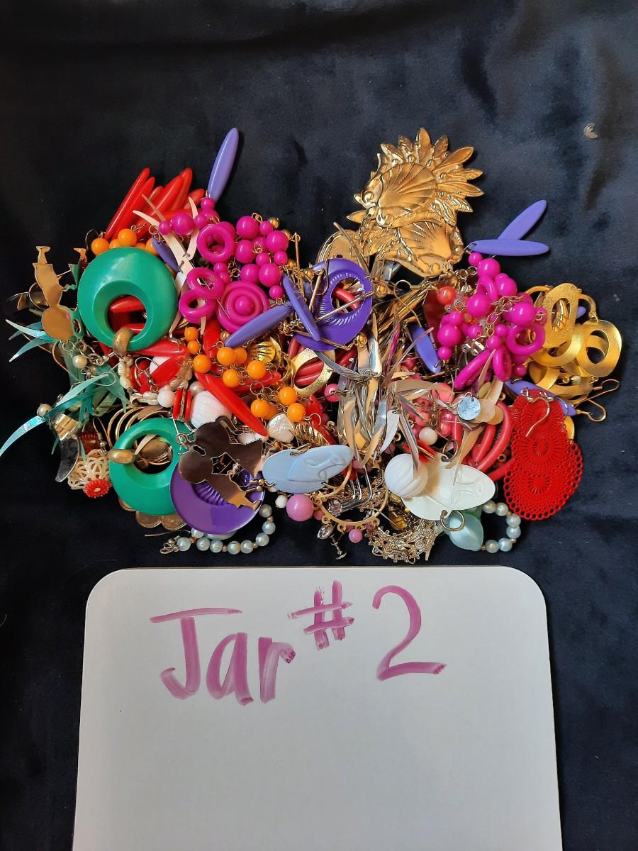 Jar #2 = Approximately 35 pair of earrings, mostly plastic.