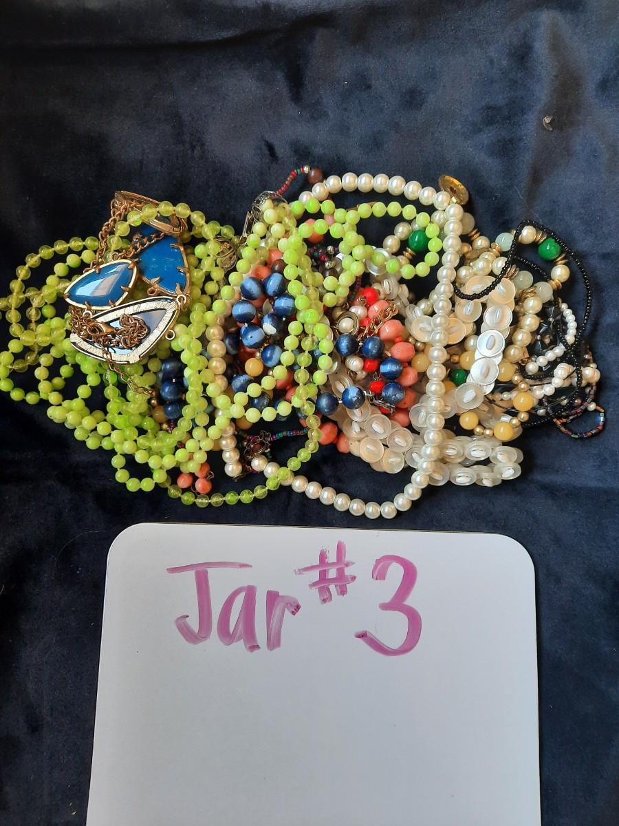 Jar #3 = Approximately 15 necklaces, mostly plastic beads.