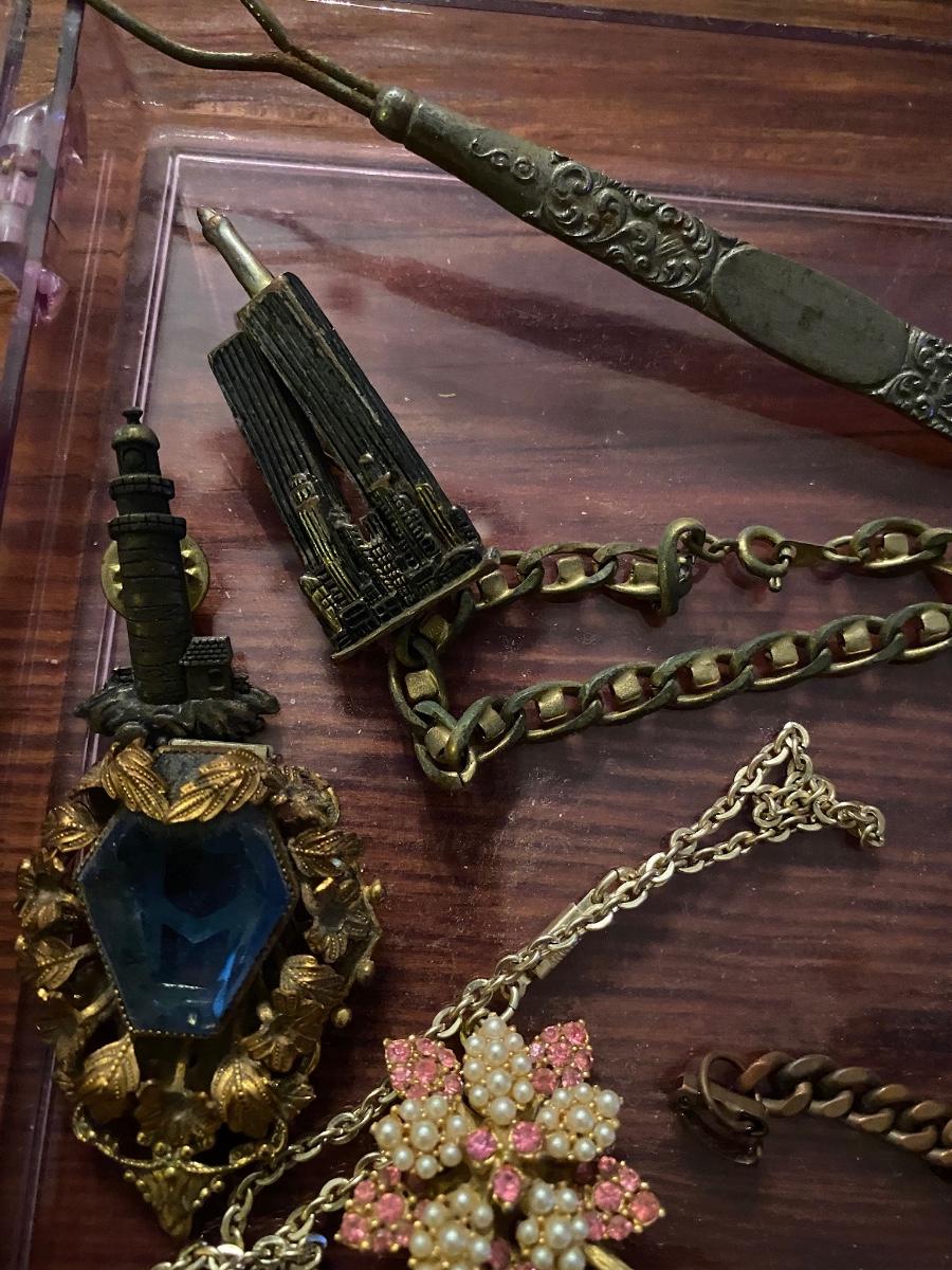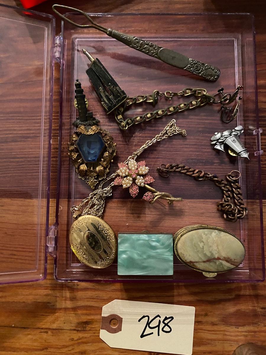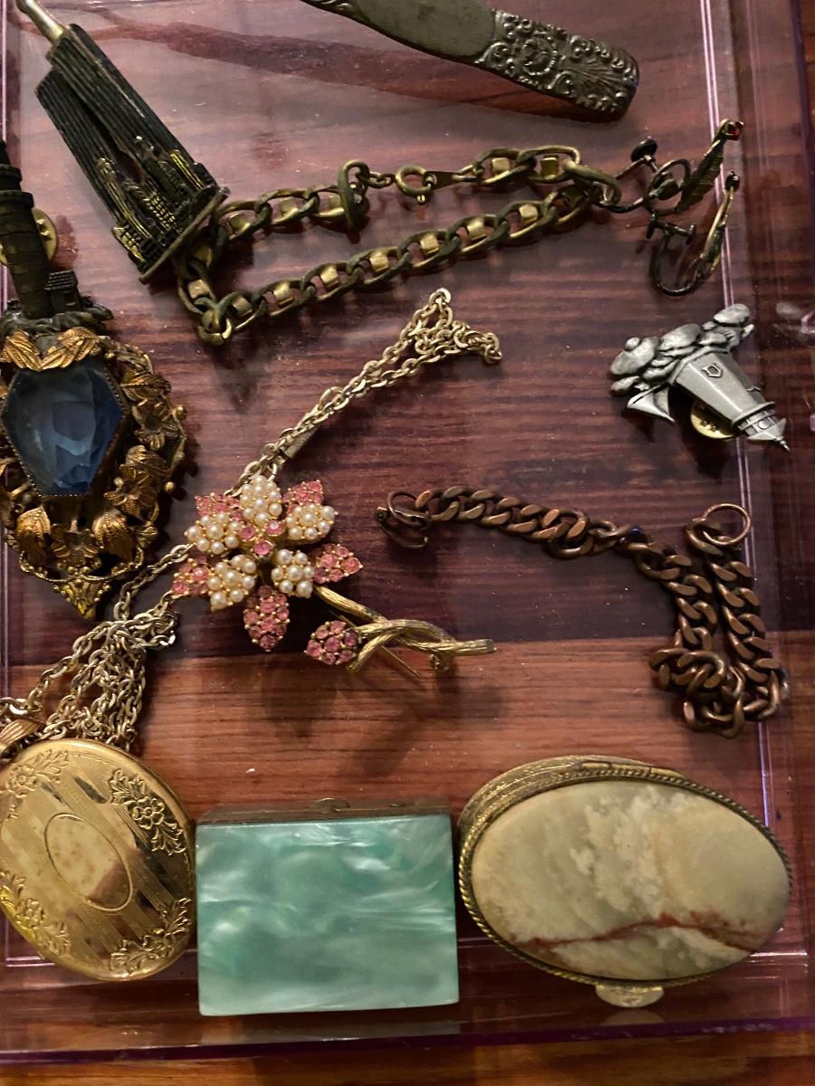 Costume Jewelry, pill-trinket boxes & threader as pictured