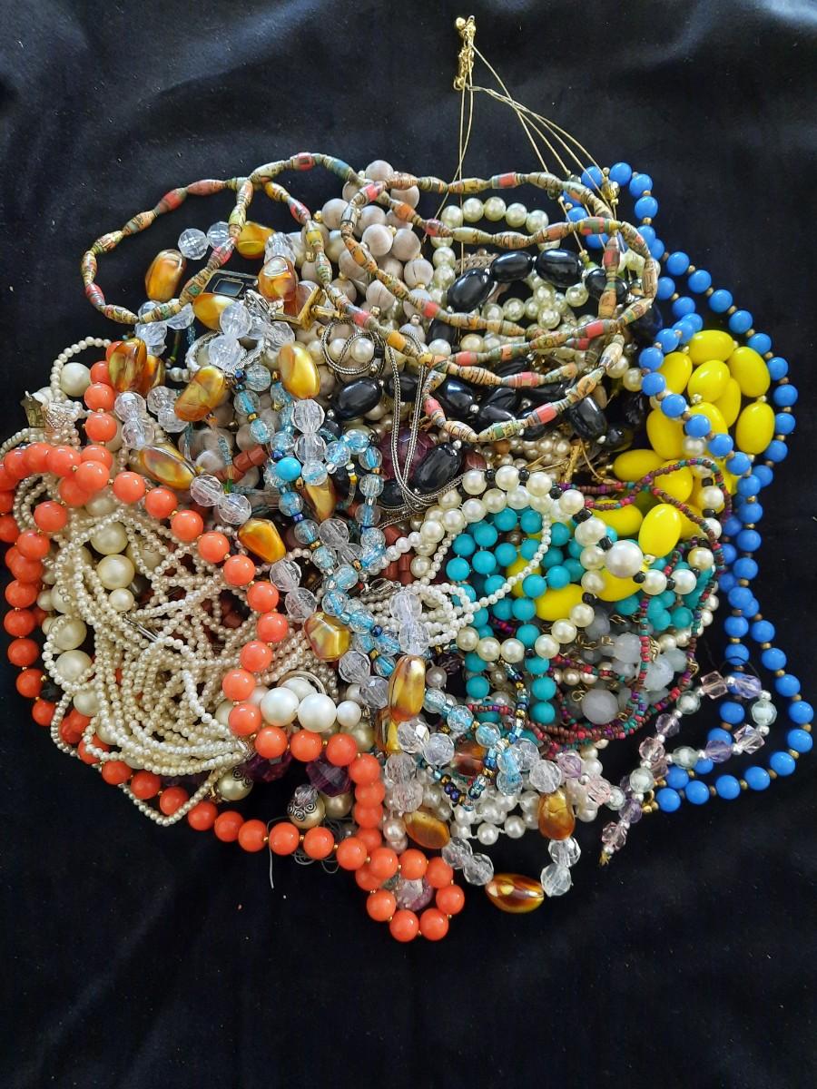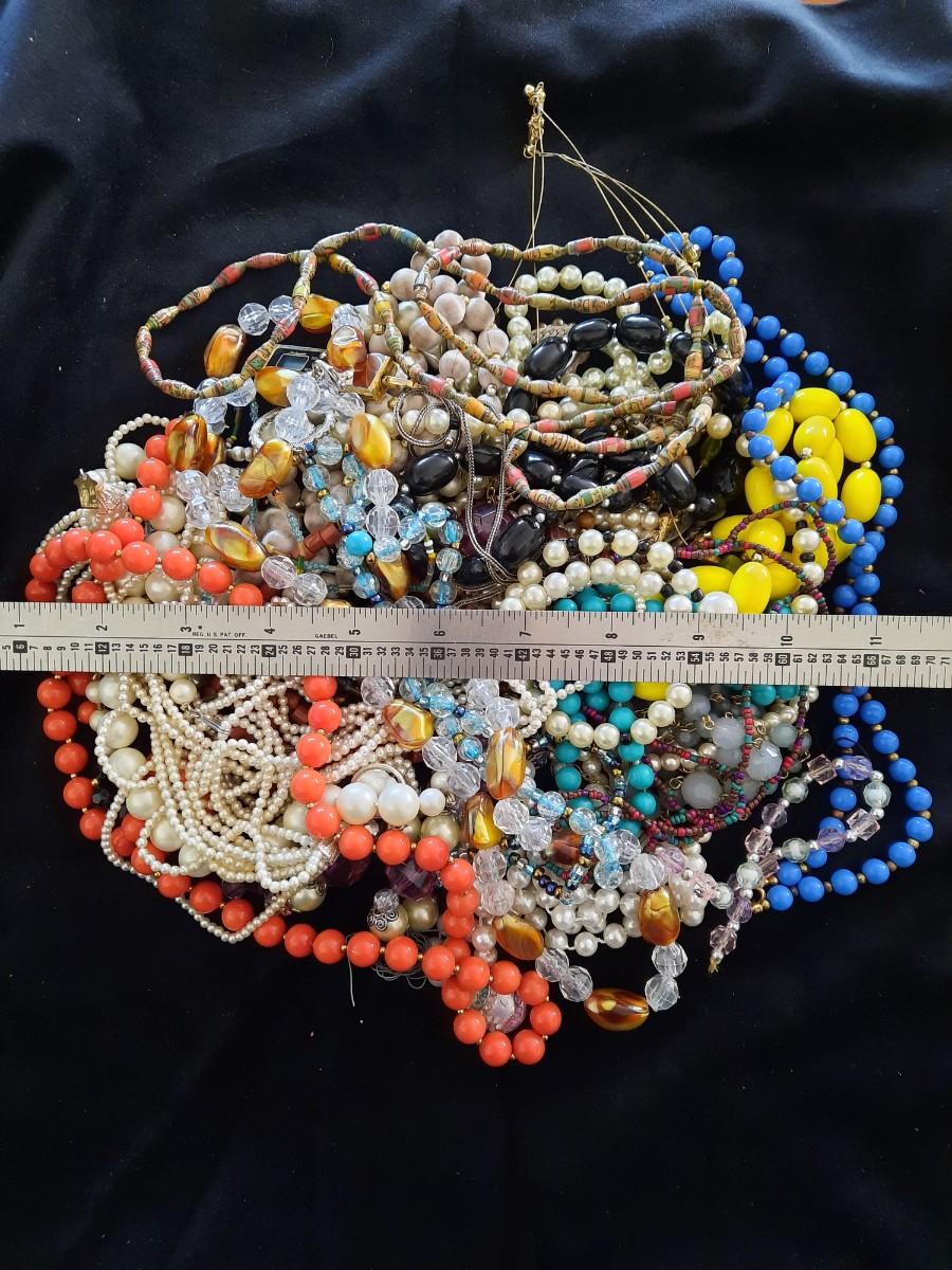 There are approximately 30 necklaces included in this lot. Almost all are usable and resaleable but i believe there are a few that are just beads.