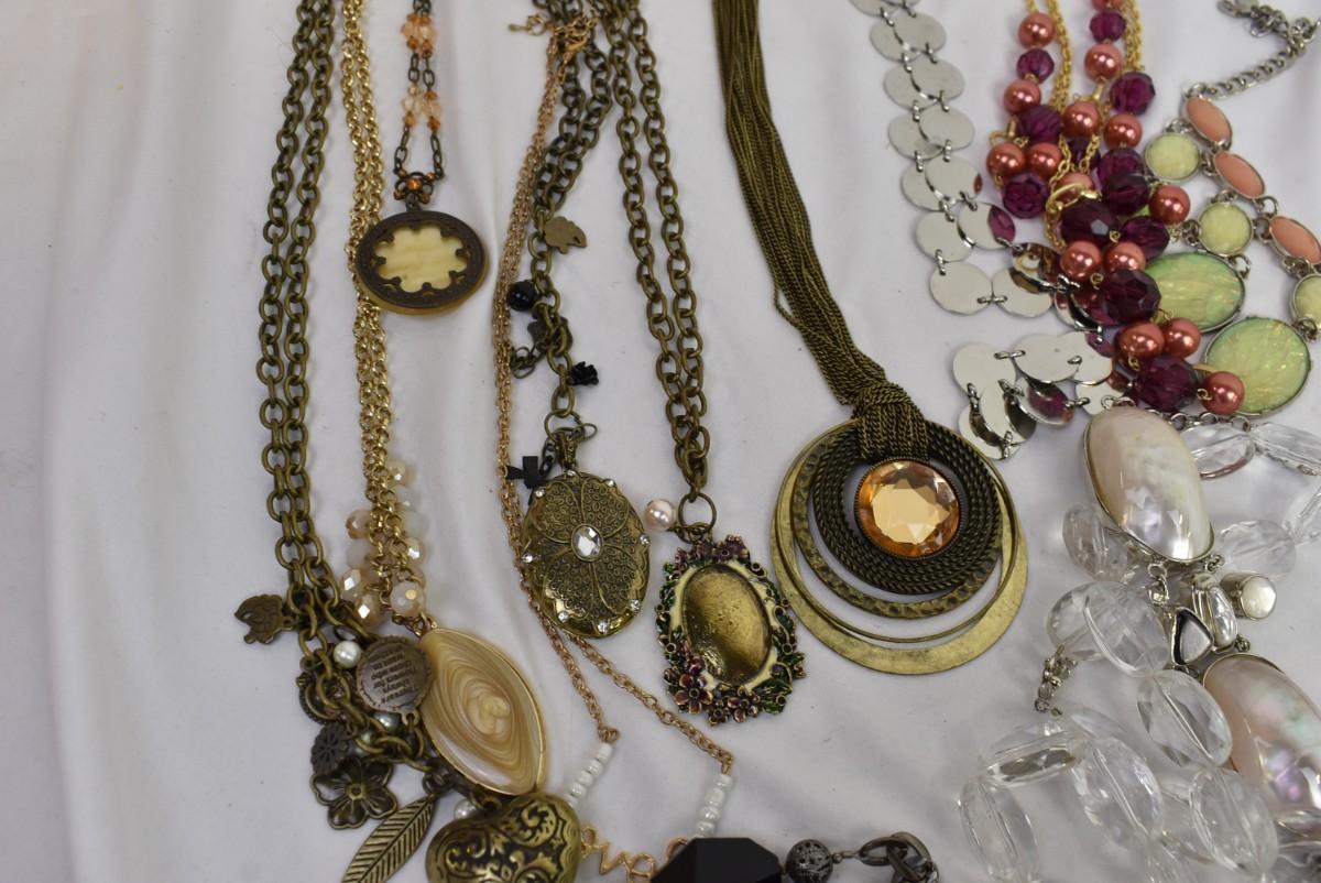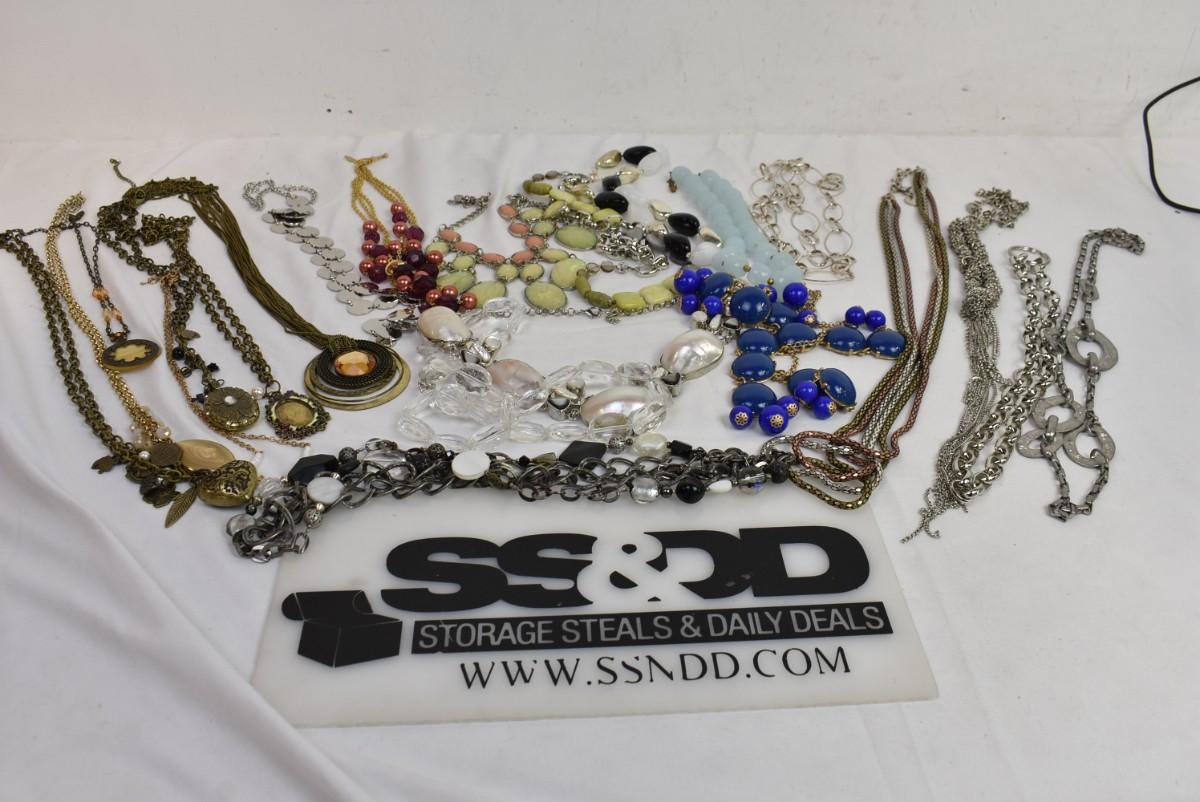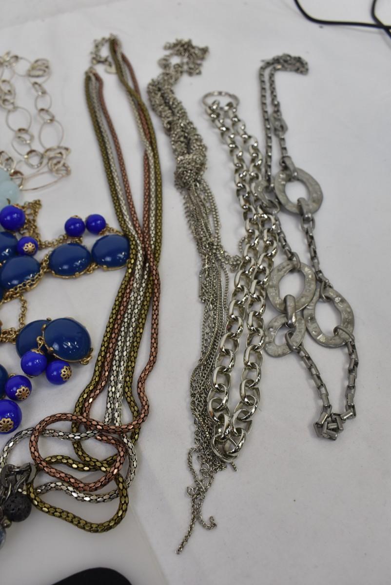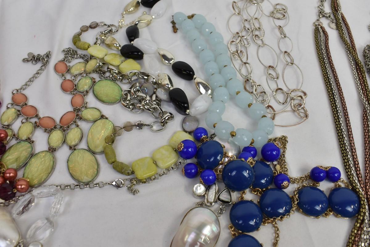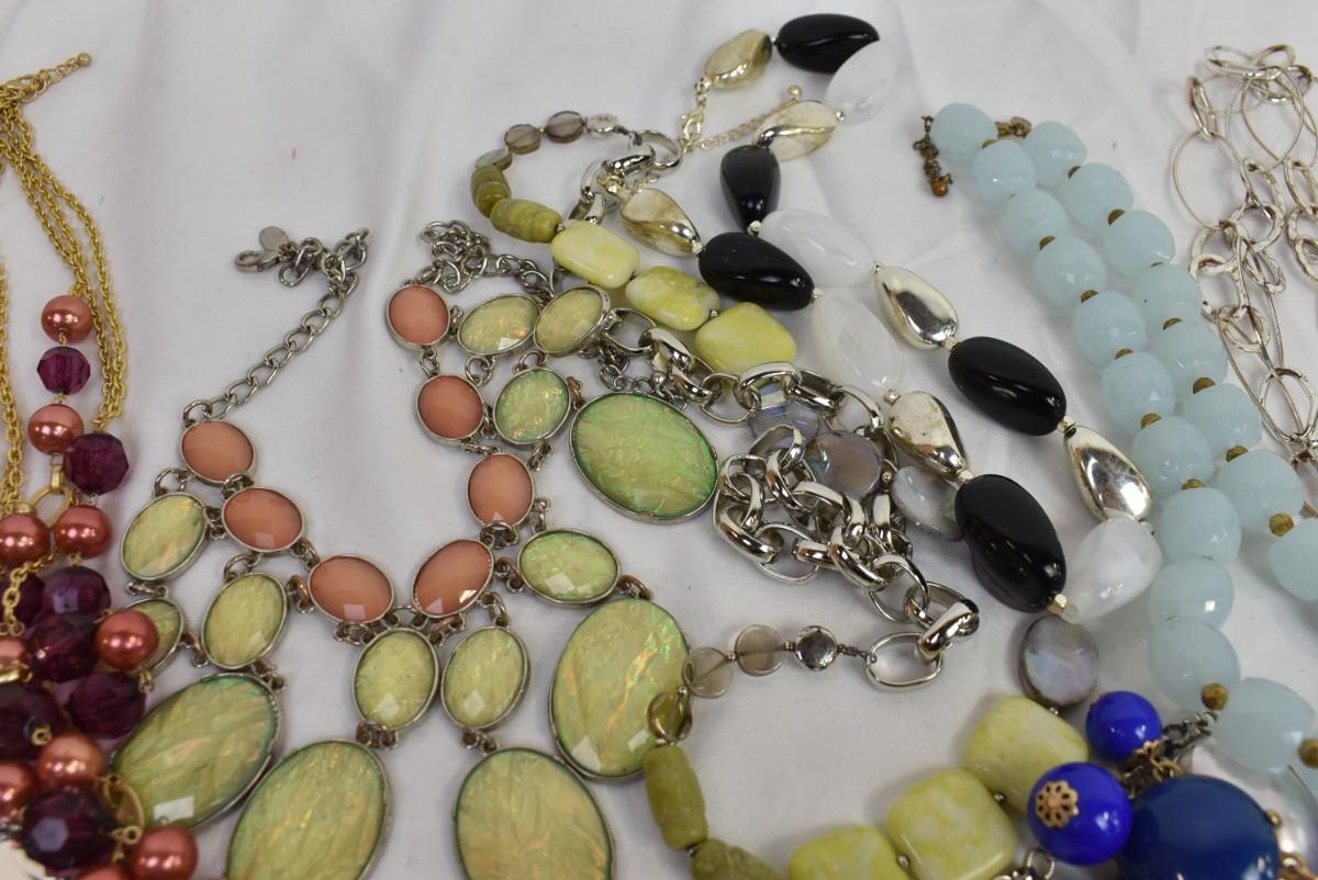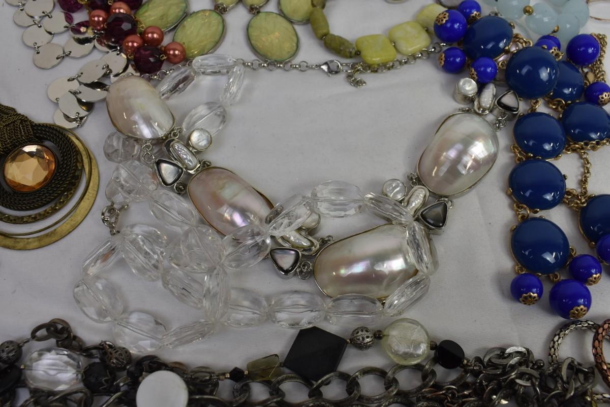 Costume Jewelry: Statement Necklaces: Chains, Various Lengths & Colors: Blues, pearl, Goldtone, Silvertone, Burgundy