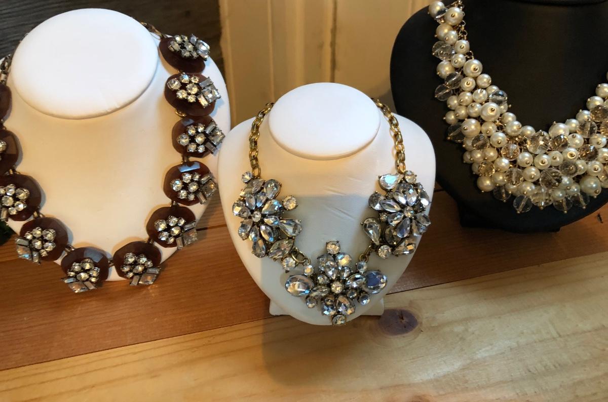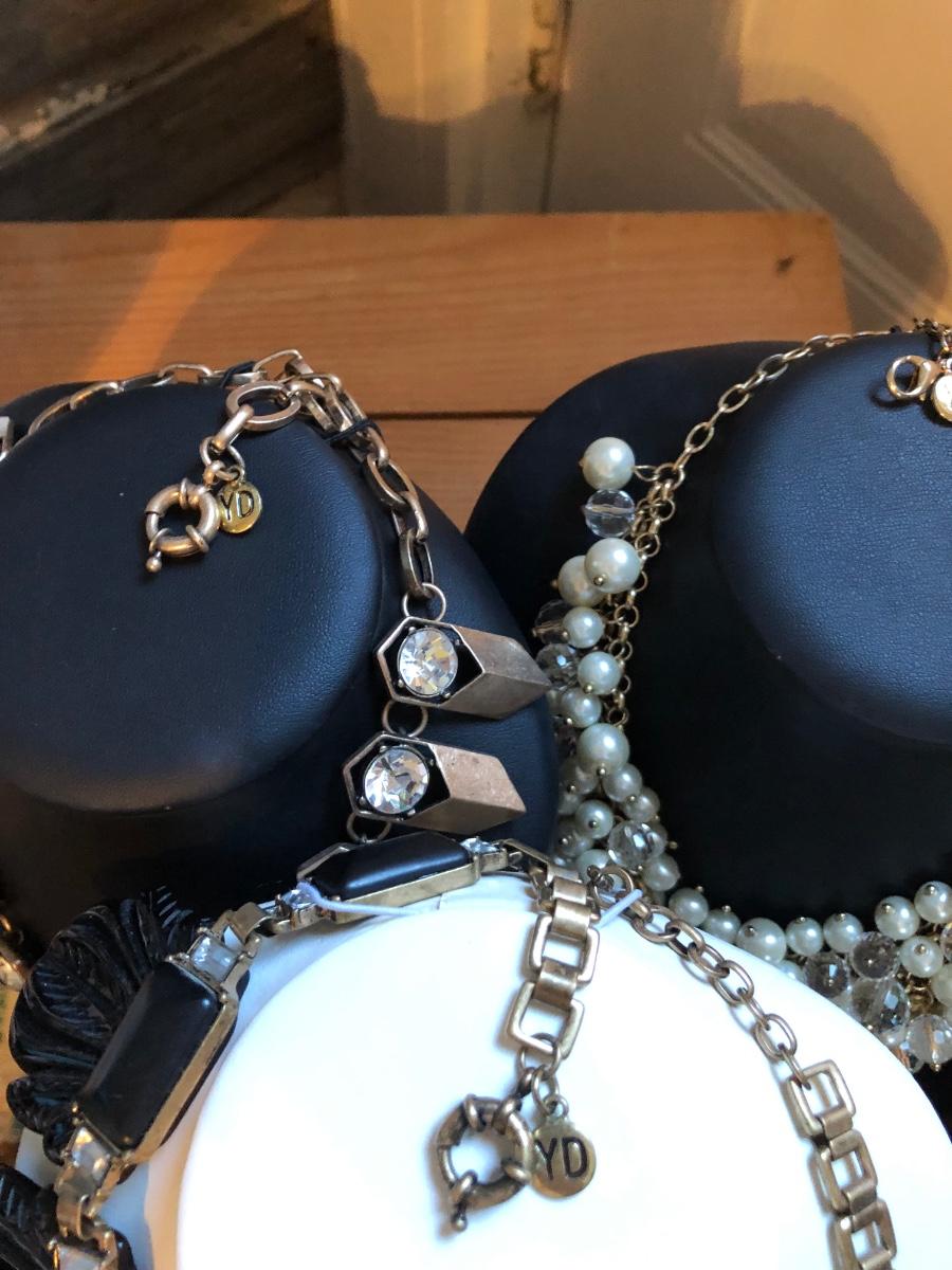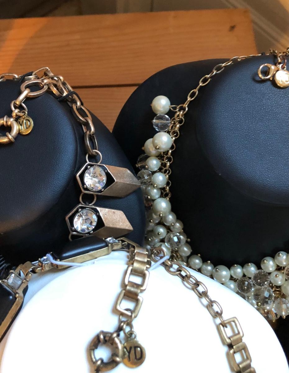 7 of the pieces are from Your Day bridal & 2 necklaces from Lia Sophia. The 2 smaller rings are about a size 7-7.5 & the other is stretchy. Every necklace is adjustable.