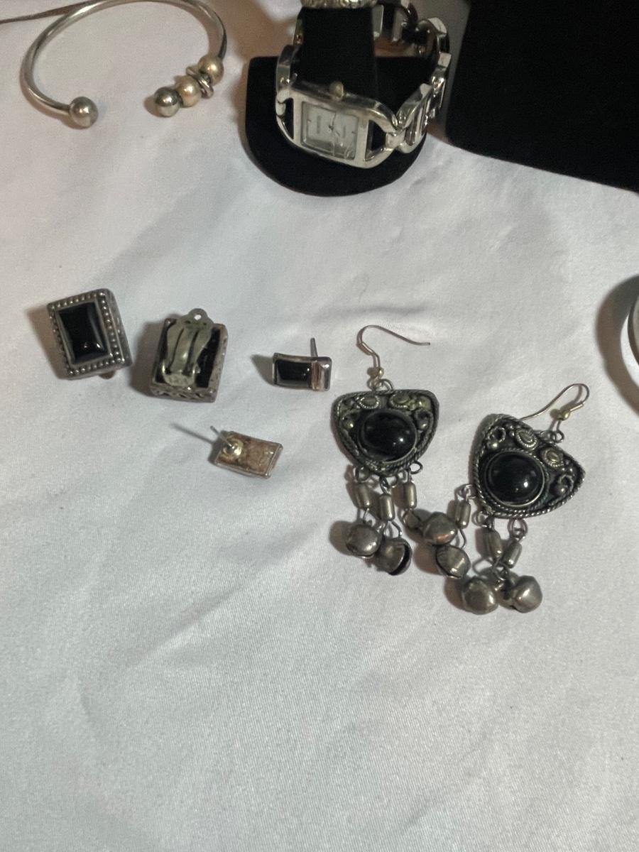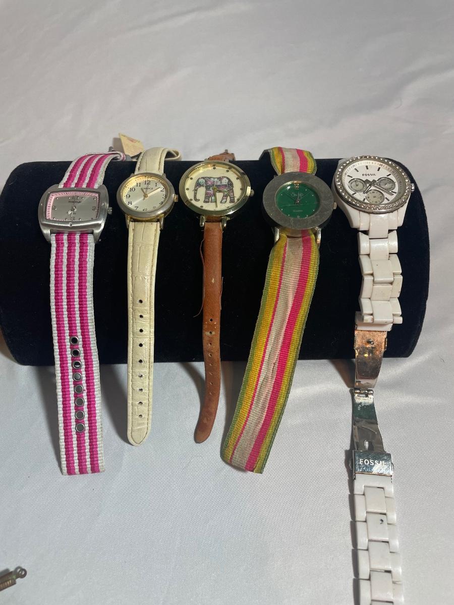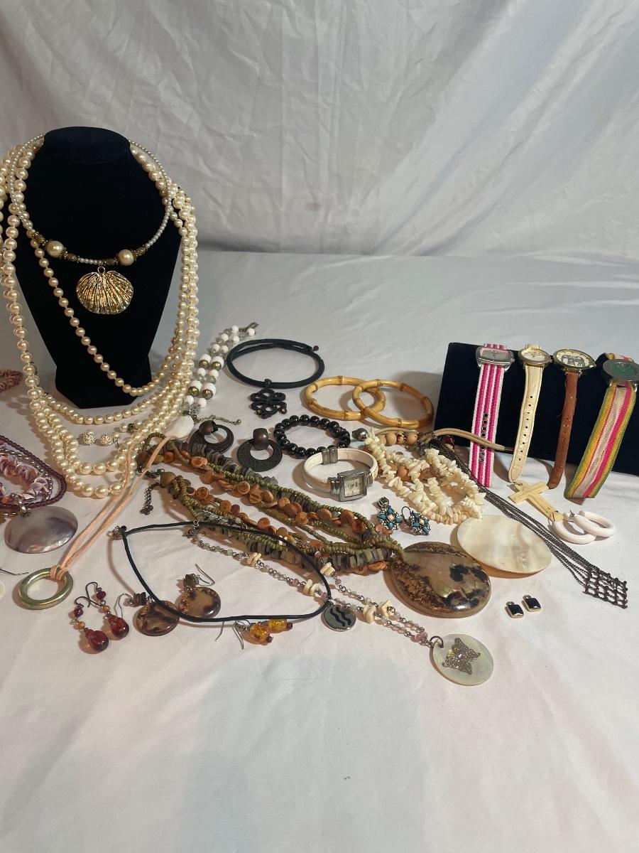 This large lot includes 6 watches Quartz and Fossil (note the band on the Fossil is broken) and more, lots of beaded necklaces, pendants, post earrings, bracelets and more.