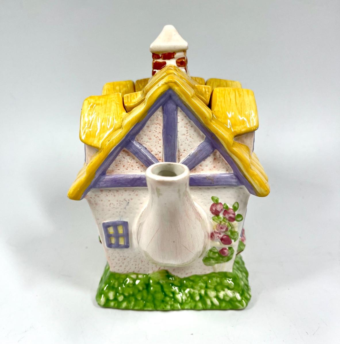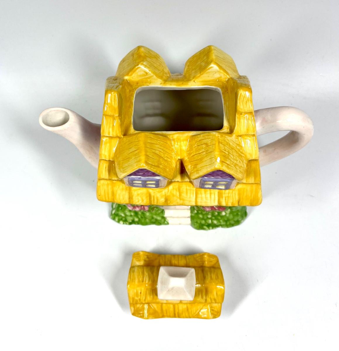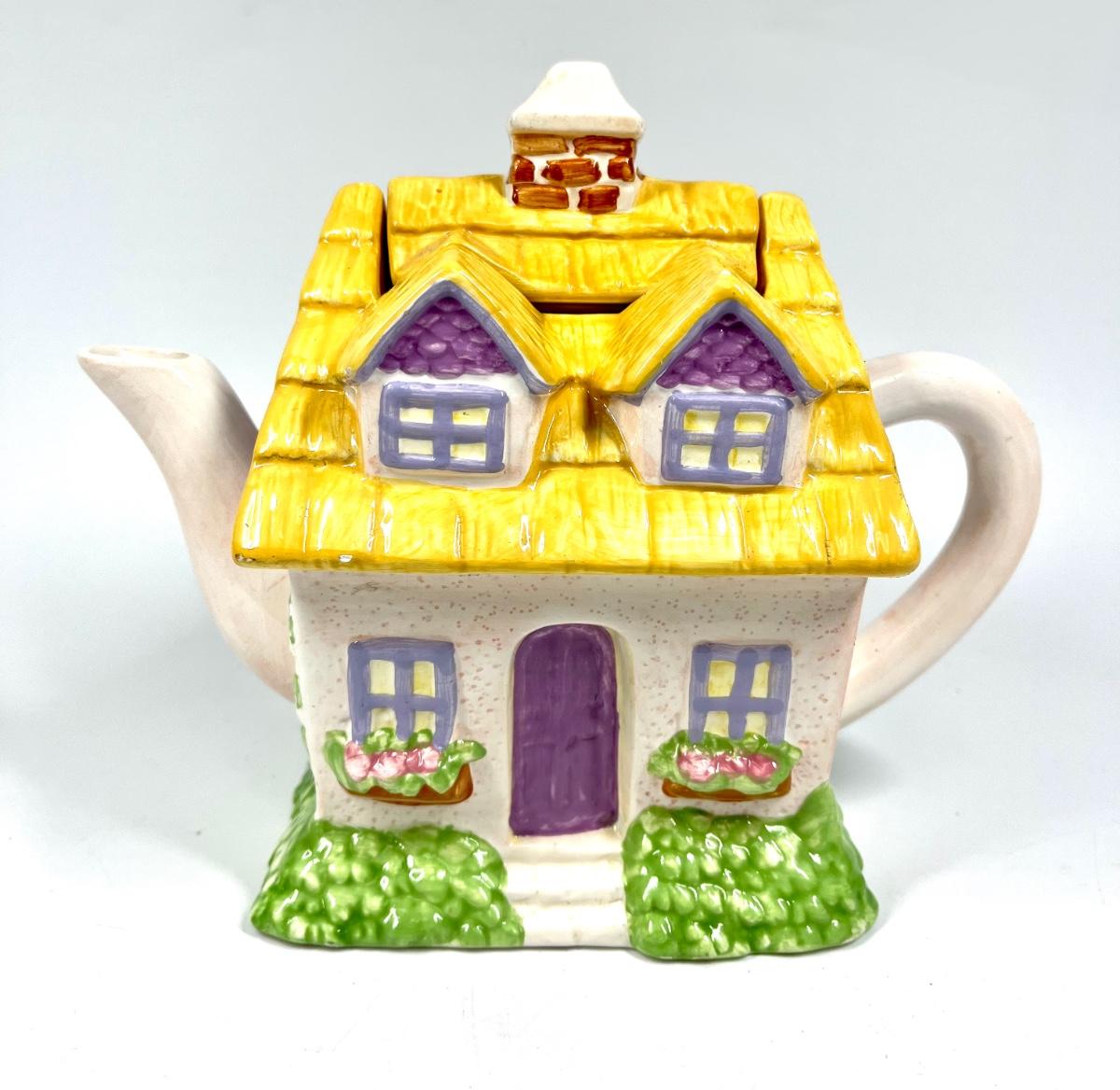 Yellow & White Cottage House Shaped Novelty Ceramic Teapot. In good condition.