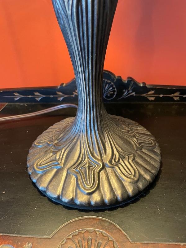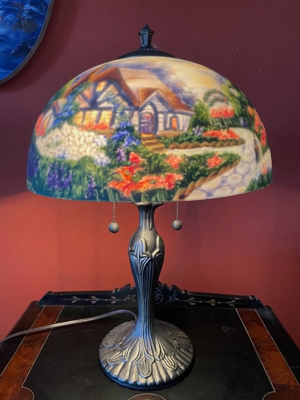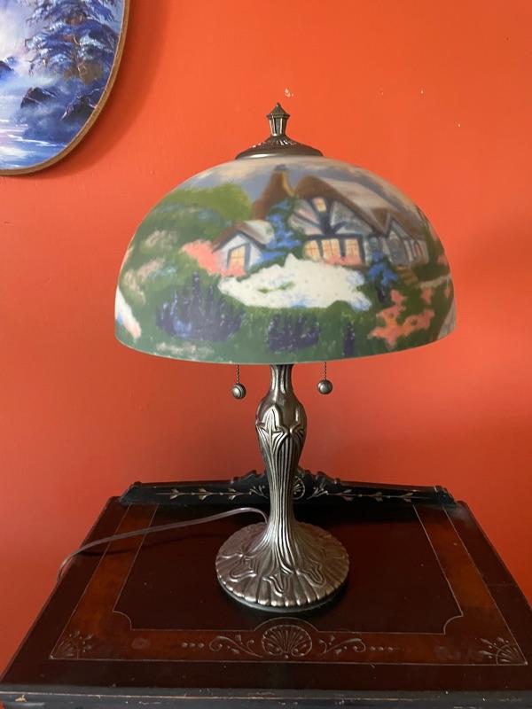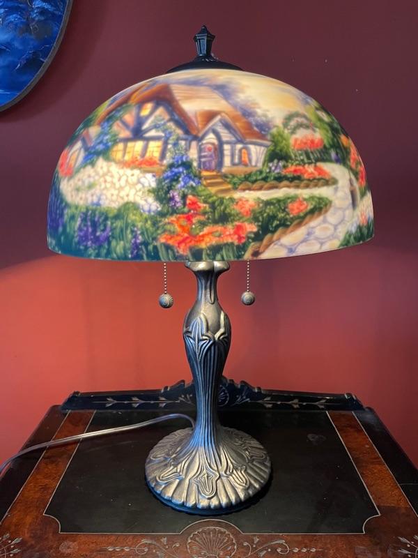 Tall metal lamp with glass shade depicting a cottage scene. Base says “2002. 08” 23” tall, shade diameter: 15”, Base: 7” diameter