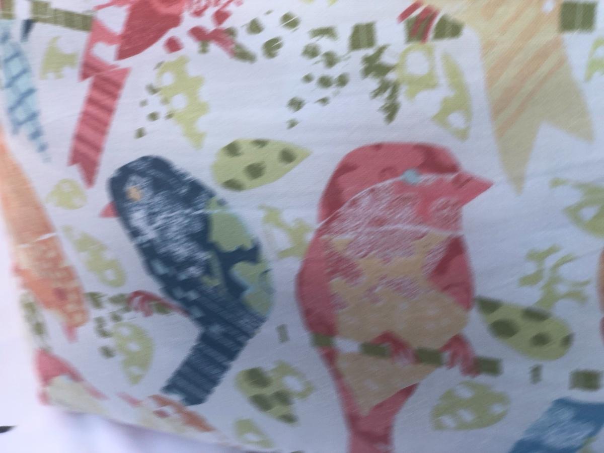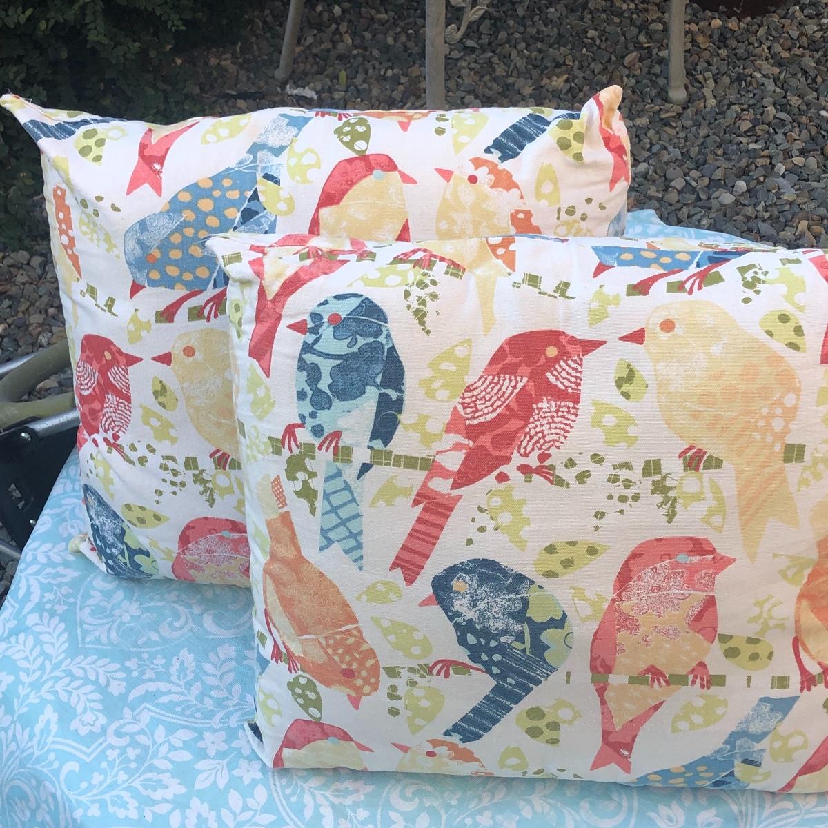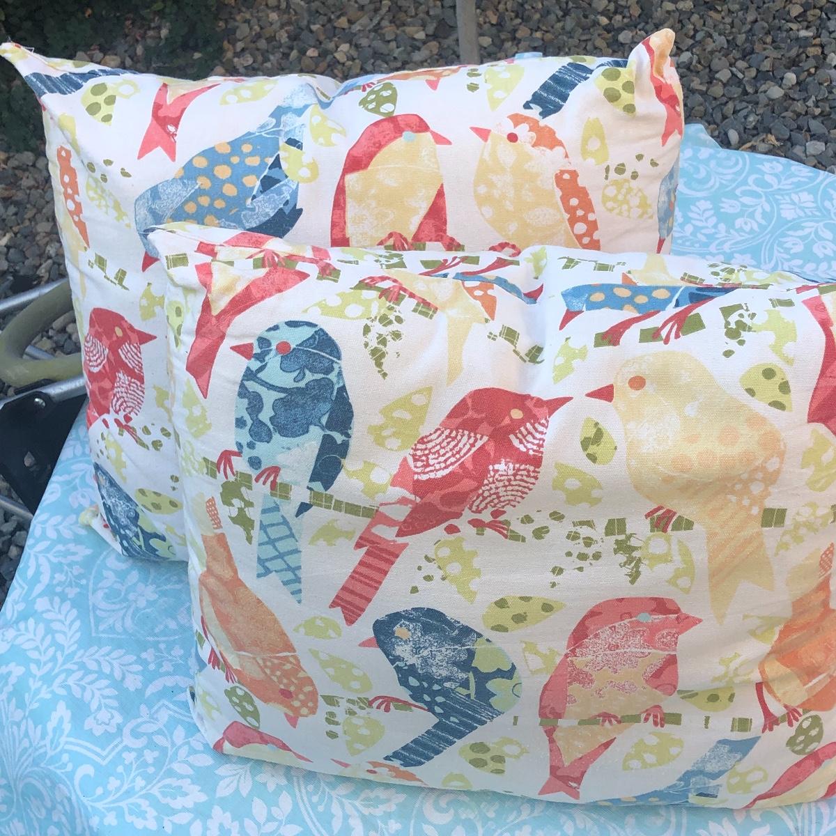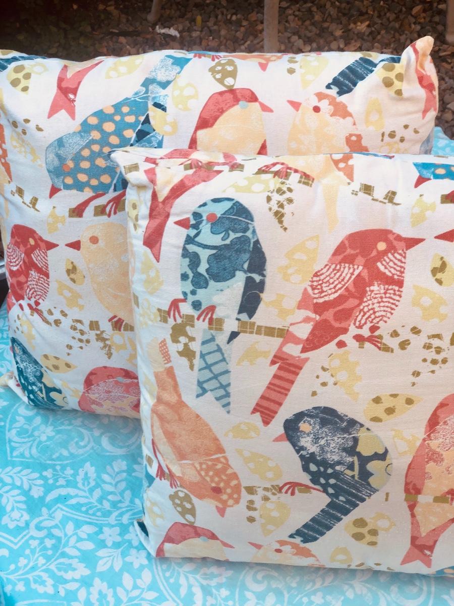 This cute pair of pillows will add a pop of color to your chair or bench. 16” square, filled with non-feather batting, these pillows have pops of blue/orange & green. (Some pilling on the cotton fabric.)