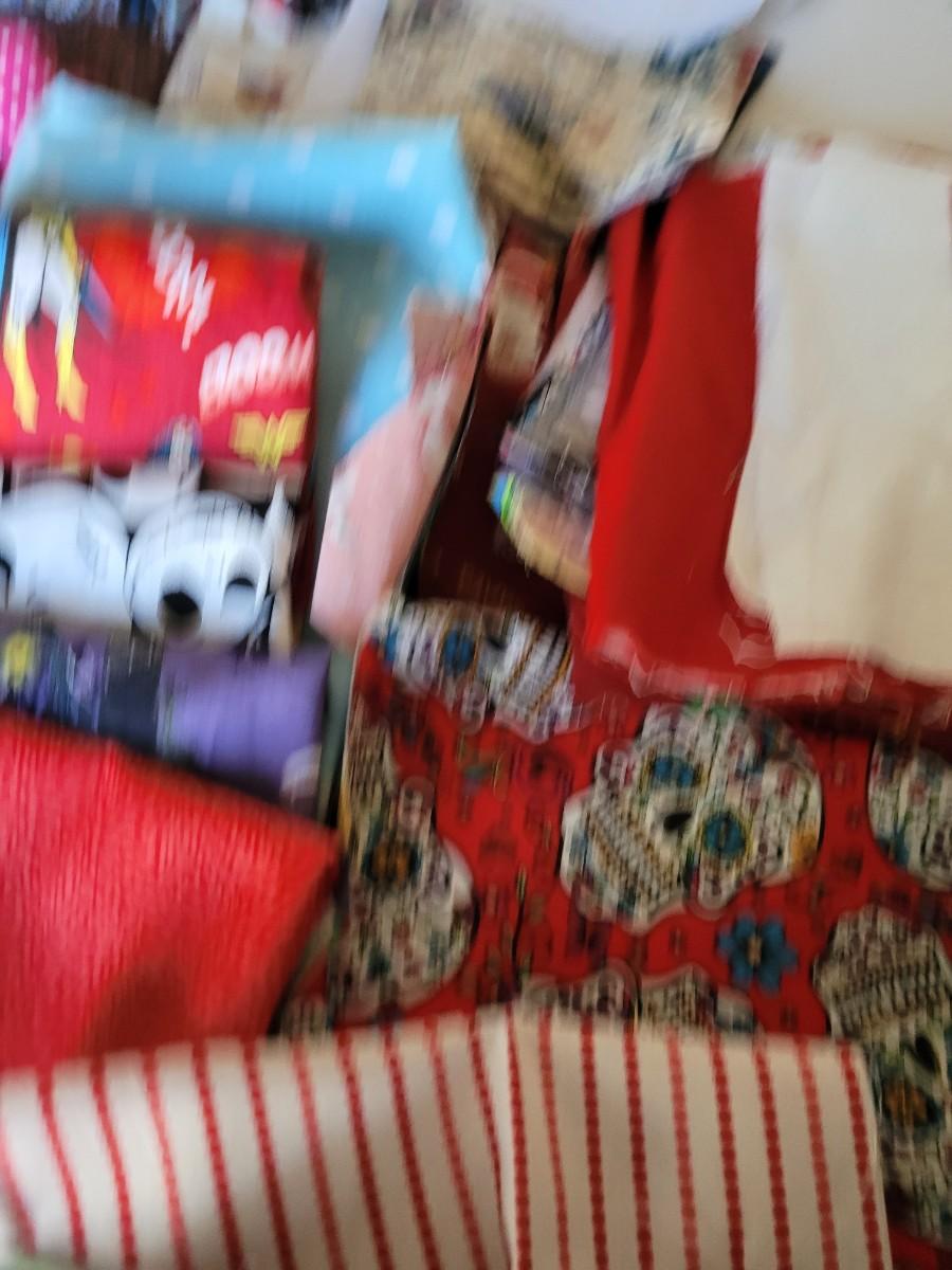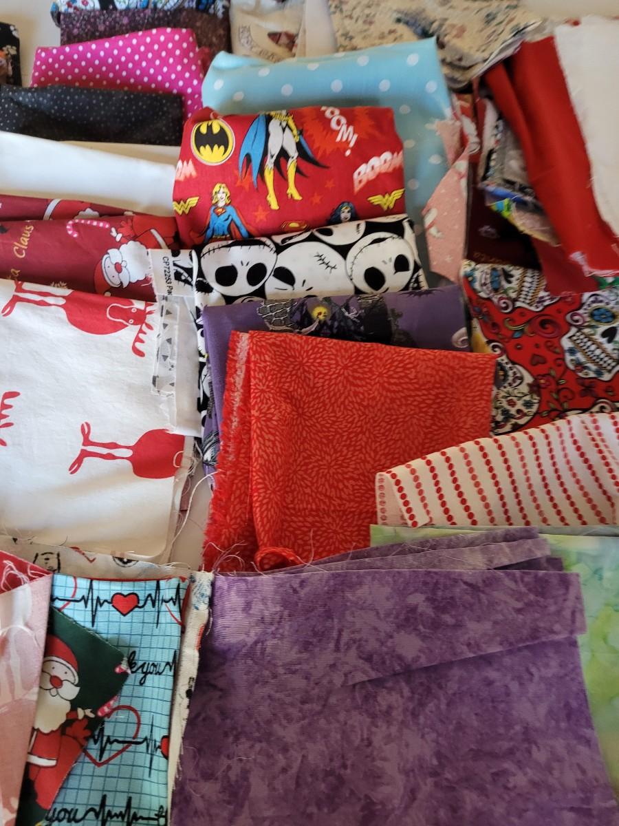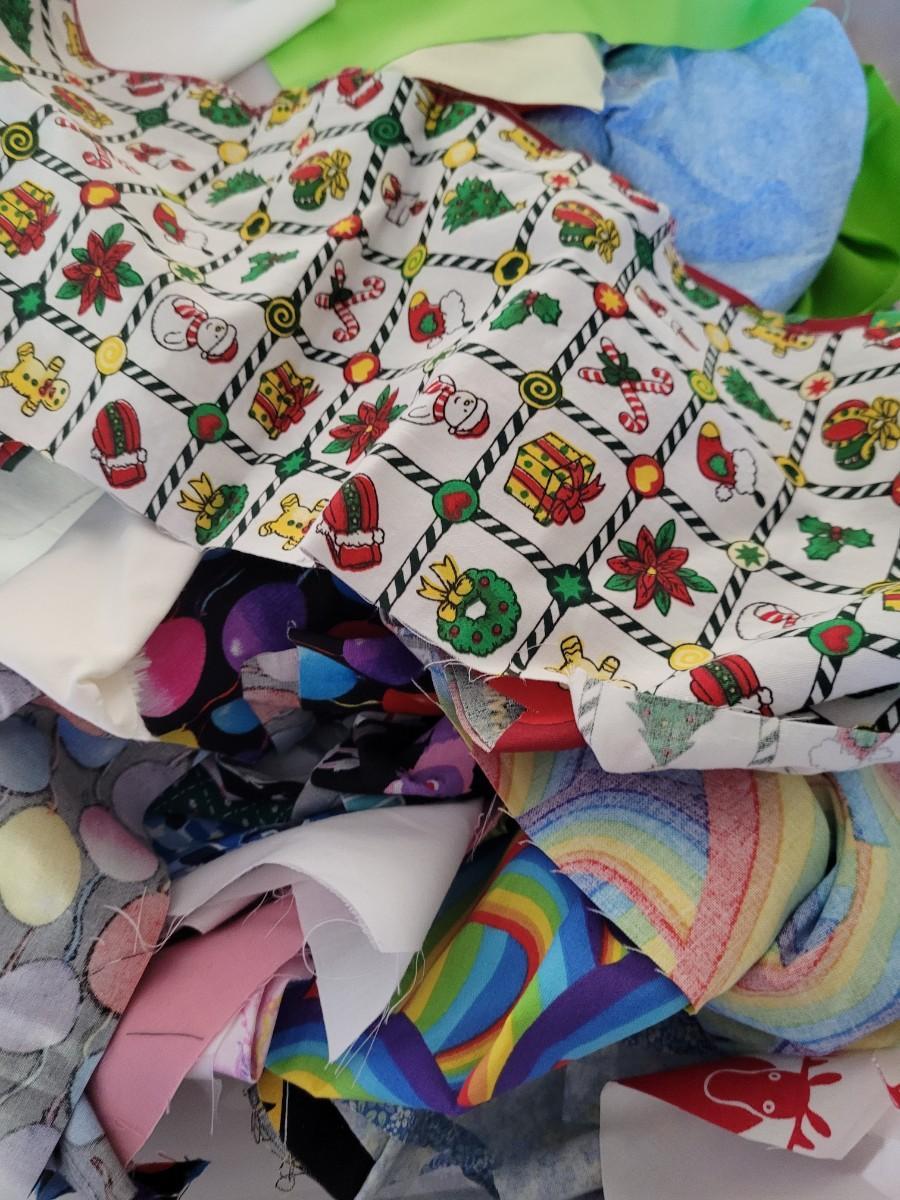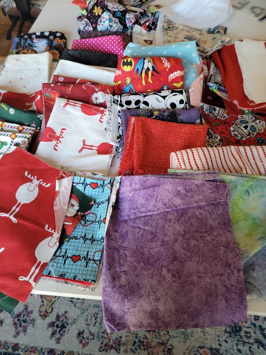 Assorted sizes and designs of pieces left from face masks using fat quarters. cotton med size box