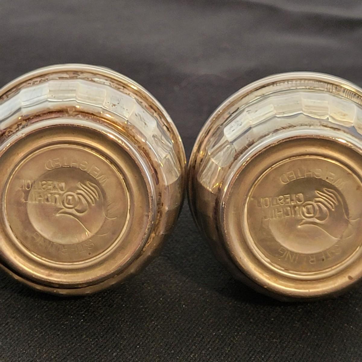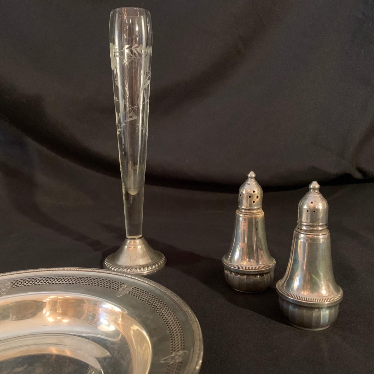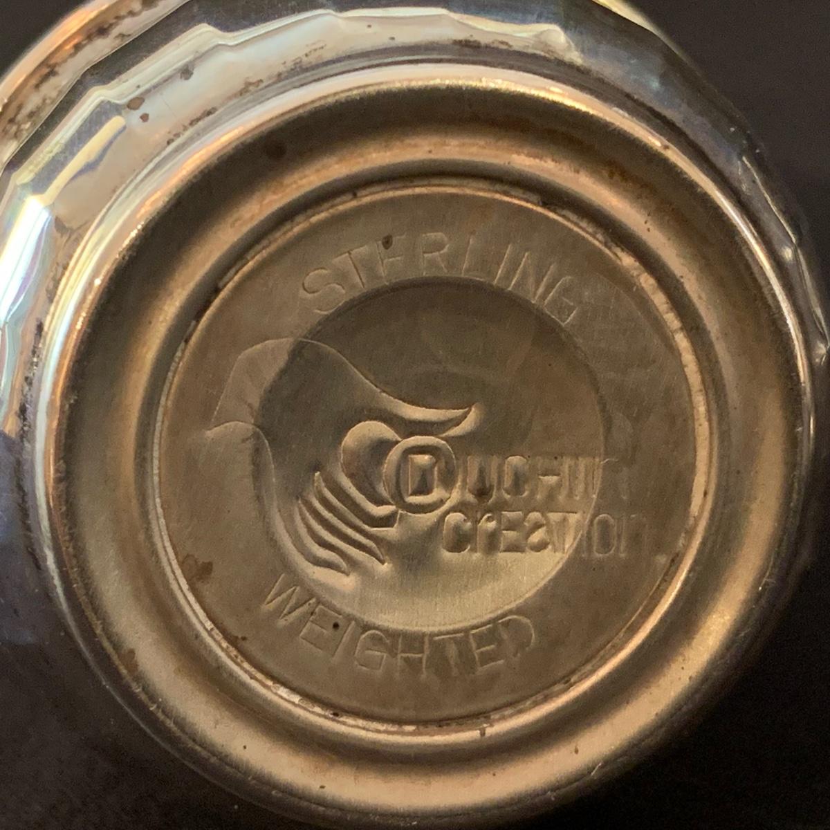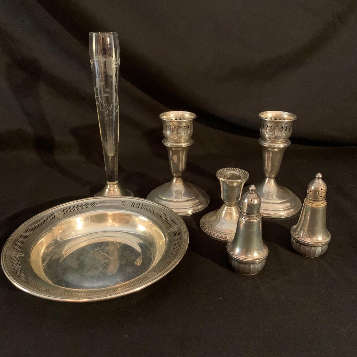 Lovely collection of sterling silver by Duchin Creations and Towle. This lot includes a pair of Towle Sterling weighted candlesticks, a single Duchin Creations weighted candlestick, set of Duchin Creations weighted Salt & Pepper shakers, a glass and weighted sterling silver champagne flute, and a metal bowl with a “K” monogram. Metal bowl measures 8”D x 1.4”H. Champagne flute measures 2.5”D at the base, with a height of 9.5”H. Items have worn with time, but appear to be in good condition.