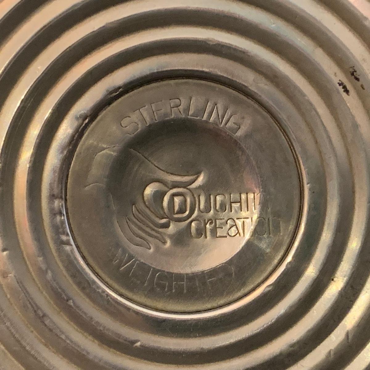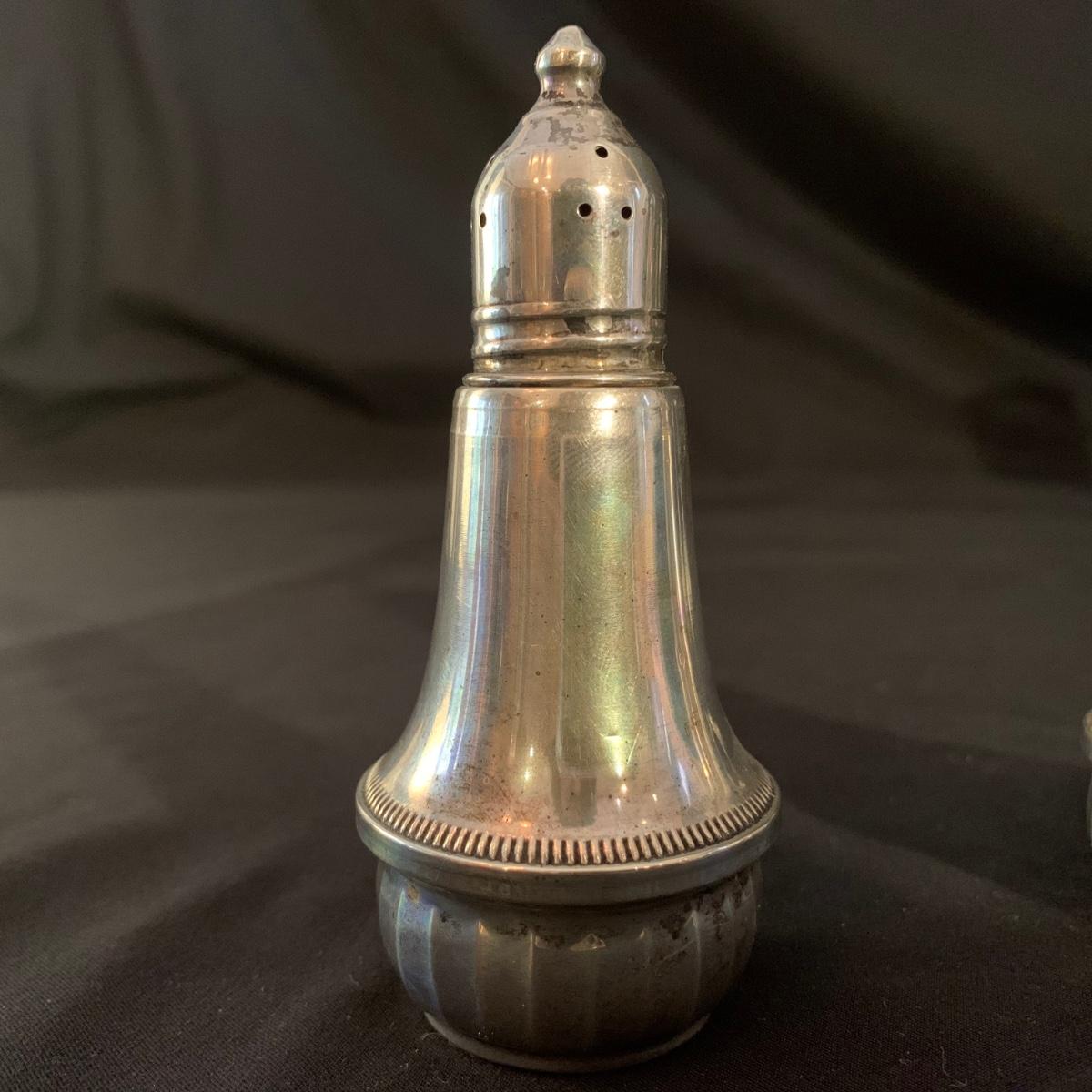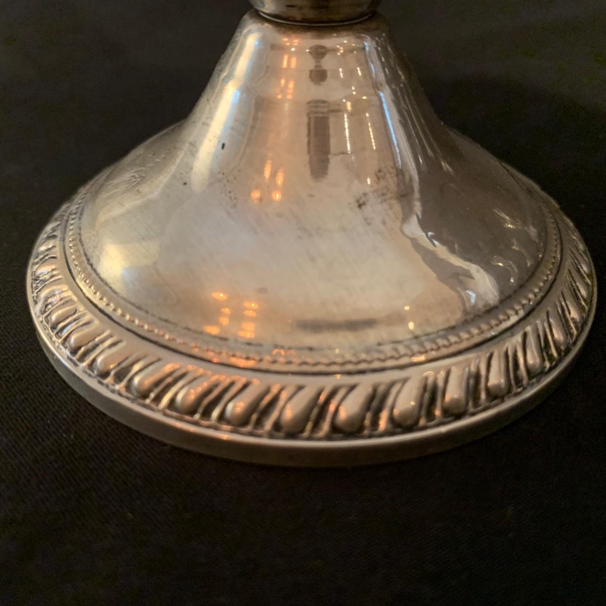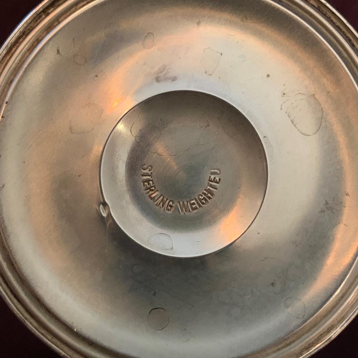 Lovely collection of sterling silver by Duchin Creations and Towle. This lot includes a pair of Towle Sterling weighted candlesticks, a single Duchin Creations weighted candlestick, set of Duchin Creations weighted Salt & Pepper shakers, a glass and weighted sterling silver champagne flute, and a metal bowl with a “K” monogram. Metal bowl measures 8”D x 1.4”H. Champagne flute measures 2.5”D at the base, with a height of 9.5”H. Items have worn with time, but appear to be in good condition.