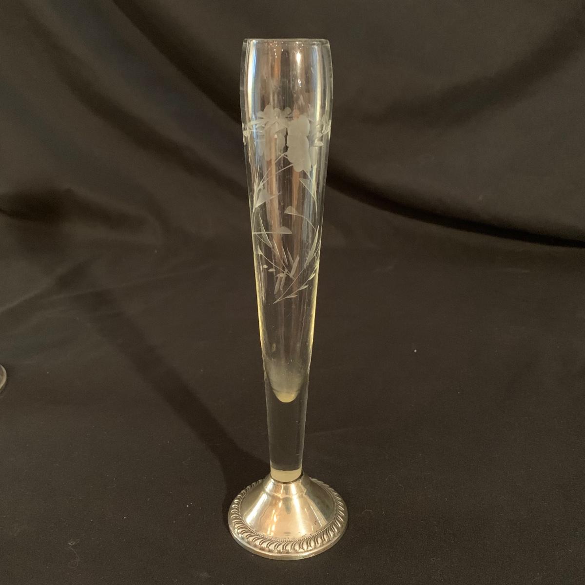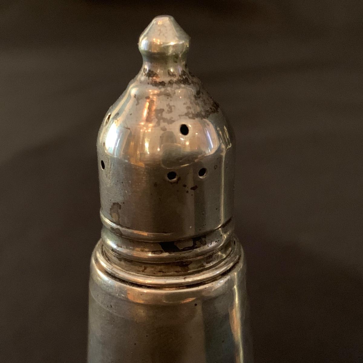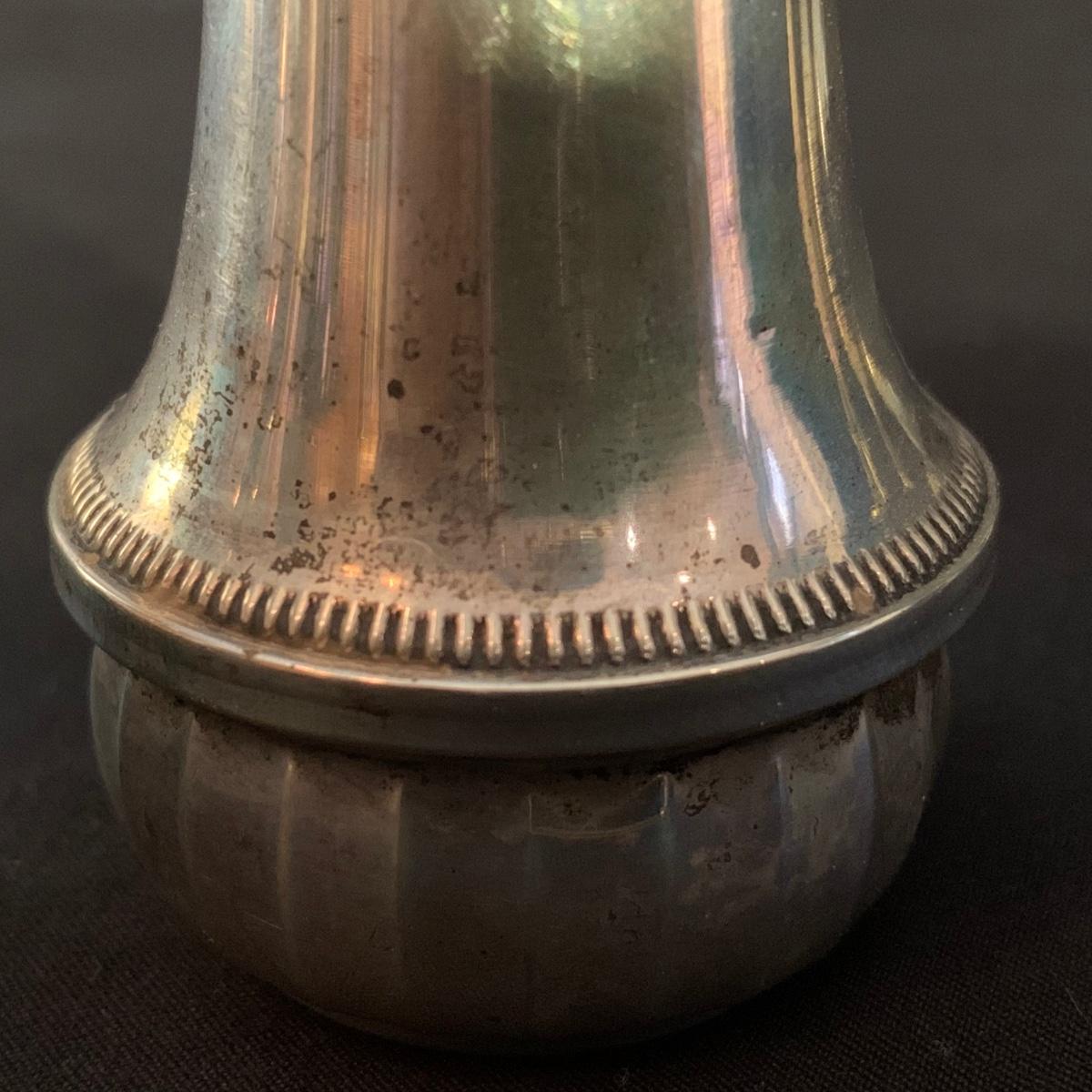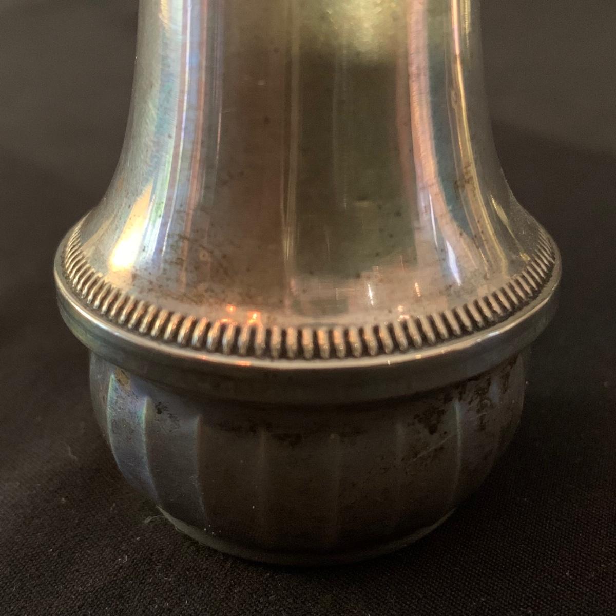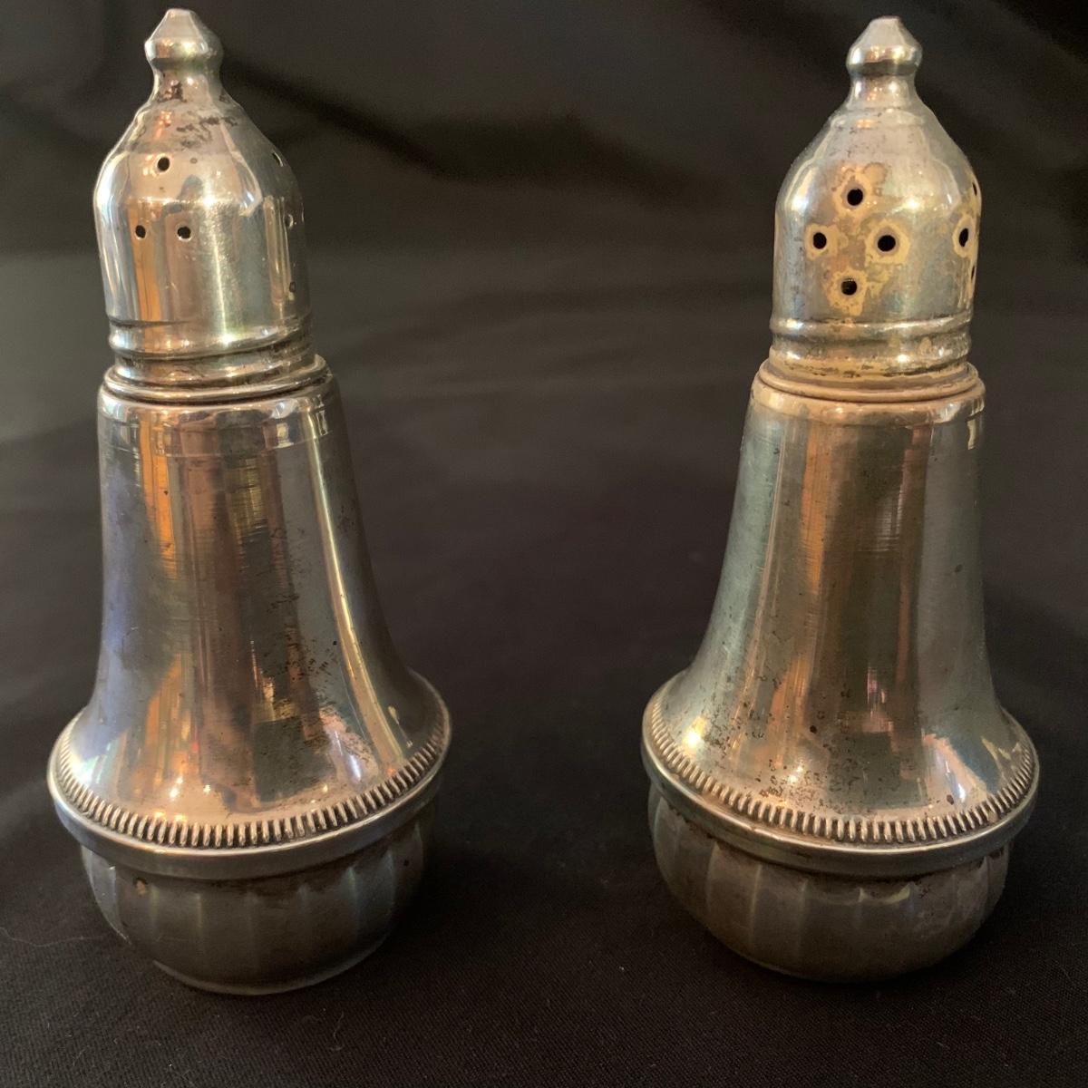 Lovely collection of sterling silver by Duchin Creations and Towle. This lot includes a pair of Towle Sterling weighted candlesticks, a single Duchin Creations weighted candlestick, set of Duchin Creations weighted Salt & Pepper shakers, a glass and weighted sterling silver champagne flute, and a metal bowl with a “K” monogram. Metal bowl measures 8”D x 1.4”H. Champagne flute measures 2.5”D at the base, with a height of 9.5”H. Items have worn with time, but appear to be in good condition.