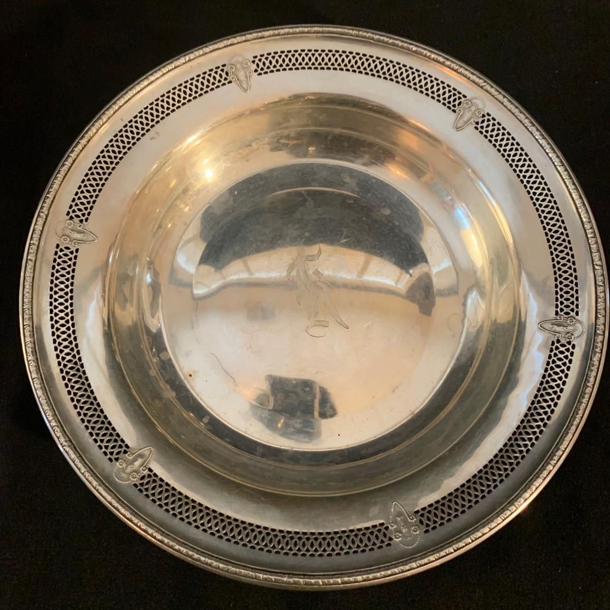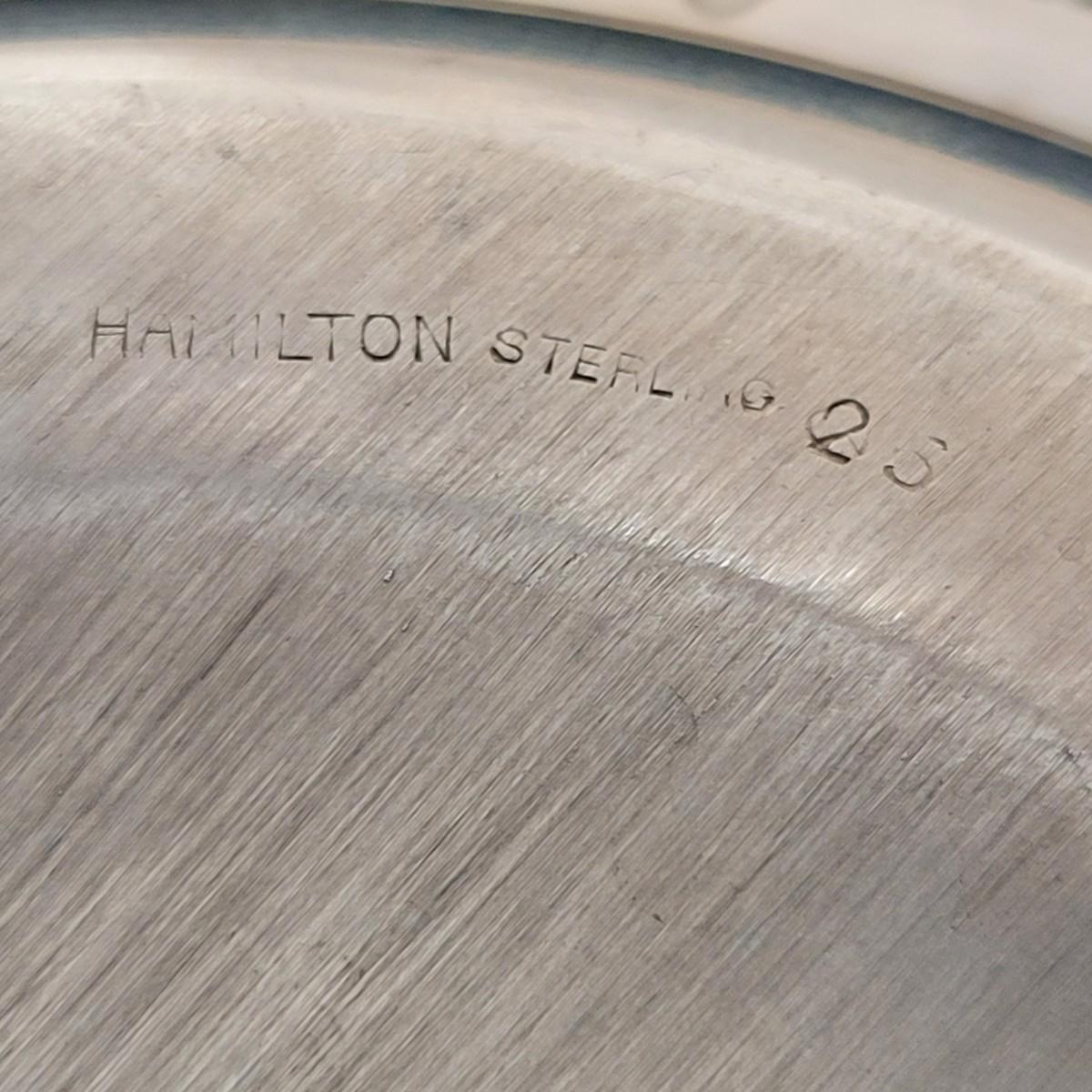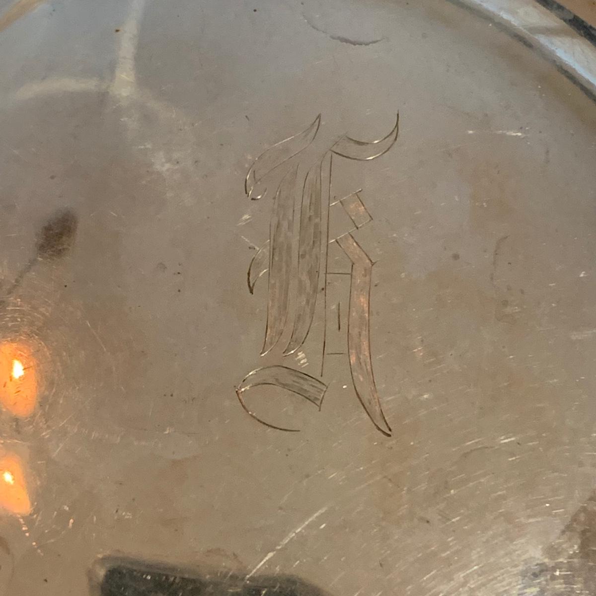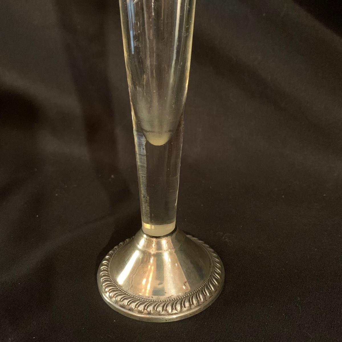Lovely collection of sterling silver by Duchin Creations and Towle. This lot includes a pair of Towle Sterling weighted candlesticks, a single Duchin Creations weighted candlestick, set of Duchin Creations weighted Salt & Pepper shakers, a glass and weighted sterling silver champagne flute, and a metal bowl with a “K” monogram. Metal bowl measures 8”D x 1.4”H. Champagne flute measures 2.5”D at the base, with a height of 9.5”H. Items have worn with time, but appear to be in good condition.