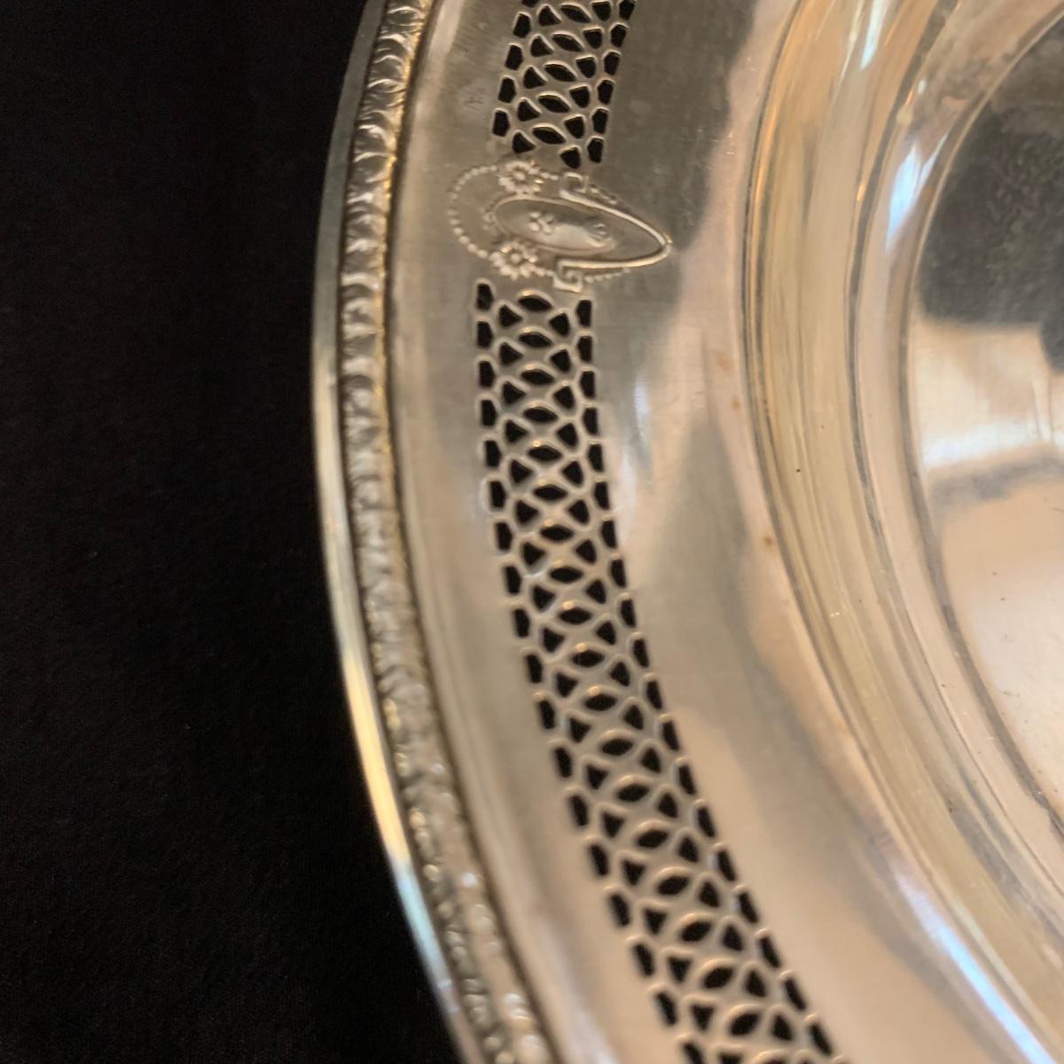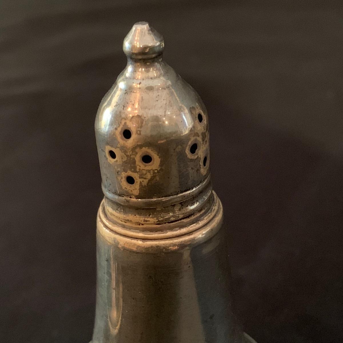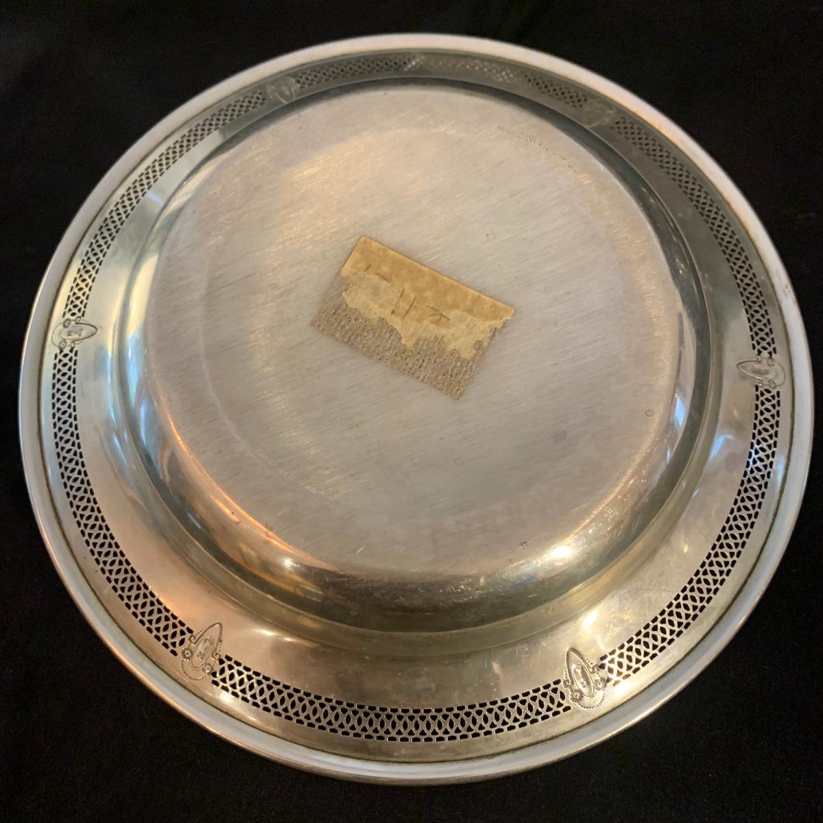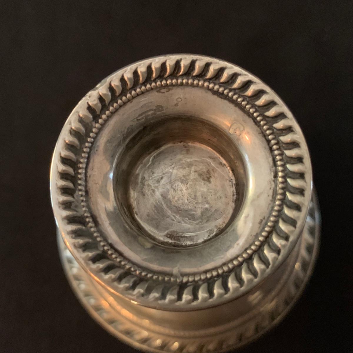 Lovely collection of sterling silver by Duchin Creations and Towle. This lot includes a pair of Towle Sterling weighted candlesticks, a single Duchin Creations weighted candlestick, set of Duchin Creations weighted Salt & Pepper shakers, a glass and weighted sterling silver champagne flute, and a metal bowl with a “K” monogram. Metal bowl measures 8”D x 1.4”H. Champagne flute measures 2.5”D at the base, with a height of 9.5”H. Items have worn with time, but appear to be in good condition.