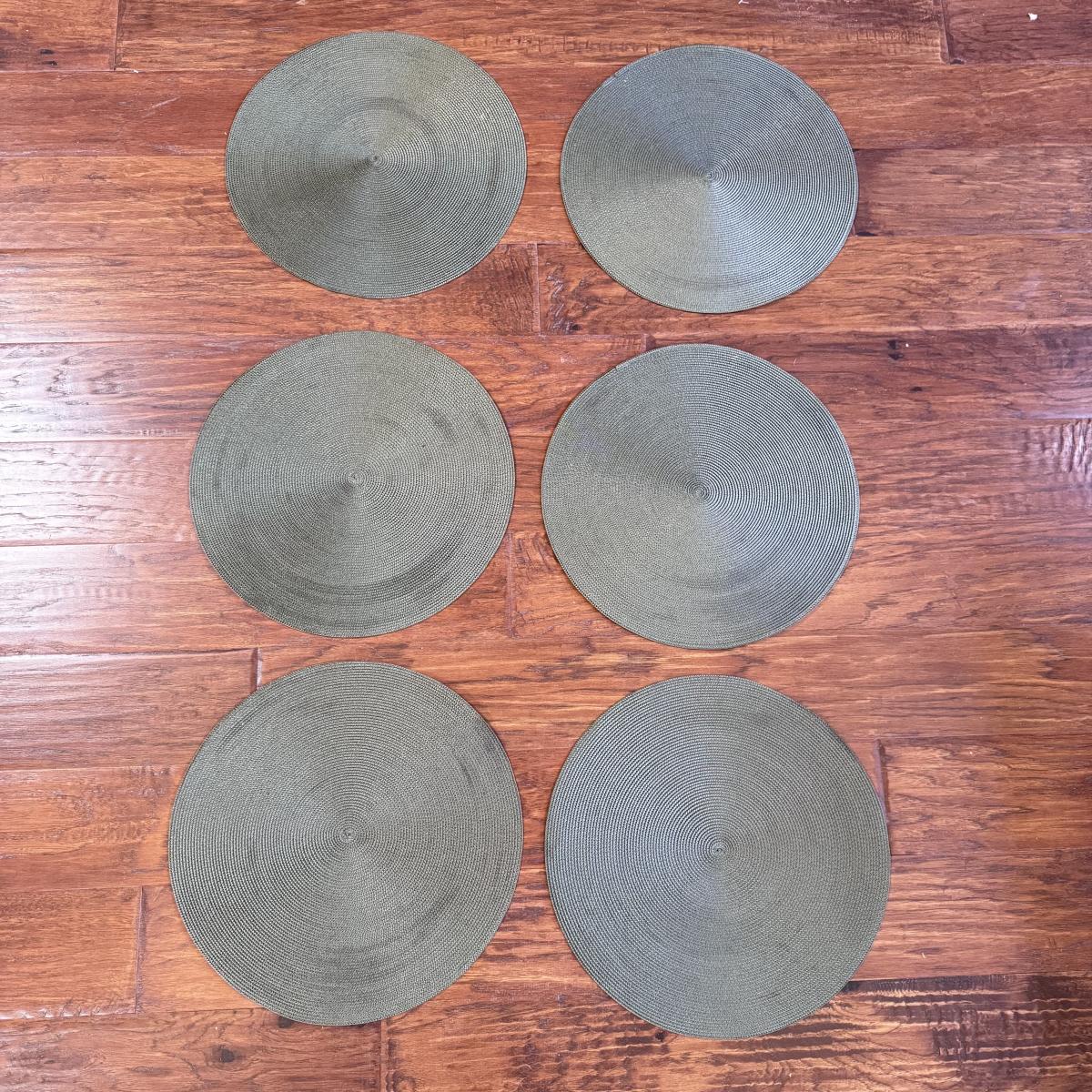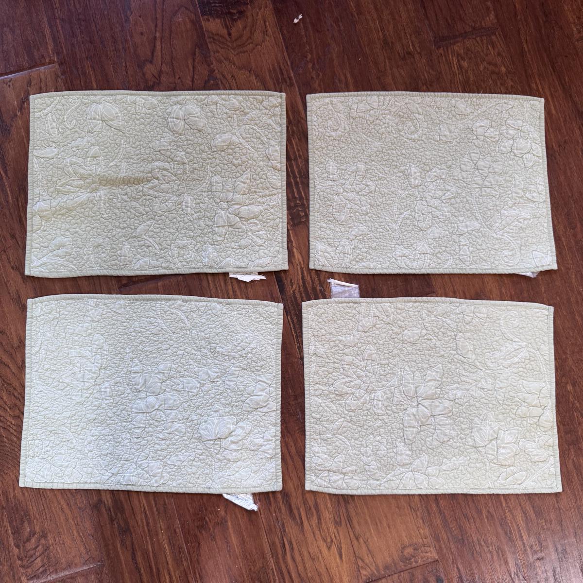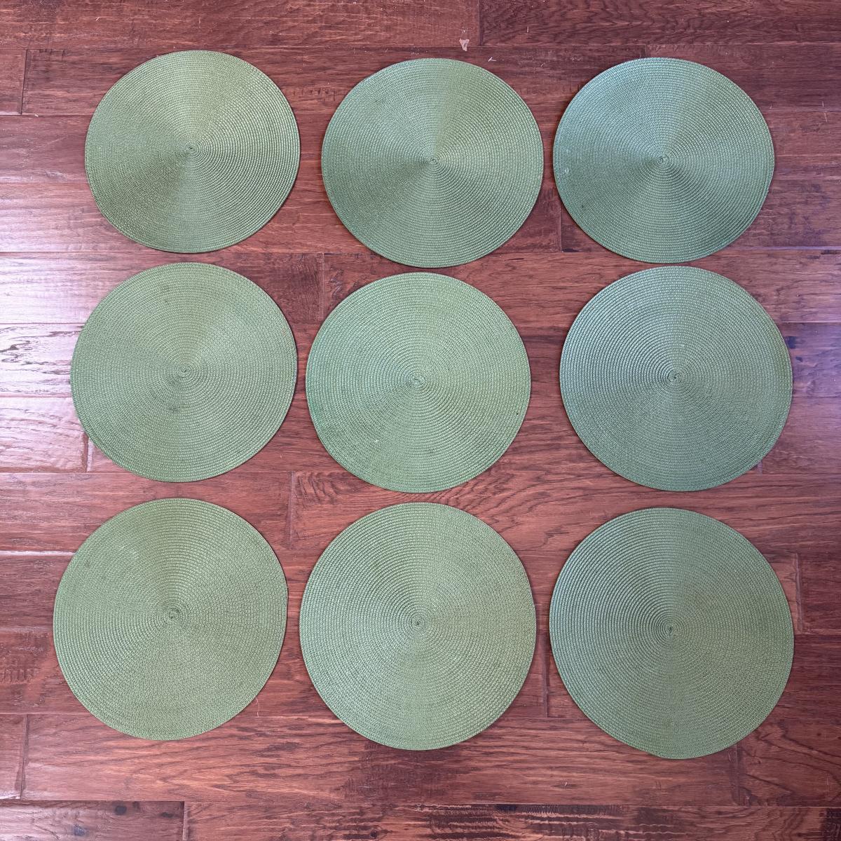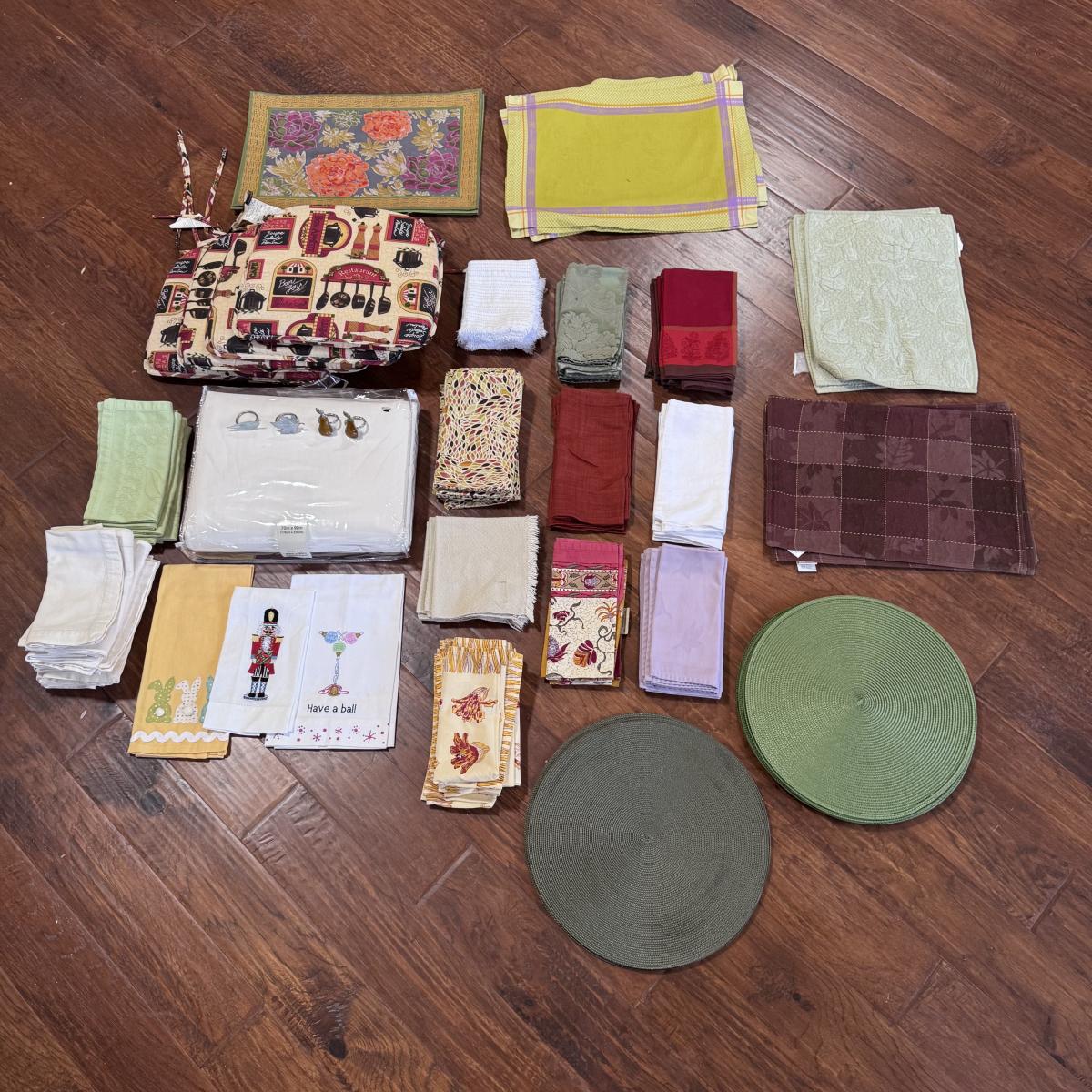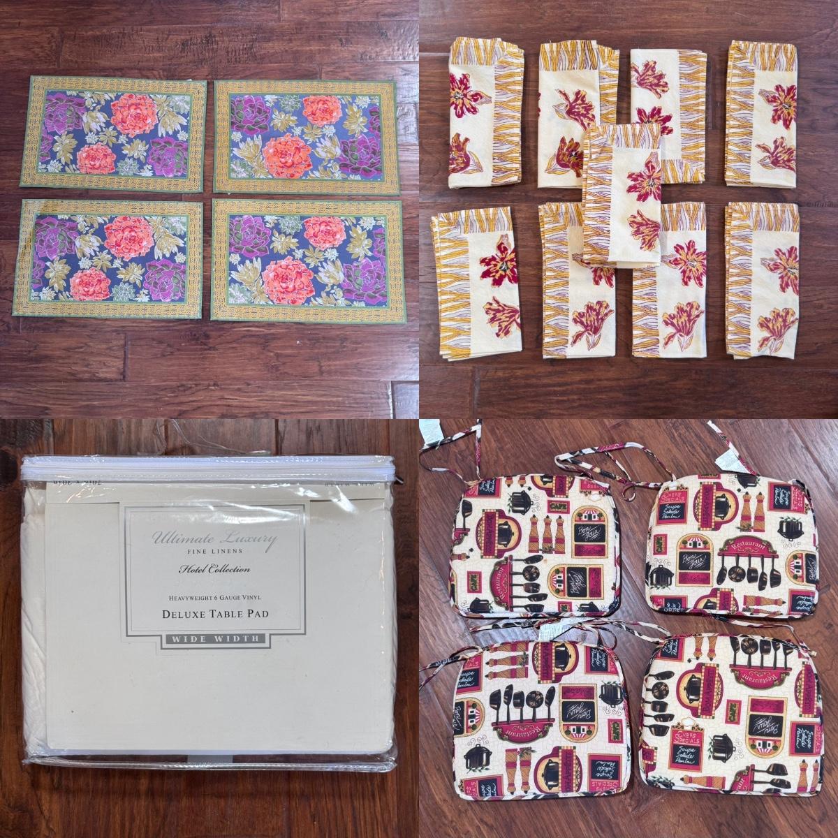 This lot includes six dark green circular placemats, nine light green circular placemats, four World Market placemats, several linens from Couleur Nature, a deluxe table pad by Ultimate Luxury Fine Linens, and more. See pictures for all items in this lot. The light green circular placemats have a stain on one of them - see picture included. The seat cushions individually measure 15” x 13”H. The table pad measures 90” x 70”H. Shipping available.