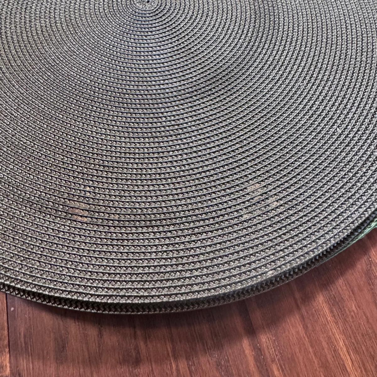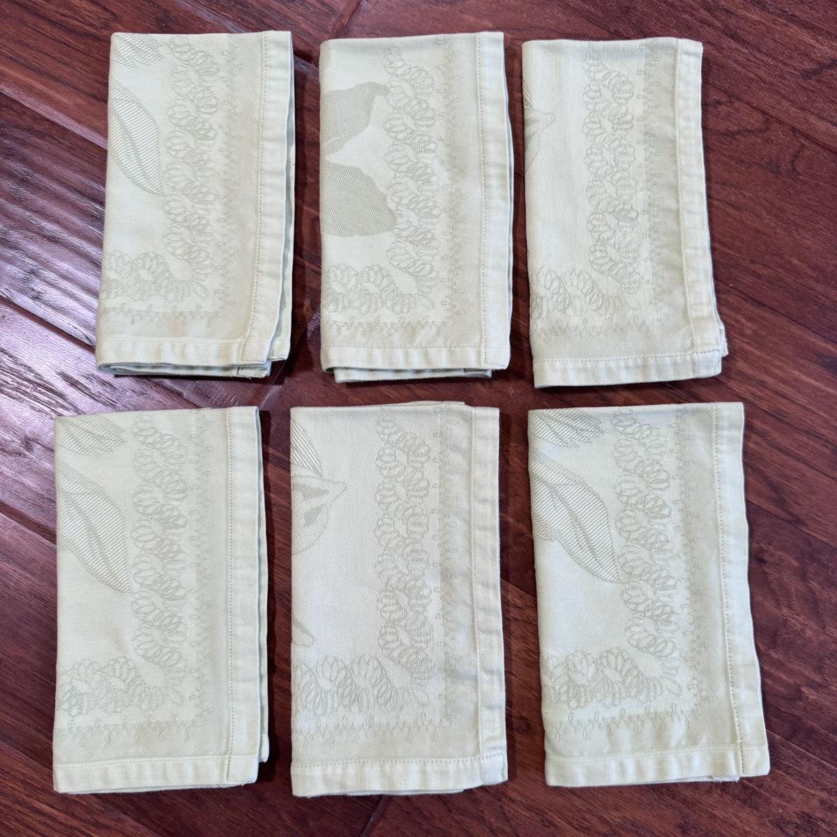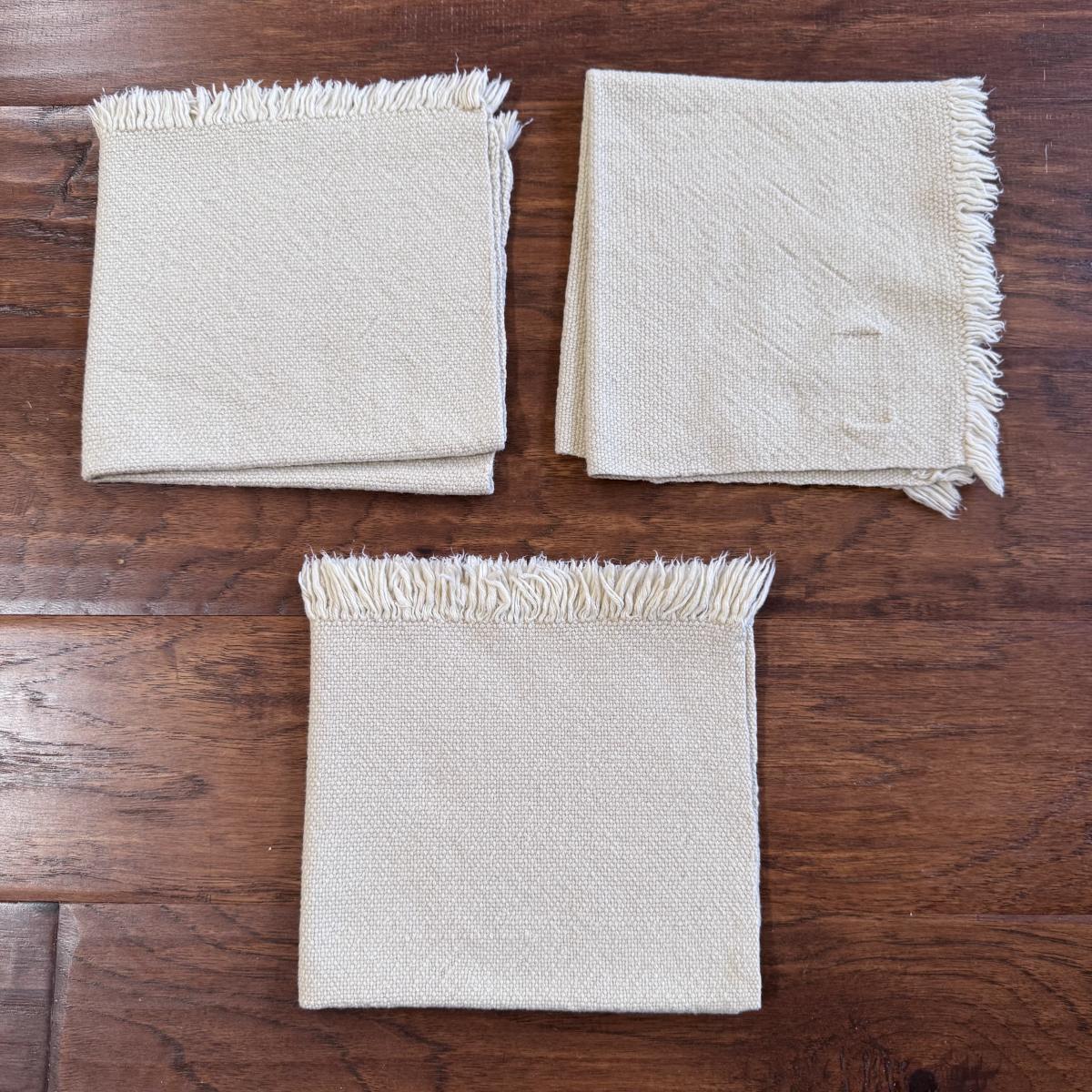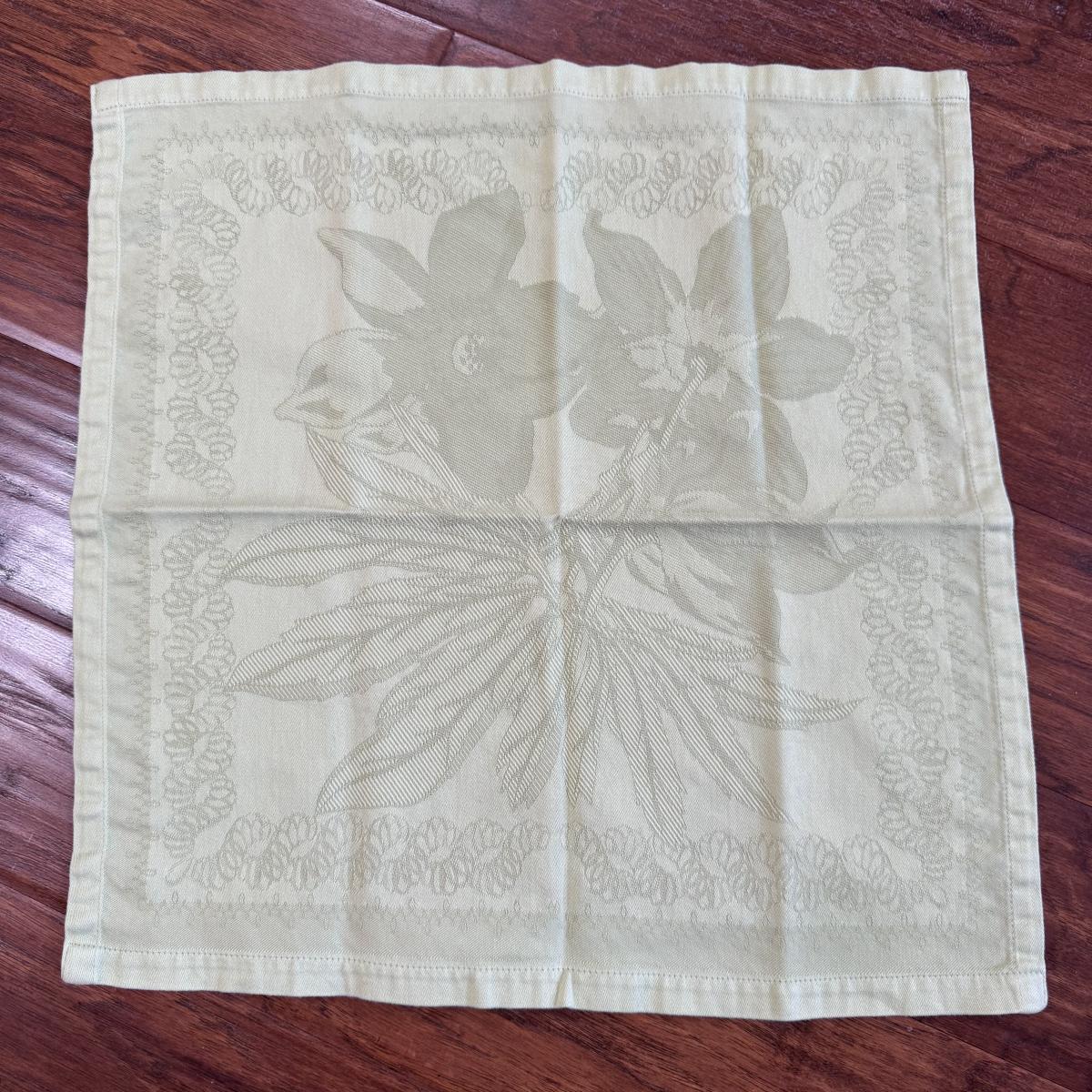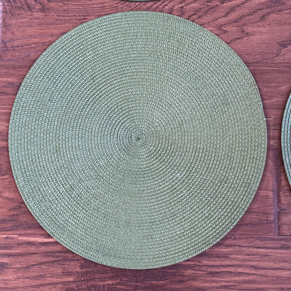 This lot includes six dark green circular placemats, nine light green circular placemats, four World Market placemats, several linens from Couleur Nature, a deluxe table pad by Ultimate Luxury Fine Linens, and more. See pictures for all items in this lot. The light green circular placemats have a stain on one of them - see picture included. The seat cushions individually measure 15” x 13”H. The table pad measures 90” x 70”H. Shipping available.