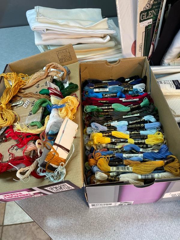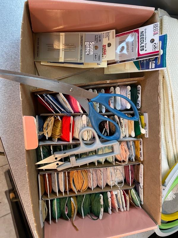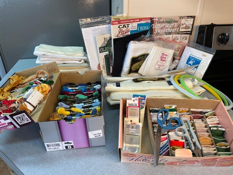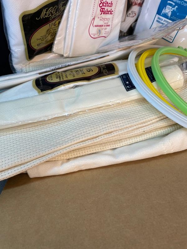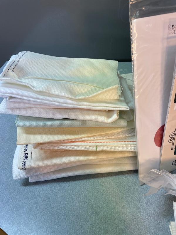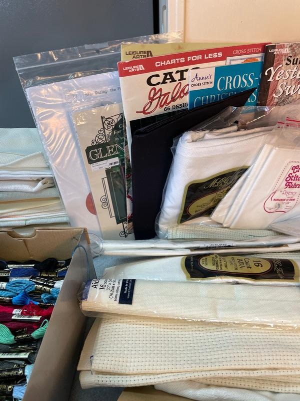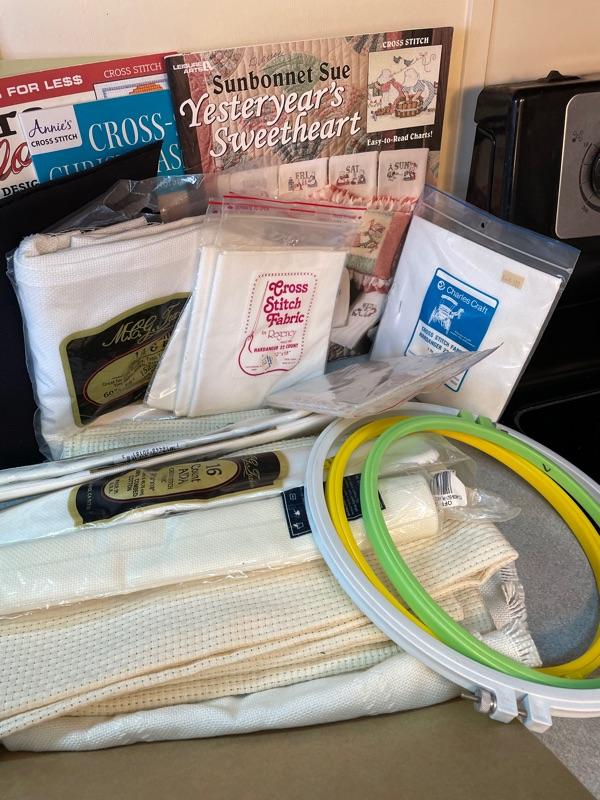 Cross Stitch canvas, embroidery floss, hoops, pattern book