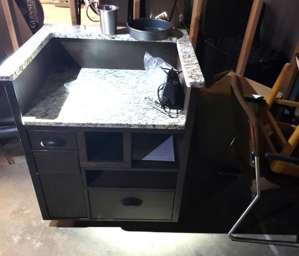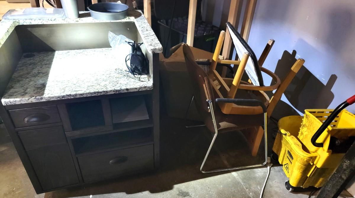 Counter, 38" x 26.5", 2 chairs, wall brackets and mop bucket