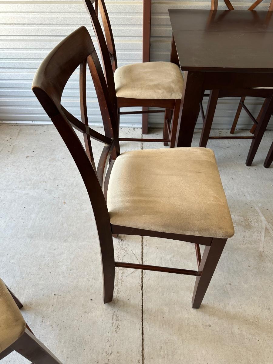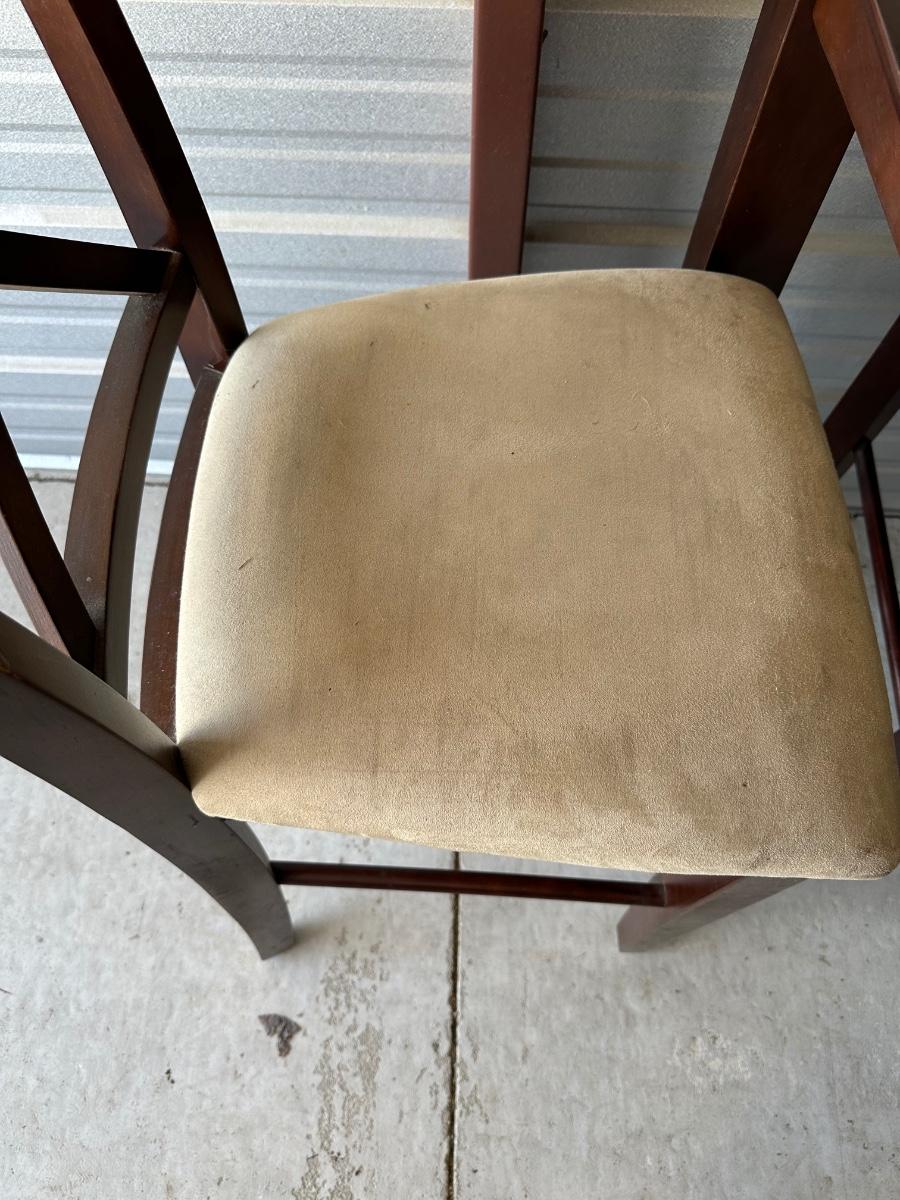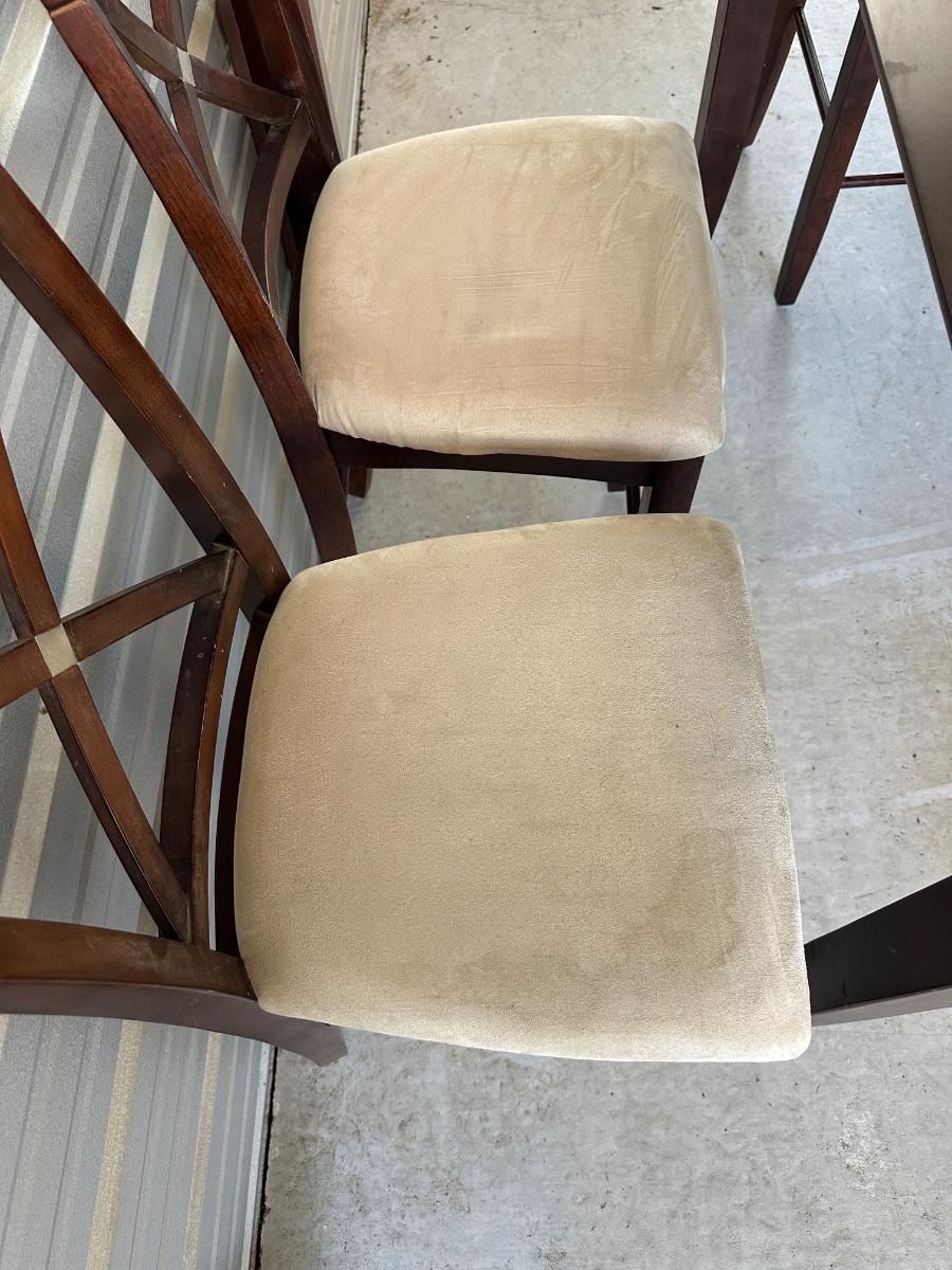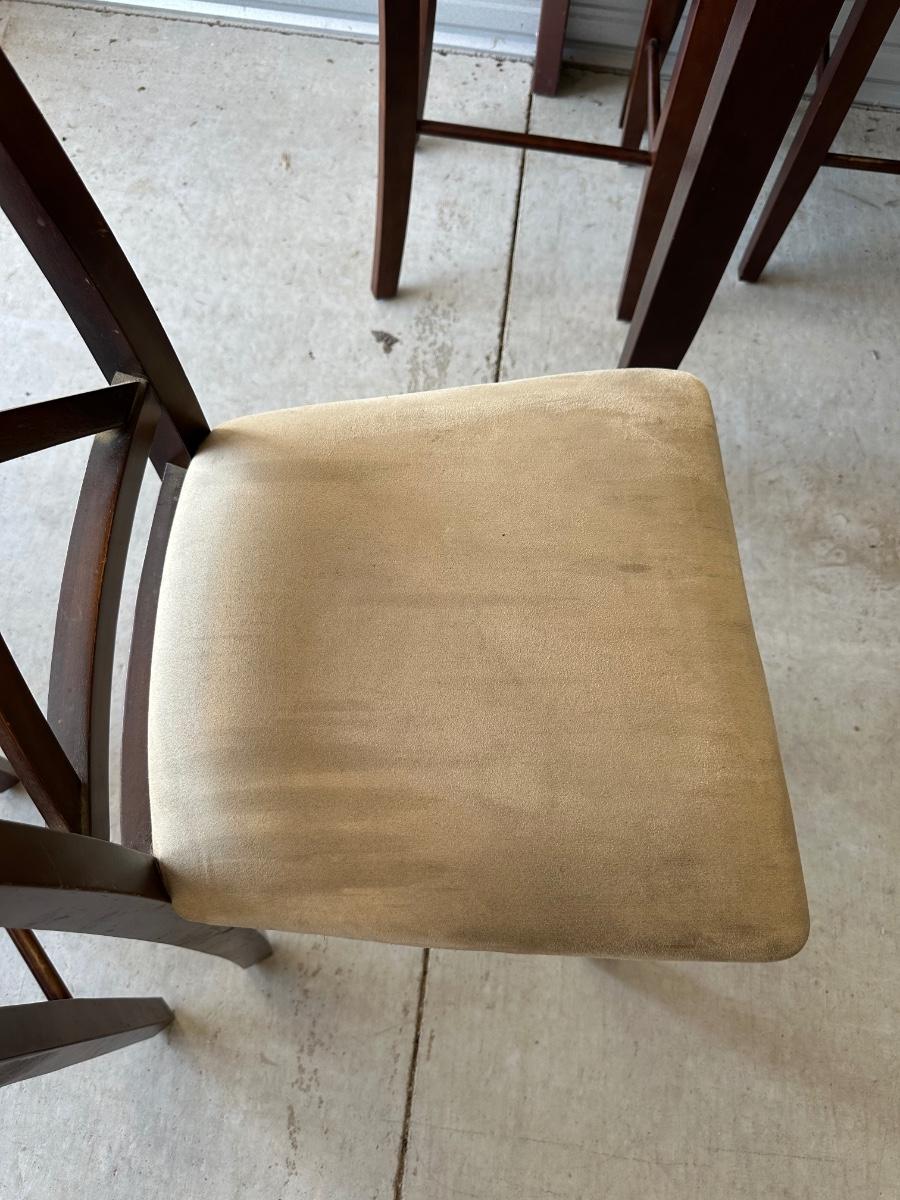 THE CHAIR SEATS ARE A BIT SOILED, THEY ARE MICROFIBER ARE SHOULD CLEAN UP WELL WITH A SOAPY CLOTH. OR CHANGING THE MATERIAL IS SO EASY.