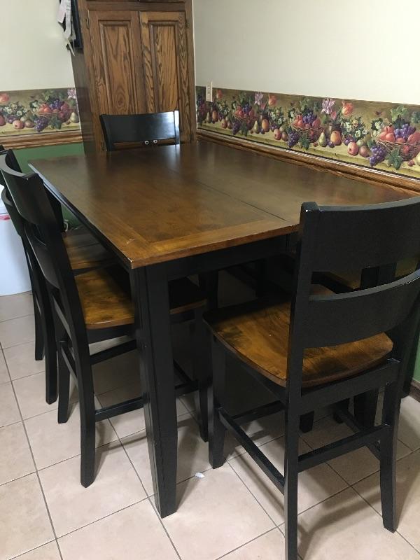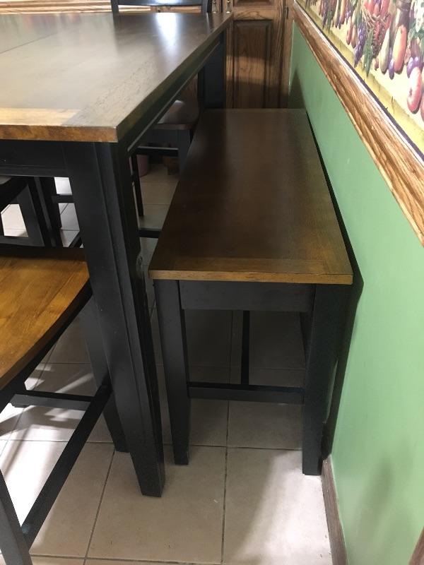 36” high and wide and 54” long. Comes with one leaf. 4 chairs and one bench.