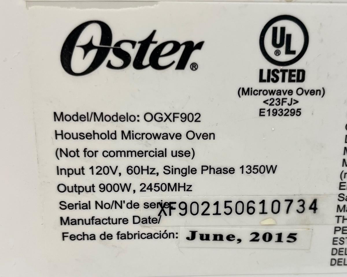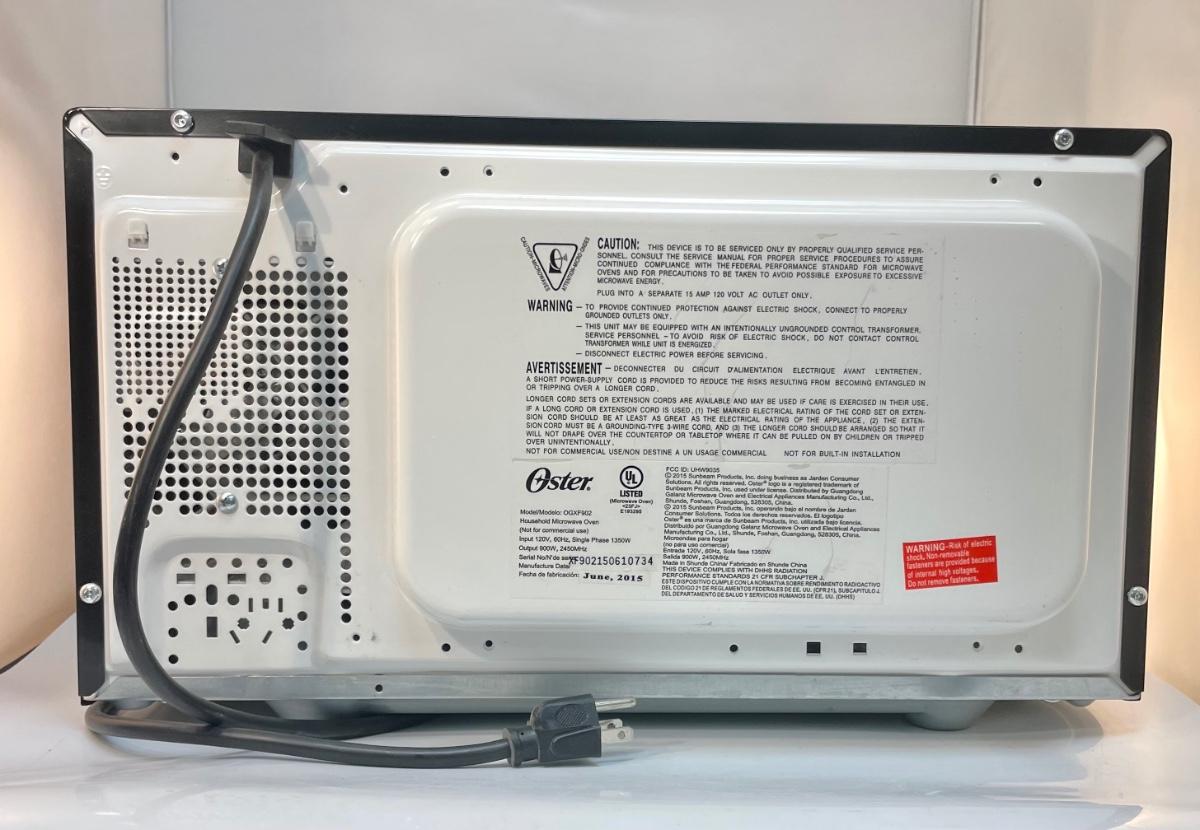 Oster 900 watt microwave oven. From 2015, model OGXF902. Very good used condition, excellent for apartment or dorm.