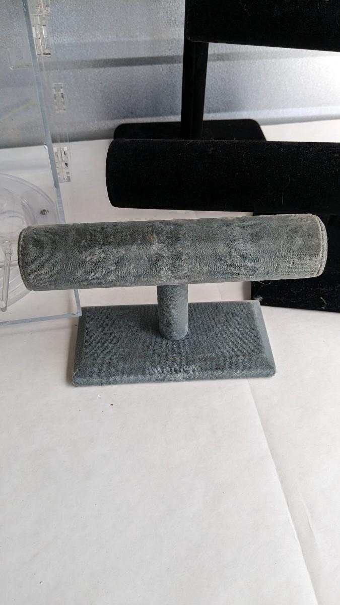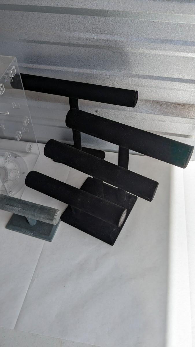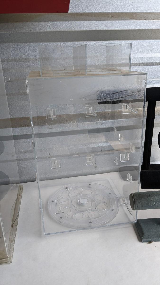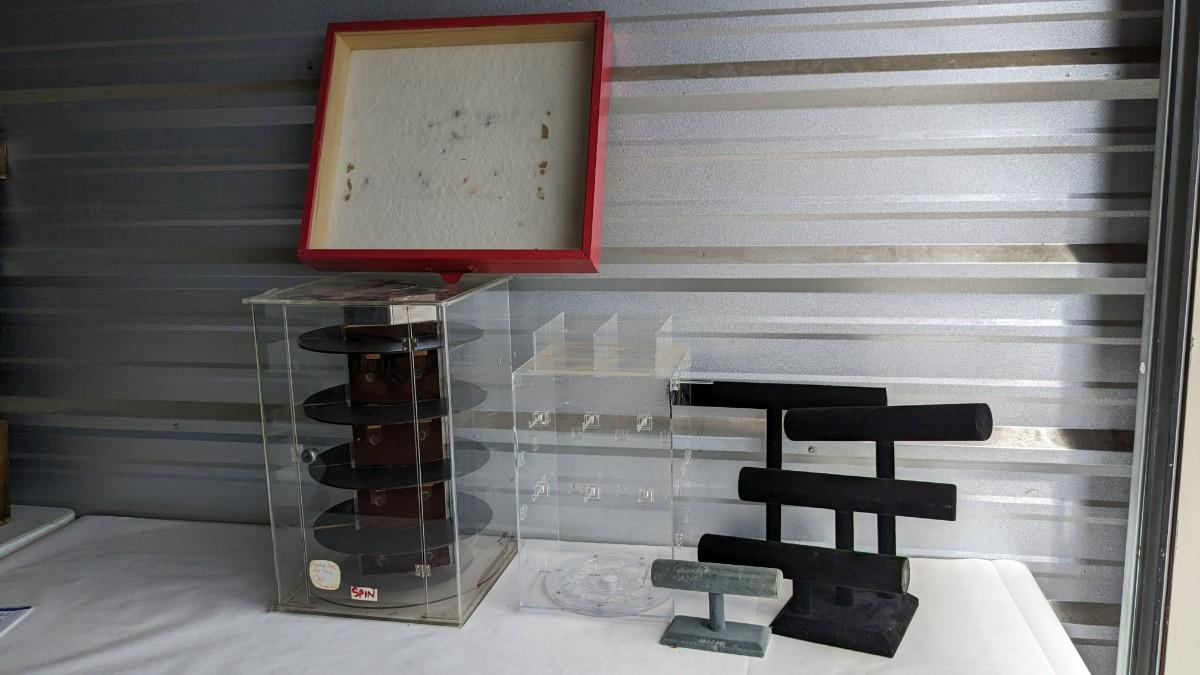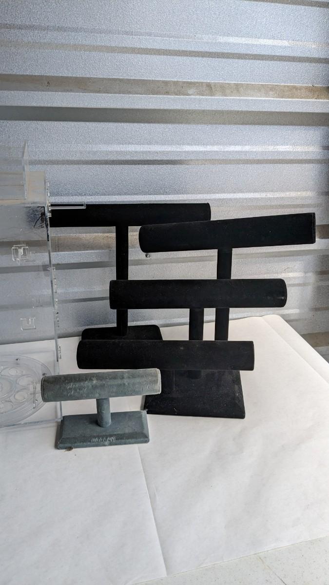 2 plastic countertop displays, one locking without key and a sterling ring caught inside, the other with interchangeable arms and divider on top, both swivel. 3 bracelet/necklace bars, one is multi-tiered with loose arms. as well as drawer turned display, no lock but you could easily place one on there. No shipping. 2616