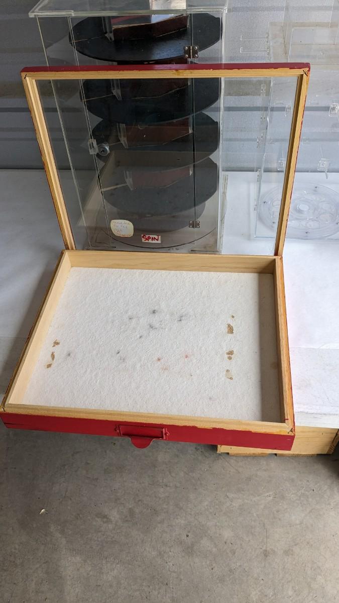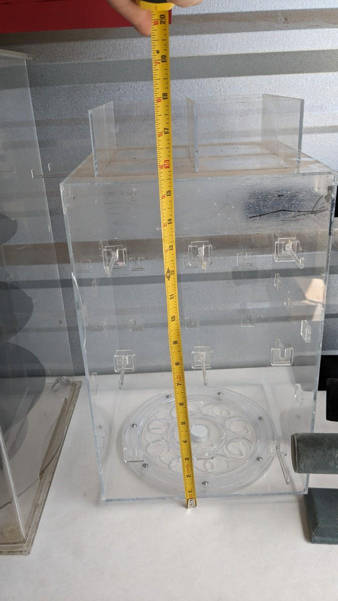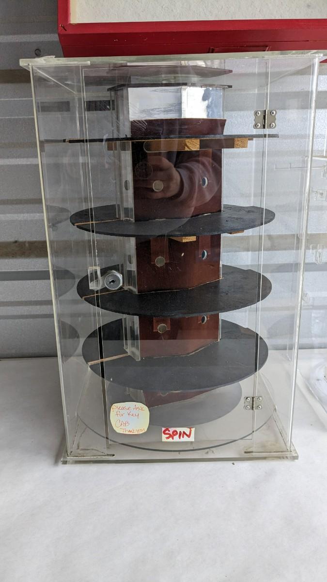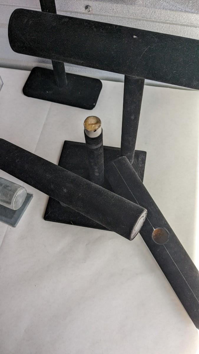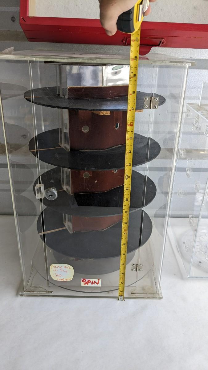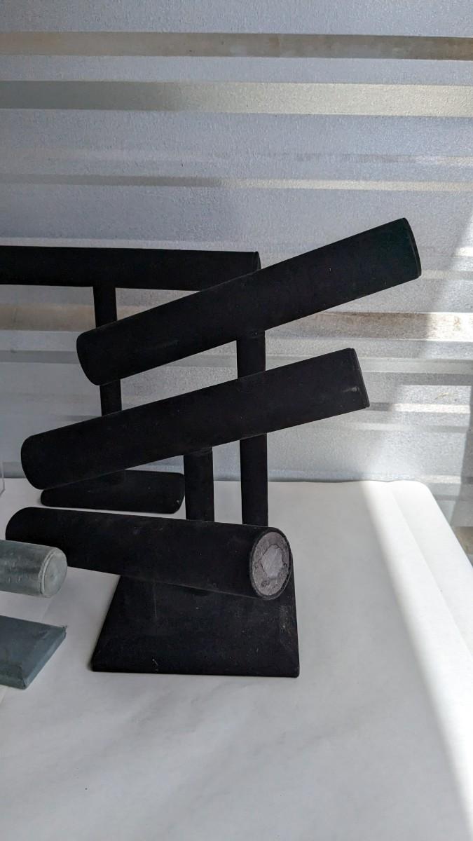 2 plastic countertop displays, one locking without key and a sterling ring caught inside, the other with interchangeable arms and divider on top, both swivel. 3 bracelet/necklace bars, one is multi-tiered with loose arms. as well as drawer turned display, no lock but you could easily place one on there. No shipping. 2616
