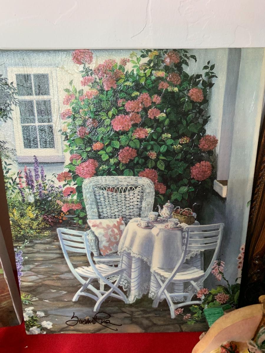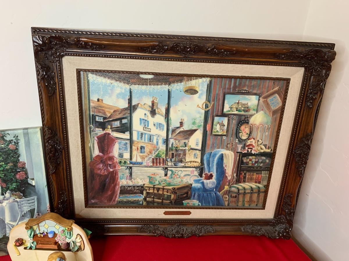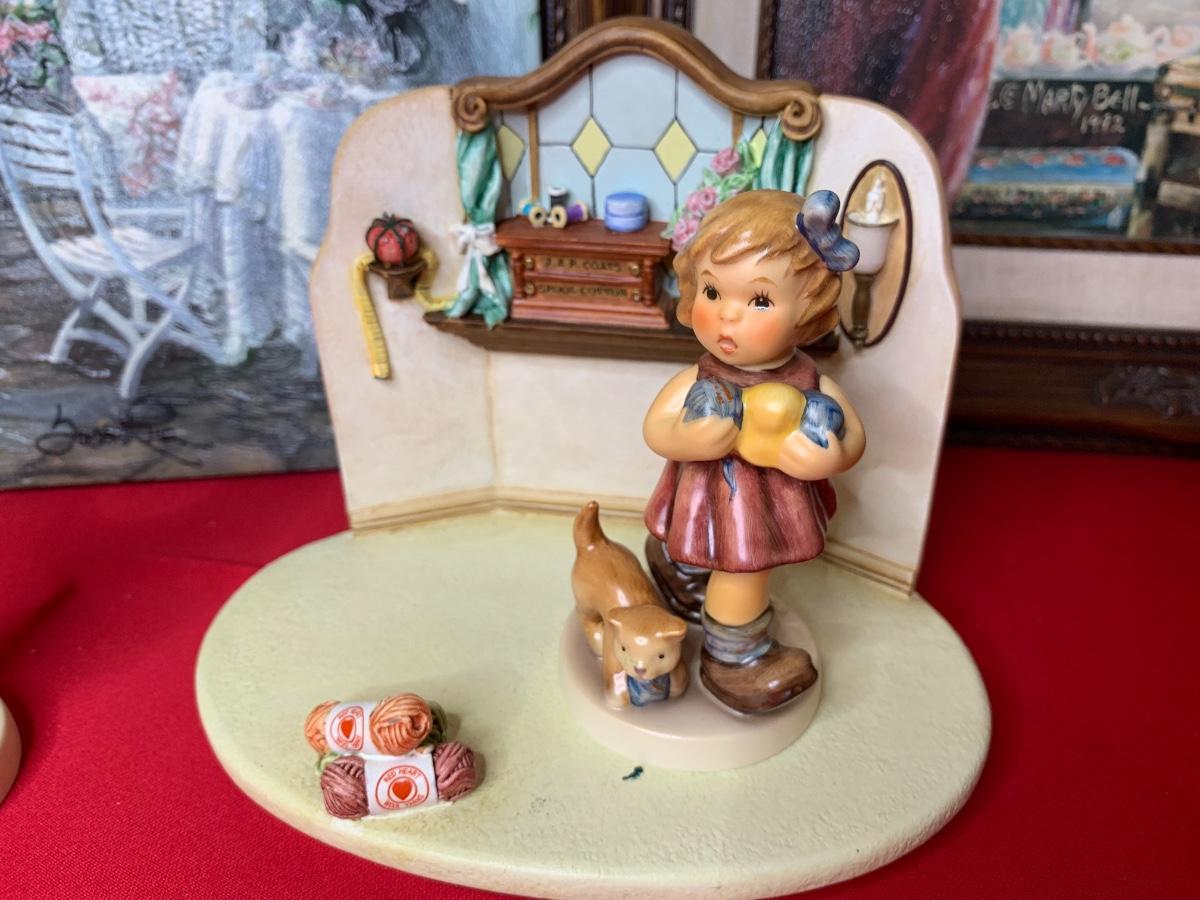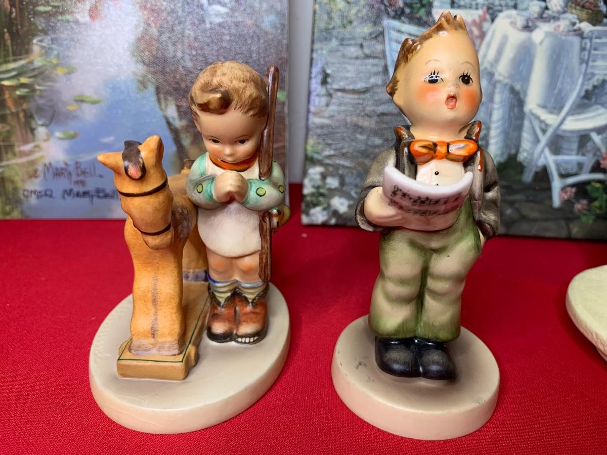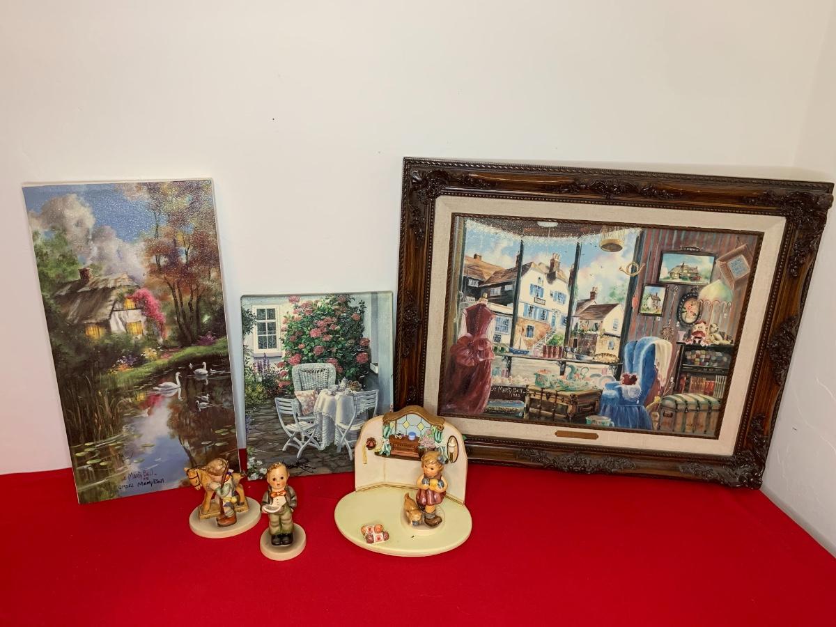 Lot includes two Marty Bells, one small art on canvas of tea in the garden, signed. Also 4 Hummel pieces. Large art measures 21” x 18”