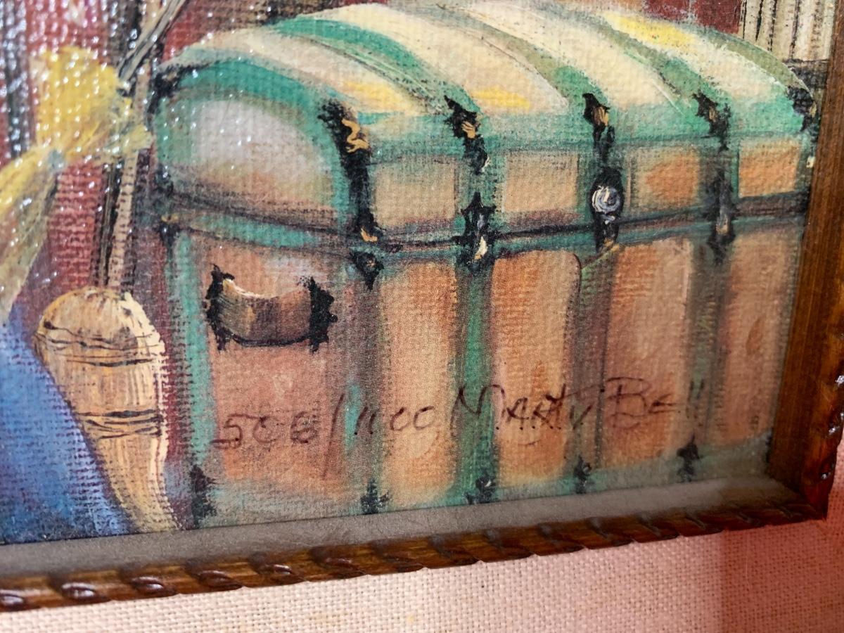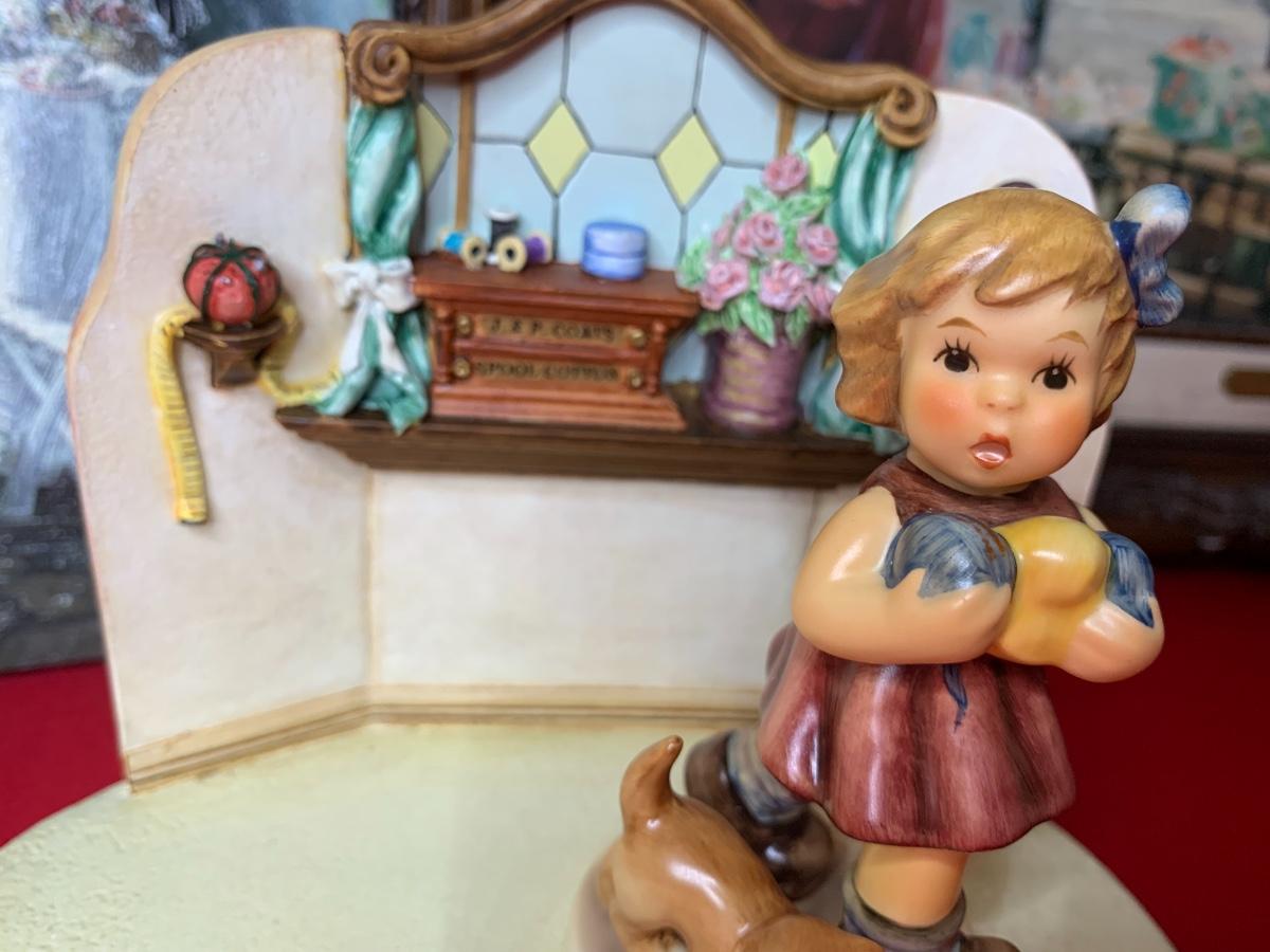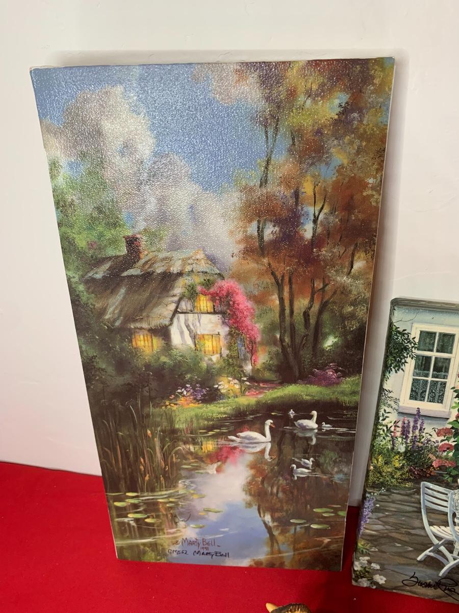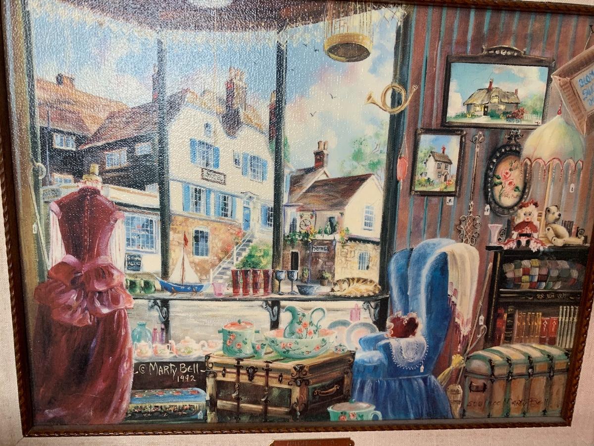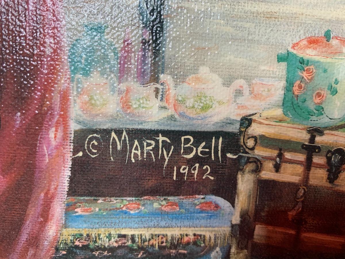 Lot includes two Marty Bells, one small art on canvas of tea in the garden, signed. Also 4 Hummel pieces. Large art measures 21” x 18”
