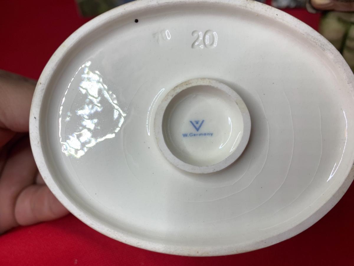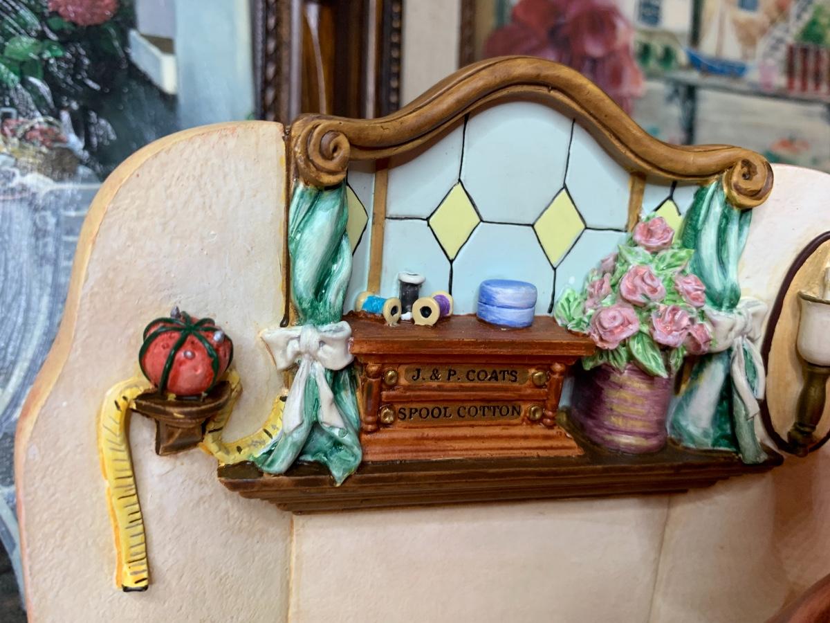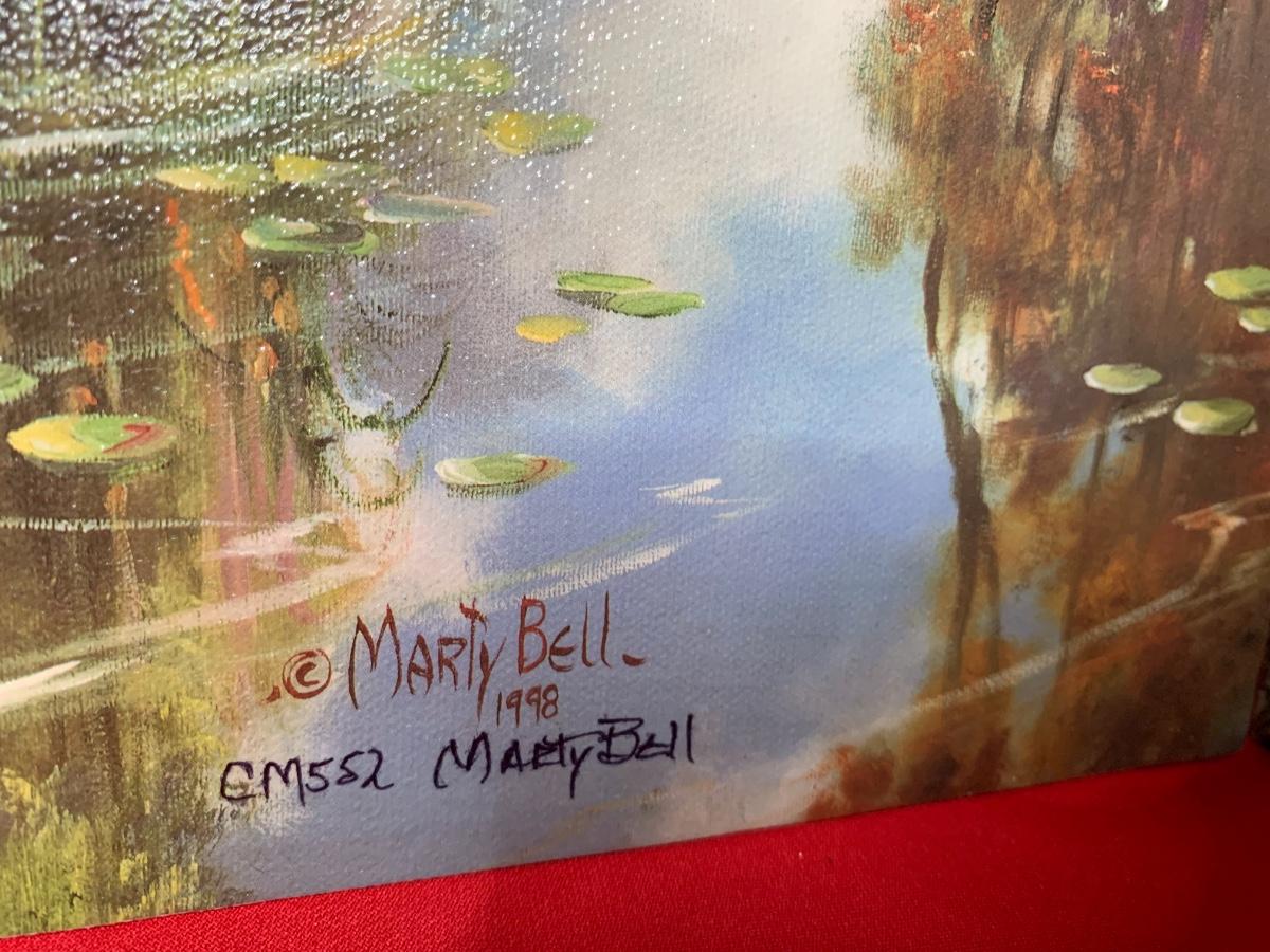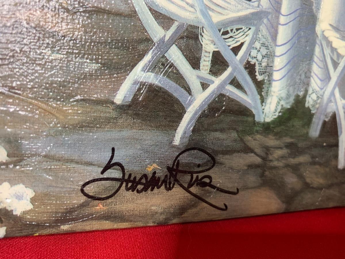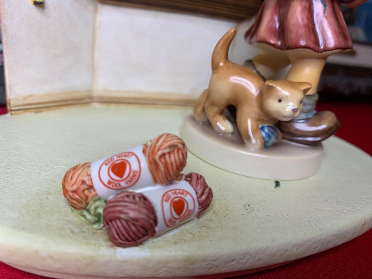 Lot includes two Marty Bells, one small art on canvas of tea in the garden, signed. Also 4 Hummel pieces. Large art measures 21” x 18”