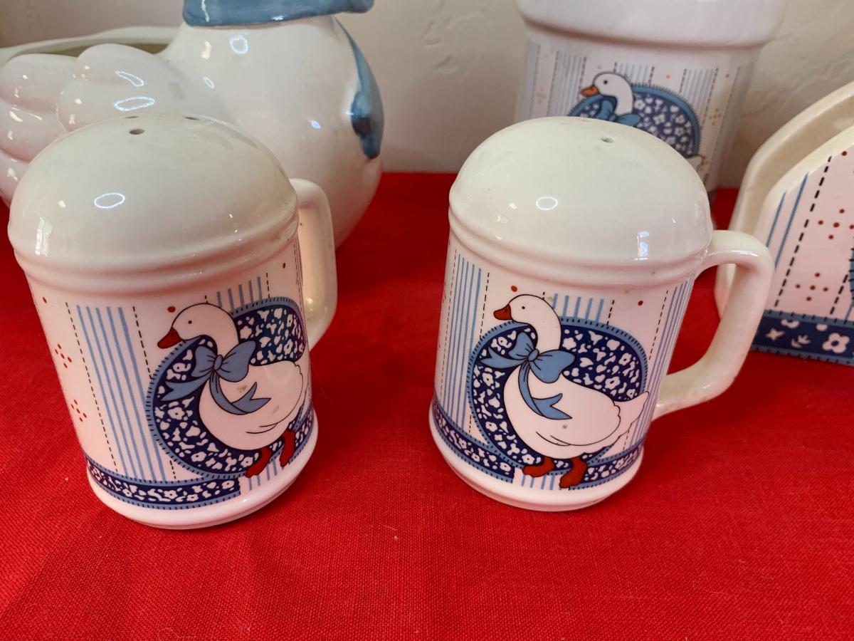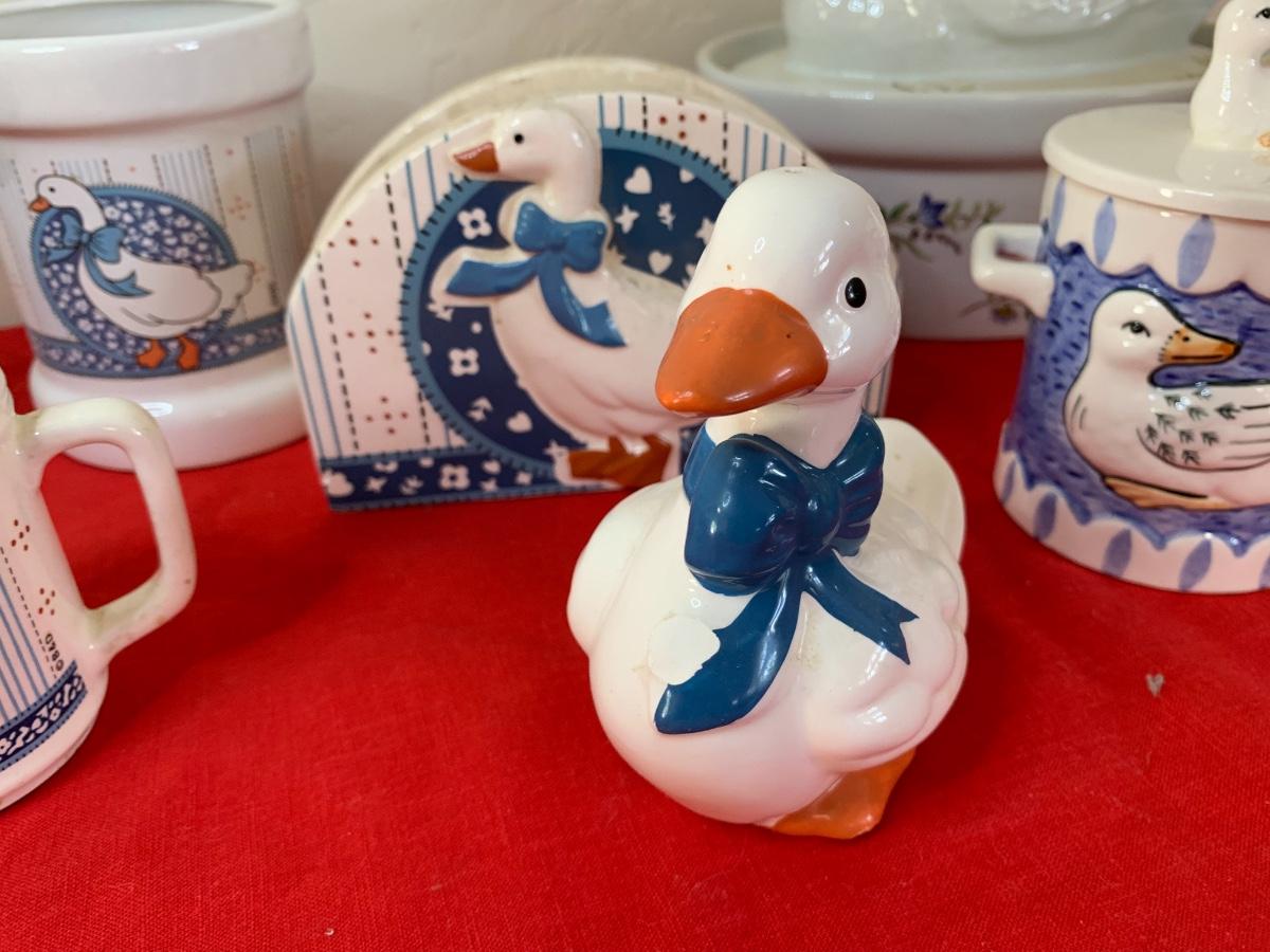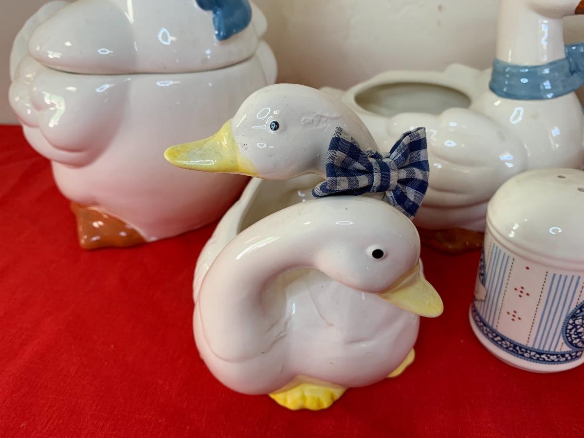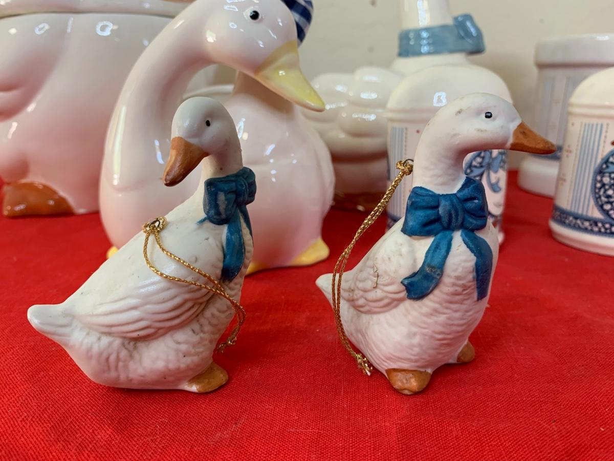 Lot includes one large duck cookie jar (cracked down the breast plate), salt and pepper shakers, napkin holder, butter knife, ornaments and more!