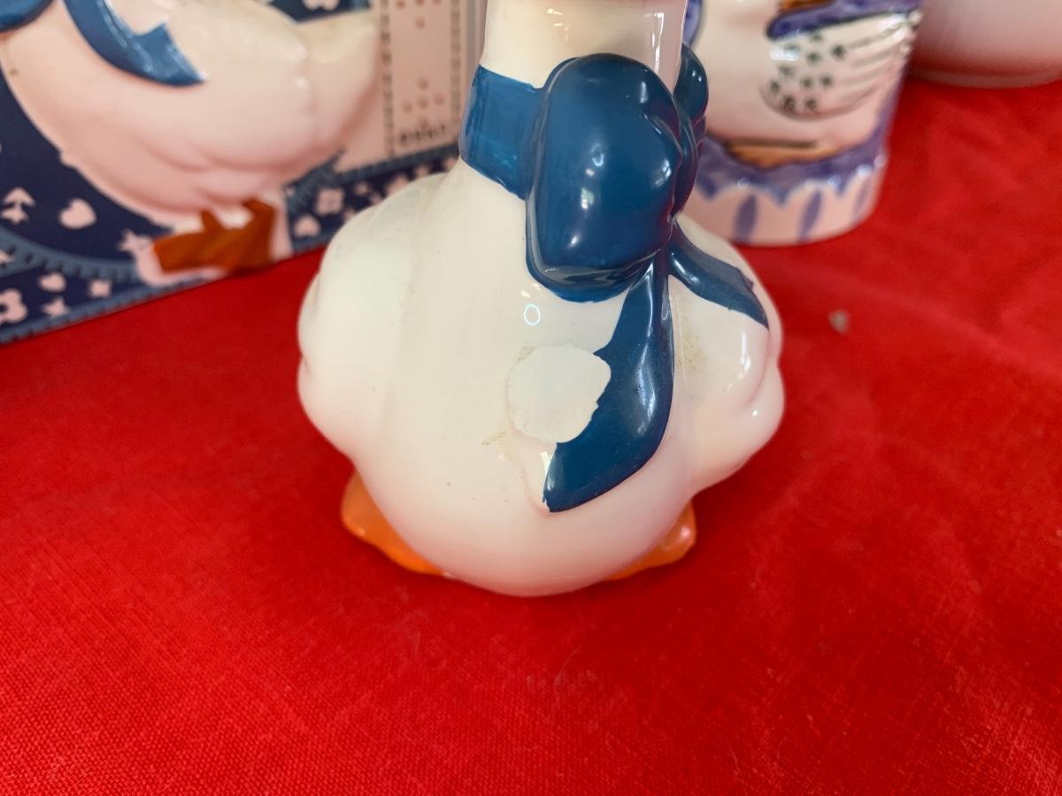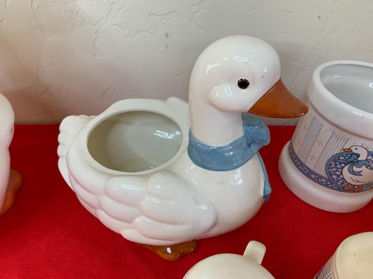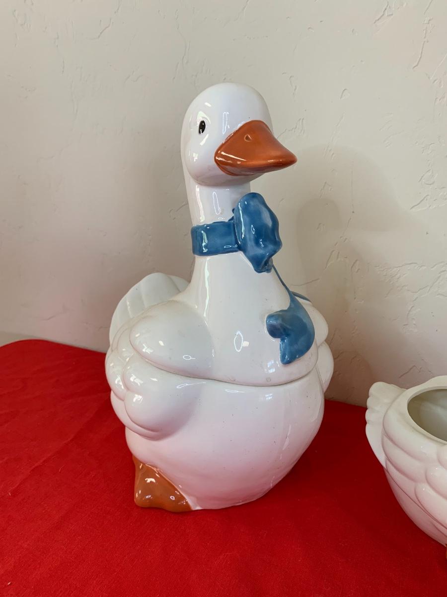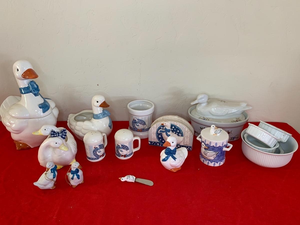 Lot includes one large duck cookie jar (cracked down the breast plate), salt and pepper shakers, napkin holder, butter knife, ornaments and more!